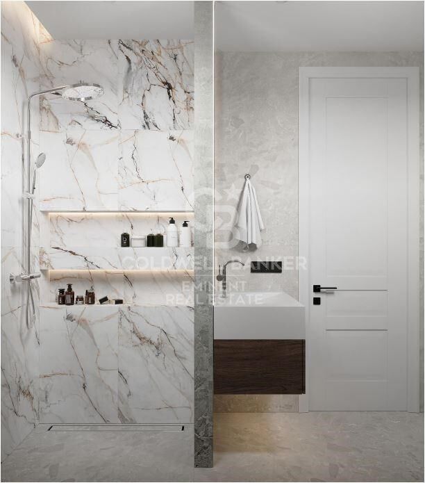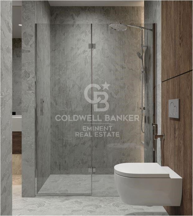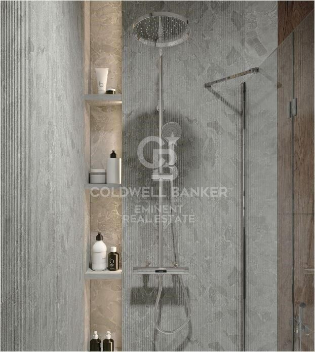The materials used in the renovation further elevate the level of the property. The natural oak parquet flooring adds warmth to the spaces, while the original hydraulic flooring, carefully restored in the entrance and hallway, preserves the historic character of the estate. The bathrooms are covered with Italian porcelain and the property incorporates custom-made integrated furniture, as well as a fully equipped kitchen with Bosch appliances.