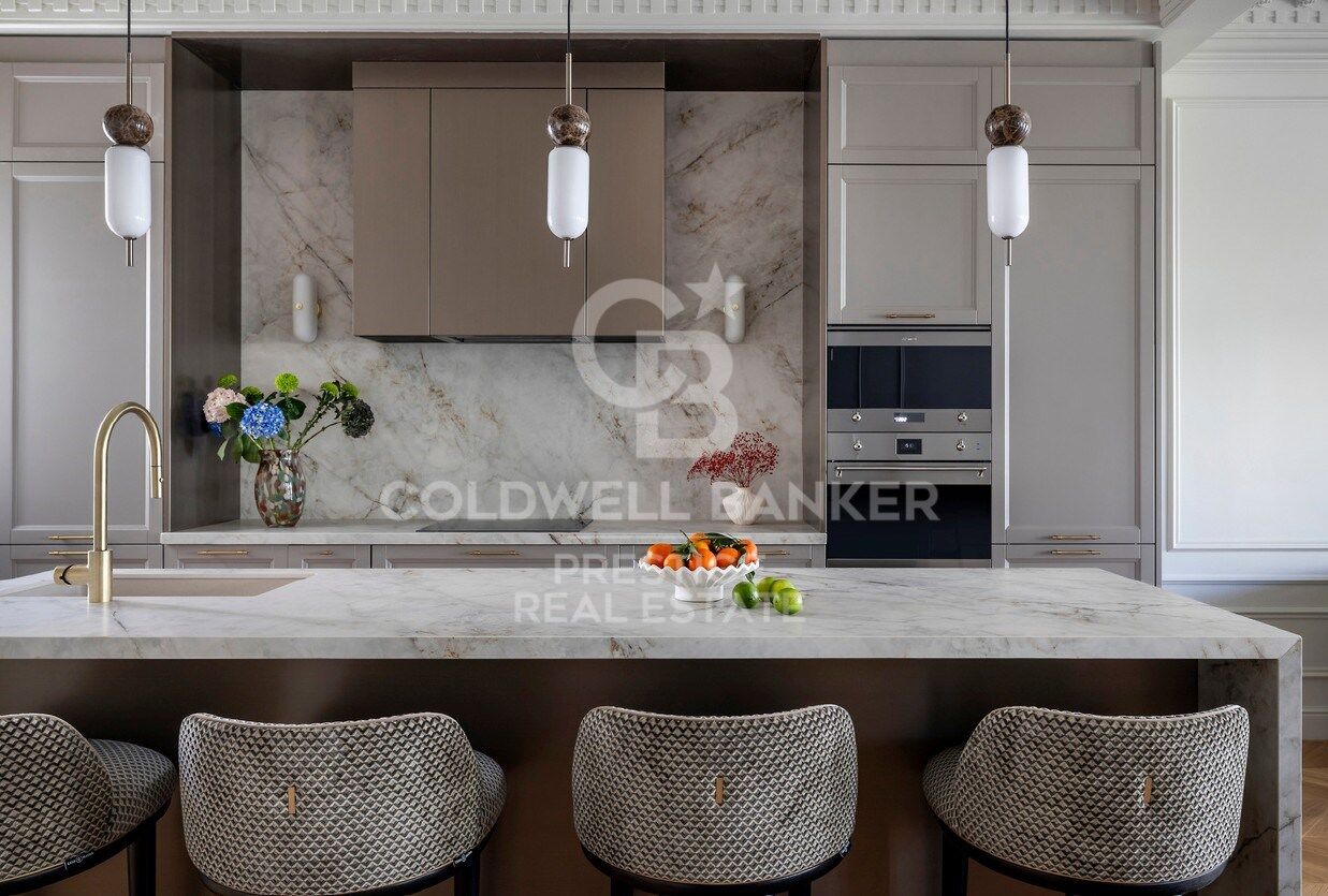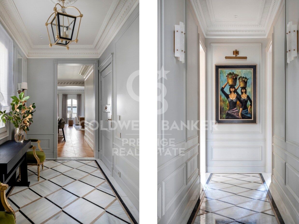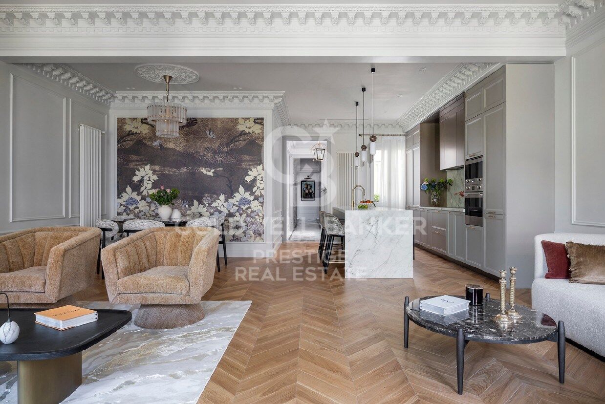 The day area offers a spacious open-plan living area of over 60 sqm with living room, dining room and integrated kitchen, with open views towards Passeig de Gràcia and the Hotel Majestic. An elegant, bright and highly functional space.