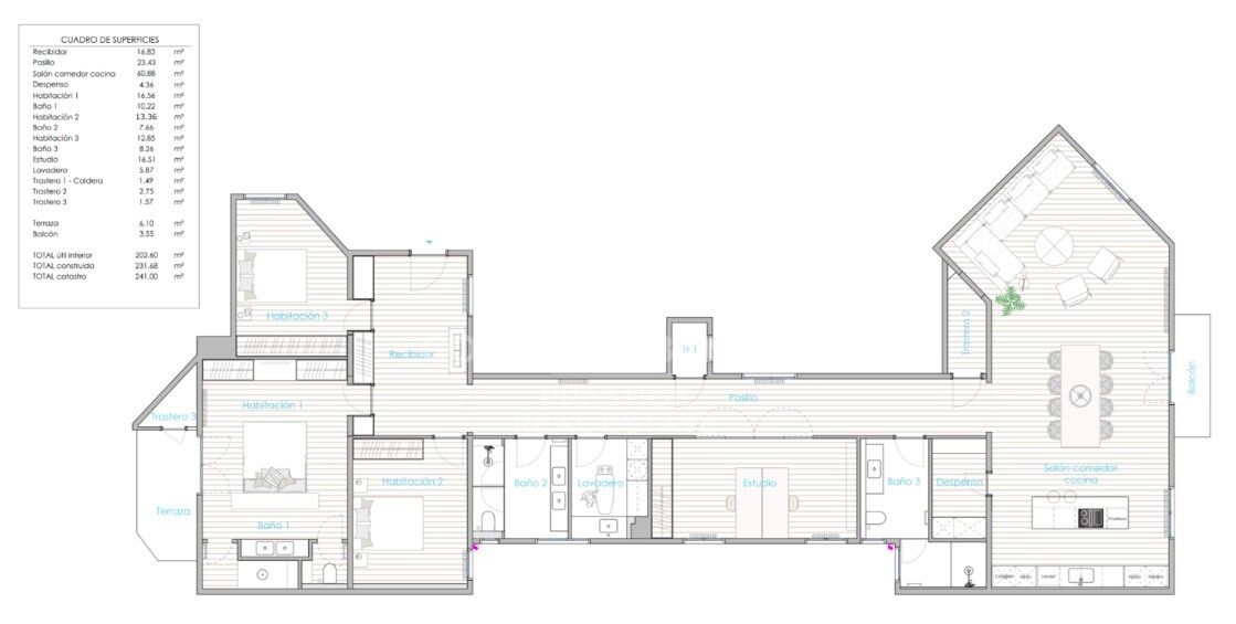 The property stands out for its spaciousness, natural light, and functional layout: a 61m² living-dining room with integrated kitchen, a master suite with walk-in closet, private bathroom, and its own terrace, plus three double bedrooms. The apartment also includes two additional full bathrooms, a study, a storage room, and a separate laundry area.