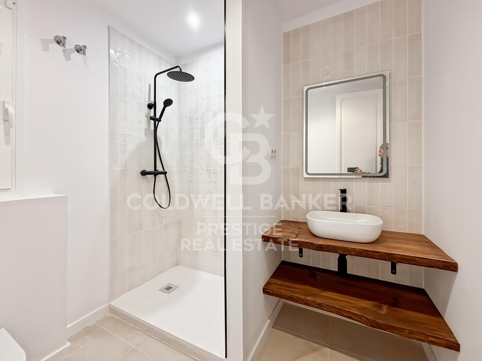 The property offers approx. 80 m² (data shown: 83 m² built / 77 m² usable) with an elegant, practical layout: a bright living-dining area with a large window overlooking Passeig de Sant Joan, an open-plan kitchen with a traditional Catalan vault, 3 rooms (including a main suite with en-suite bathroom, a second bedroom and a home office that can work as a third bedroom) and 2 full bathrooms. Two internal patios provide natural light, cross-ventilation and a lovely sense of space.