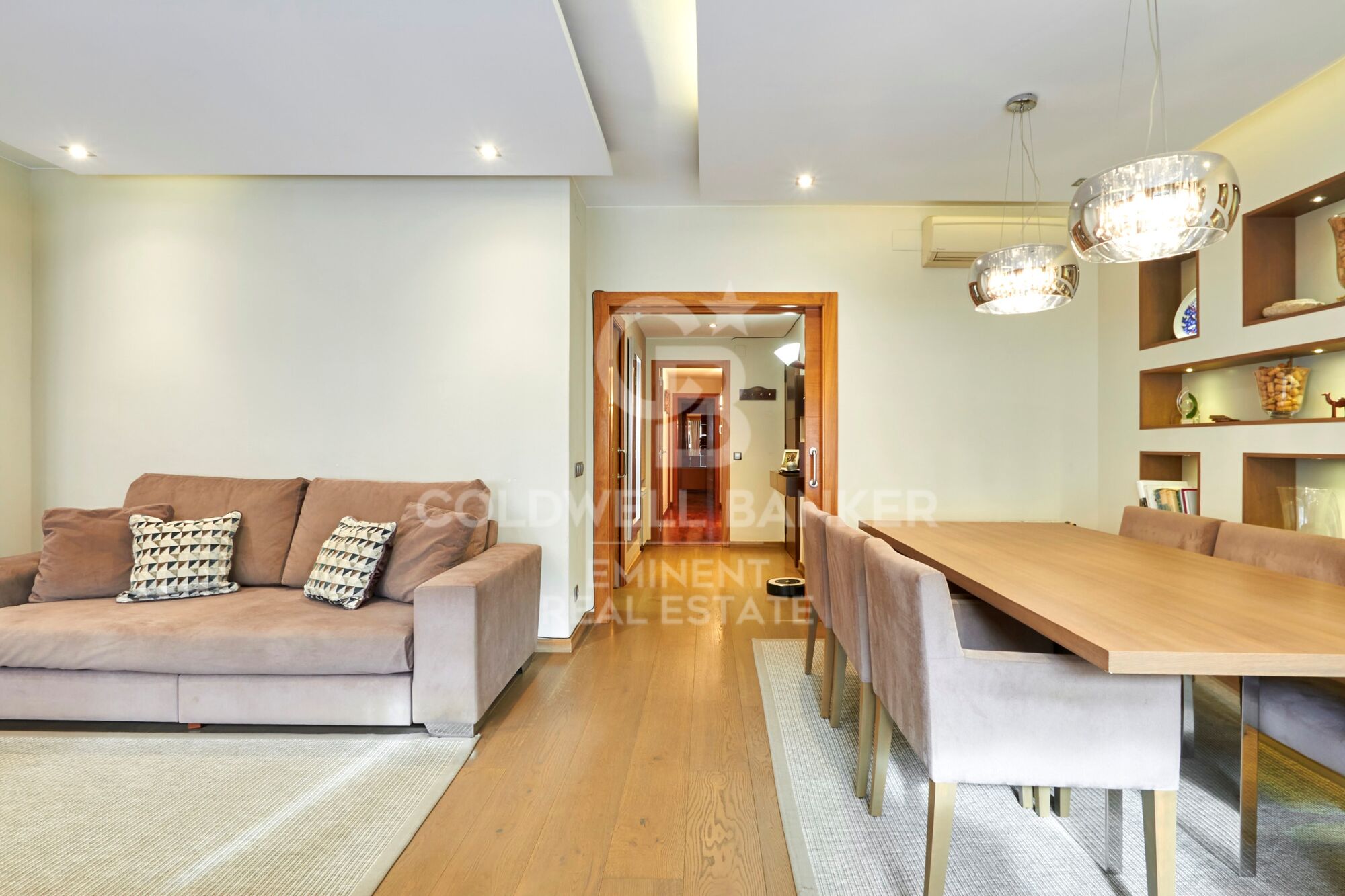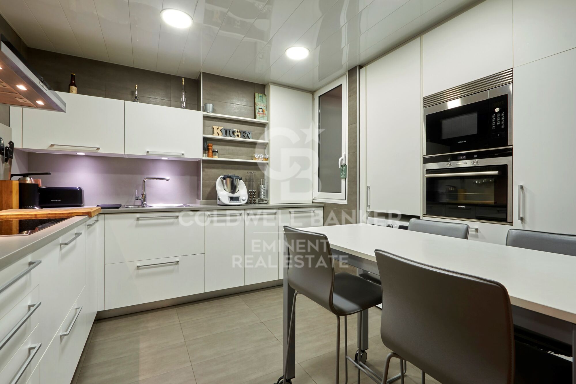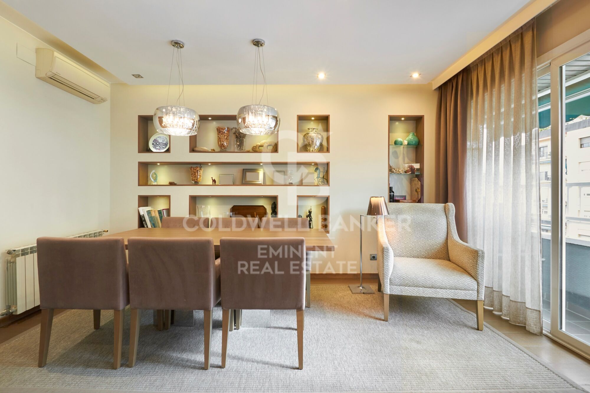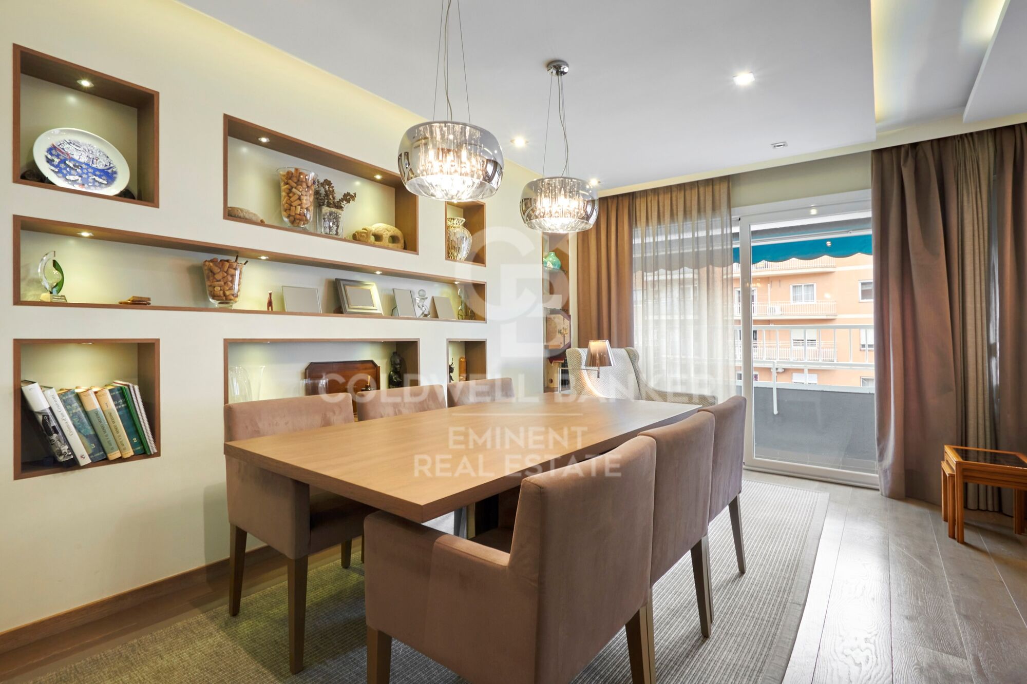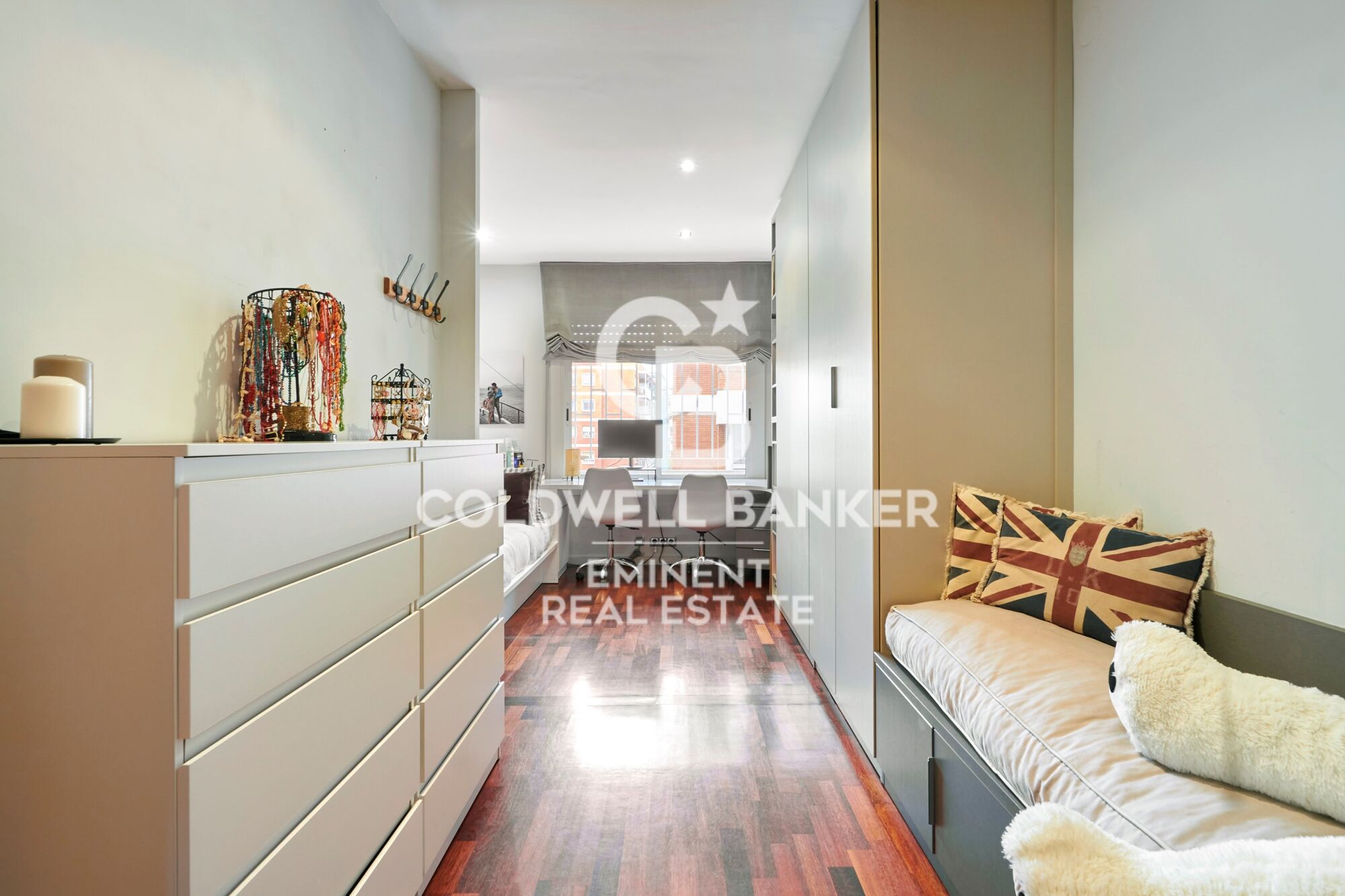 For sale exclusive property totally refurbished in Pedralbes, distributed in a whole floor of the building, for a total of 274m2 with 14m2 of private terrace, 5 bedrooms and 5 bathrooms. Entering the property through a luminous entrance hall, we arrive at an incredible living-dining room of almost 70m2, with large restored wooden windows that dominate the room. The elegant sliding glass doors that separate the spacious living room from the covered terrace not only allow light to enter every corner, but also display an exquisite design of lacquered iron in perfect harmony with the wall. This detail adds a touch of continuity and spaciousness, subtly blending the spaces together. The kitchen features a high-end furniture ensemble, ensuring not only an aesthetic and elegant design, but also a level of durability and functionality that exceeds the highest expectations. The presence of an island in the centre adds a modern and elegant touch, providing a more comfortable and functional space. On the other hand, the office offers a bright and serene environment, harmoniously complementing the kitchen space. Furthermore, to enrich the service area, the laundry room is presented as a practical and functional space. The night area, with a total of four spacious and meticulously designed bedrooms, offers a unique experience of rest and comfort. Two en-suite bedrooms provide an oasis of privacy and comfort, while the two single bedrooms share a full bathroom. Every detail of this home reflects a commitment to excellence: from the parquet flooring, to the minimalist folding doors and lacquered wardrobes. This design achieves a harmonious fusion of elements that generate an enveloping effect, accompanied by sensory lighting, thus providing a distinctive touch of tactile softness, practicality and style. The finishes are of the highest quality, with a comfortable, avant-garde and functional design, and the installations are based on energy efficiency. A project designed to enjoy a home in keeping with its location and status. Discover Pedralbes, one of the most exclusive neighbourhoods in Barcelona, where luxury and tranquillity merge in a privileged environment. With its elegant avenues, impressive mansions and lush gardens, Pedralbes offers a sophisticated and serene lifestyle. Enjoy proximity to prestigious international schools, high-end boutiques and green spaces, all while immersing yourself in the culture and history of the city. Living in Pedralbes is synonymous with distinction and comfort, a place where every day becomes a unique experience. Included in the price are 3 parking spaces (2 indoor and 1 outdoor). Do not hesitate to contact us for more information or to arrange a viewing! #ref:CBES2366