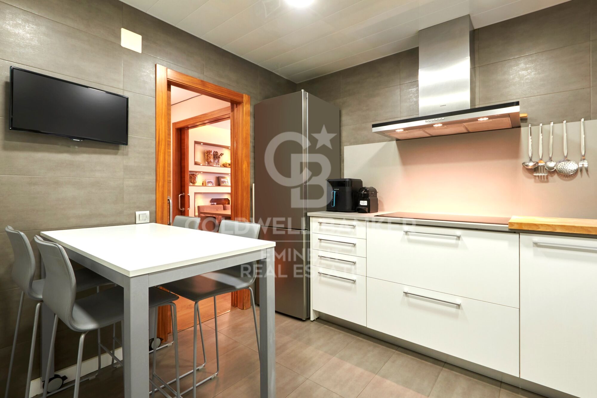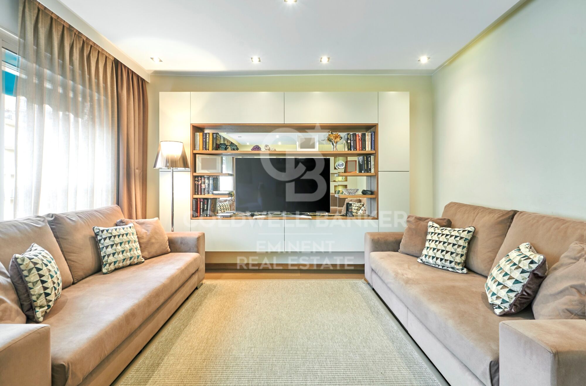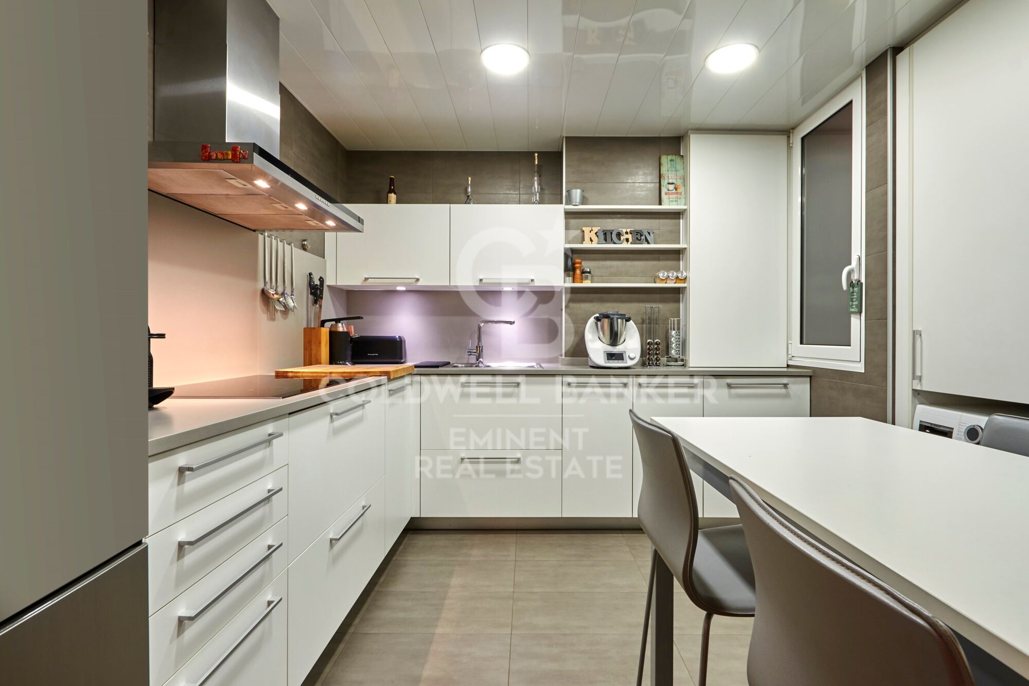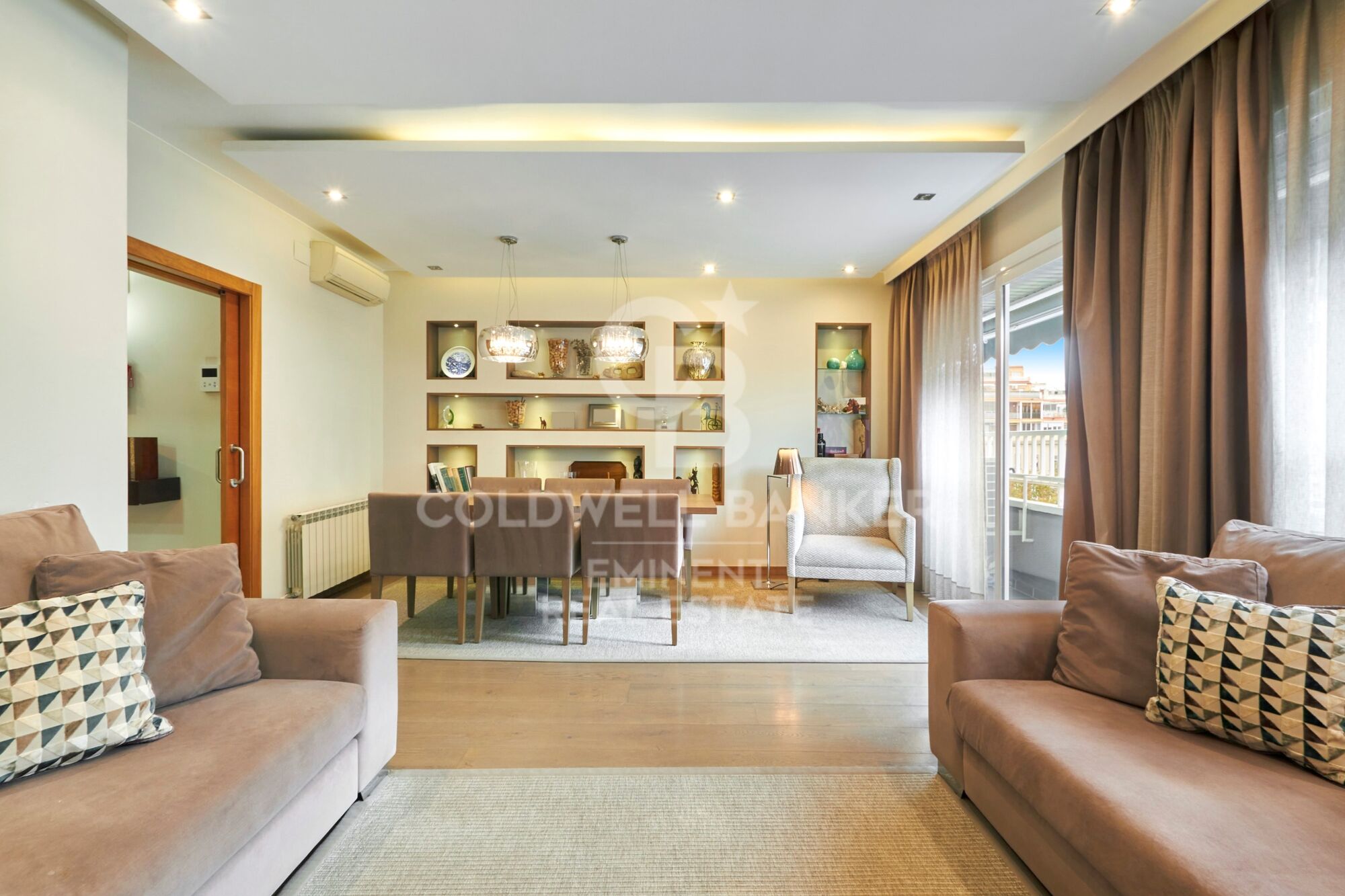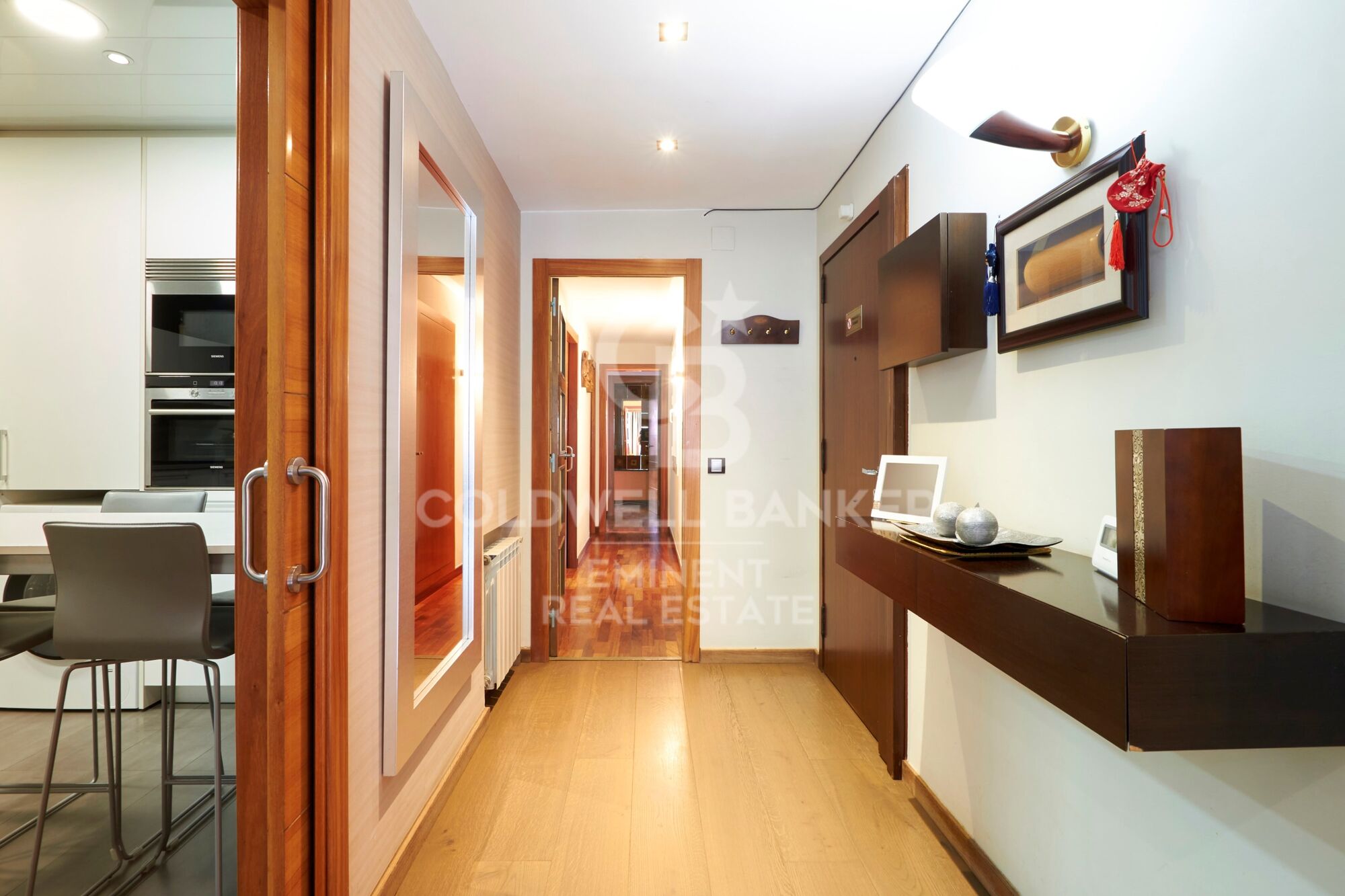 For sale exclusive property totally refurbished in Pedralbes, distributed in a whole floor of the building, for a total of 274m2 with 14m2 of private terrace, 5 bedrooms and 5 bathrooms. Entering the property through a luminous entrance hall, we arrive at an incredible living-dining room of almost 70m2, with large restored wooden windows that dominate the room. The elegant sliding glass doors that separate the spacious living room from the covered terrace not only allow light to enter every corner, but also display an exquisite design of lacquered iron in perfect harmony with the wall. This detail adds a touch of continuity and spaciousness, subtly blending the spaces together. The kitchen features a high-end furniture ensemble, ensuring not only an aesthetic and elegant design, but also a level of durability and functionality that exceeds the highest expectations. The presence of an island in the centre adds a modern and elegant touch, providing a more comfortable and functional space. On the other hand, the office offers a bright and serene environment, harmoniously complementing the kitchen space. Furthermore, to enrich the service area, the laundry room is presented as a practical and functional space. The night area, with a total of four spacious and meticulously designed bedrooms, offers a unique experience of rest and comfort. Two en-suite bedrooms provide an oasis of privacy and comfort, while the two single bedrooms share a full bathroom. Every detail of this home reflects a commitment to excellence: from the parquet flooring, to the minimalist folding doors and lacquered wardrobes. This design achieves a harmonious fusion of elements that generate an enveloping effect, accompanied by sensory lighting, thus providing a distinctive touch of tactile softness, practicality and style. The finishes are of the highest quality, with a comfortable, avant-garde and functional design, and the installations are based on energy efficiency. A project designed to enjoy a home in keeping with its location and status. Discover Pedralbes, one of the most exclusive neighbourhoods in Barcelona, where luxury and tranquillity merge in a privileged environment. With its elegant avenues, impressive mansions and lush gardens, Pedralbes offers a sophisticated and serene lifestyle. Enjoy proximity to prestigious international schools, high-end boutiques and green spaces, all while immersing yourself in the culture and history of the city. Living in Pedralbes is synonymous with distinction and comfort, a place where every day becomes a unique experience. Included in the price are 3 parking spaces (2 indoor and 1 outdoor). Do not hesitate to contact us for more information or to arrange a viewing! #ref:CBES2366
