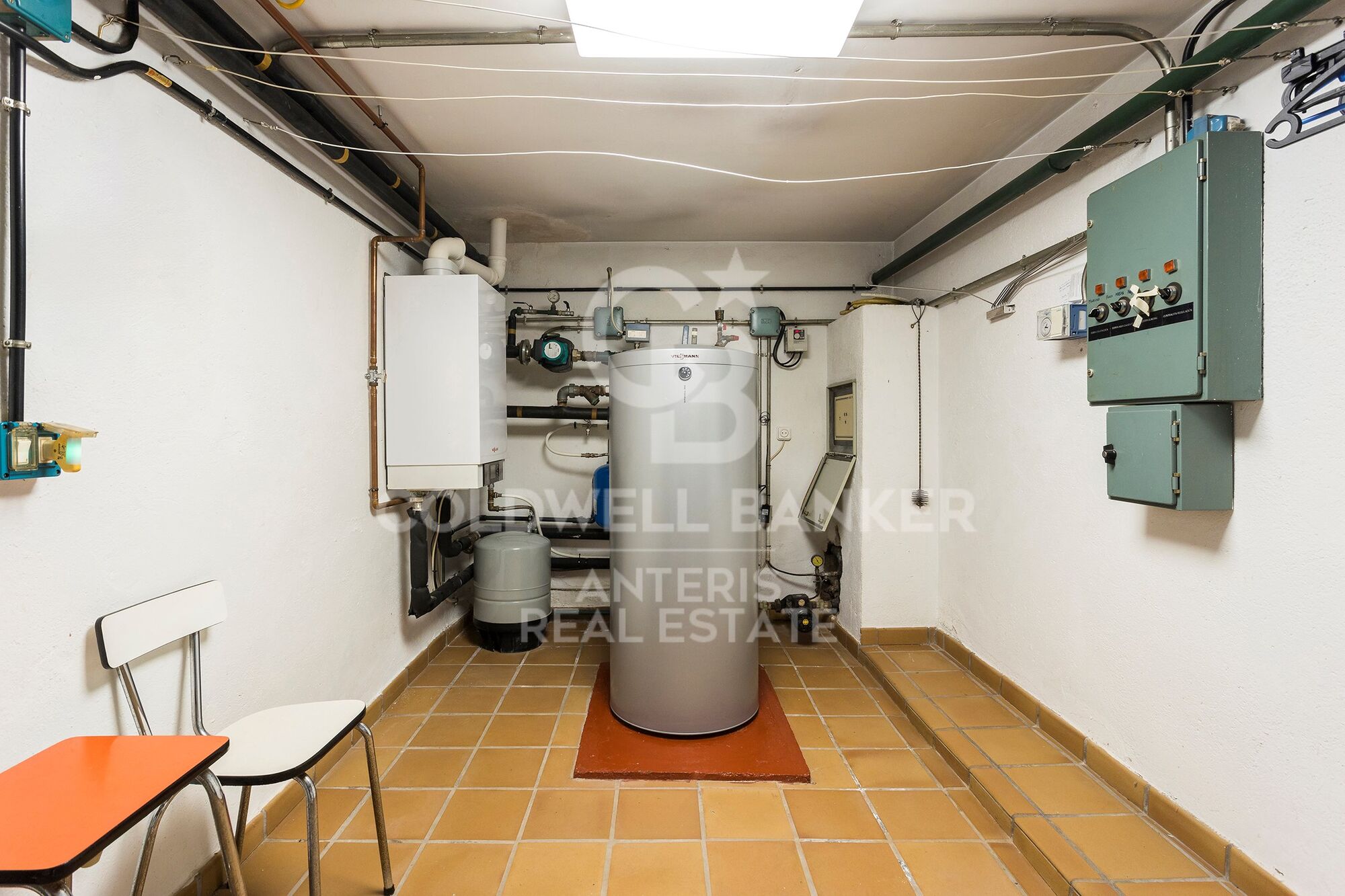 The garage with space for three cars on the lower floor also gives access to a multi-purpose room, machine room and a pantry/cellar.