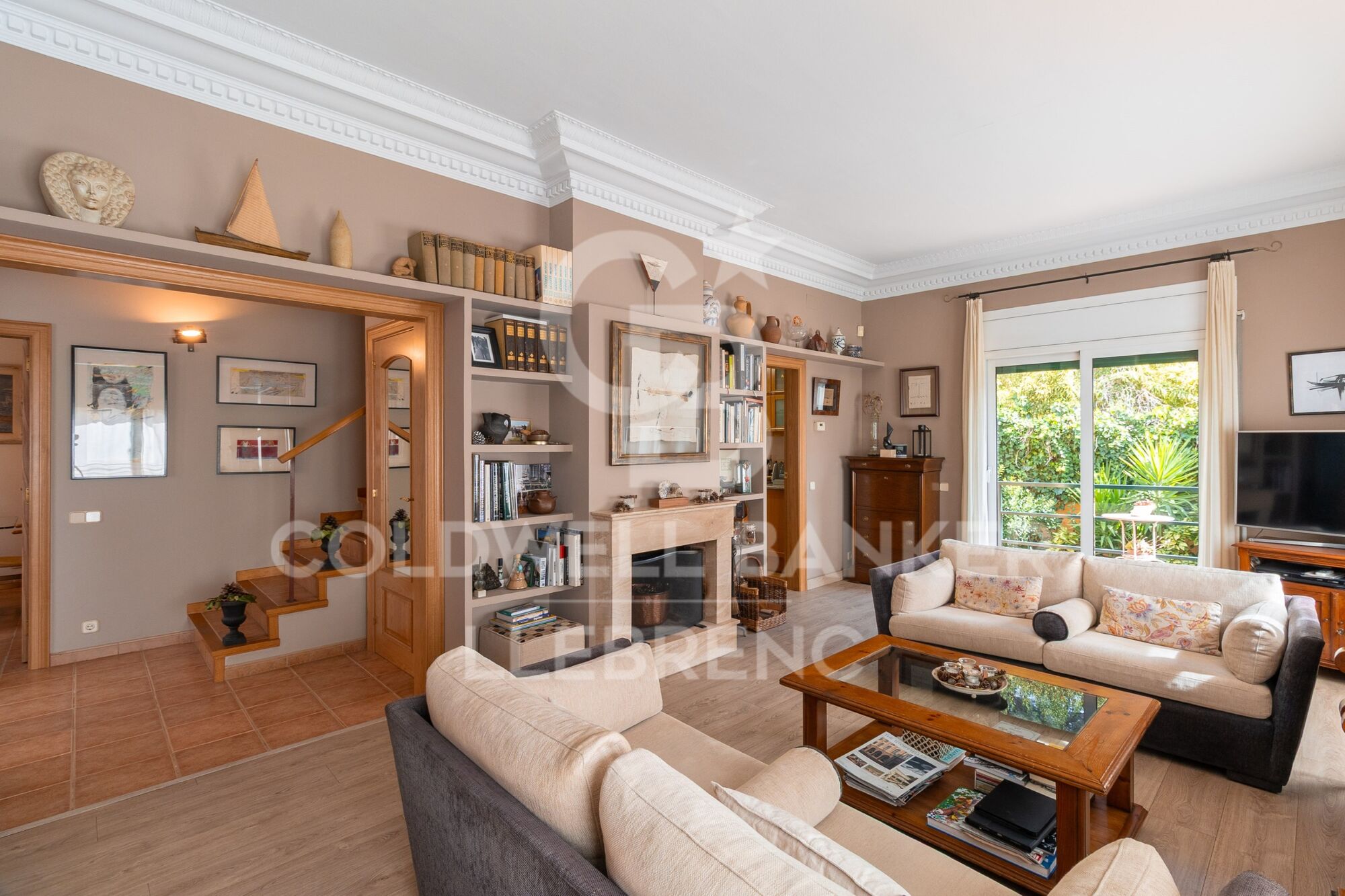The spacious living room with fireplace and three large windows opens directly onto the garden, creating a pleasant continuity between indoor and outdoor. A very bright and welcoming space, ideal for family life or for entertaining.
