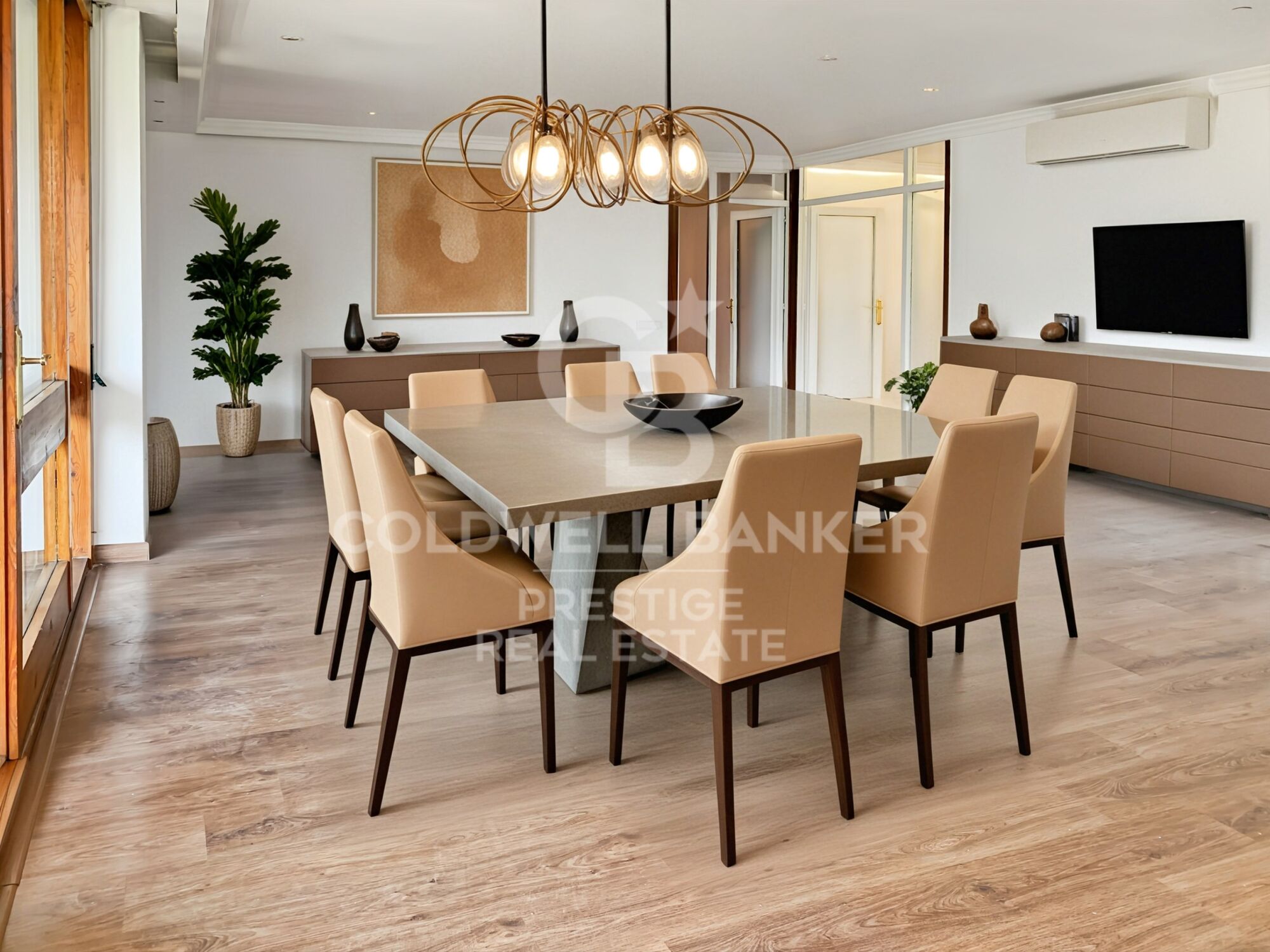 El salón-comedor, de 45 m², es amplio y luminoso, con grandes ventanales y acceso directo a la terraza. Su distribución permite crear distintos ambientes, incluyendo una zona de estar y un espacio de trabajo.