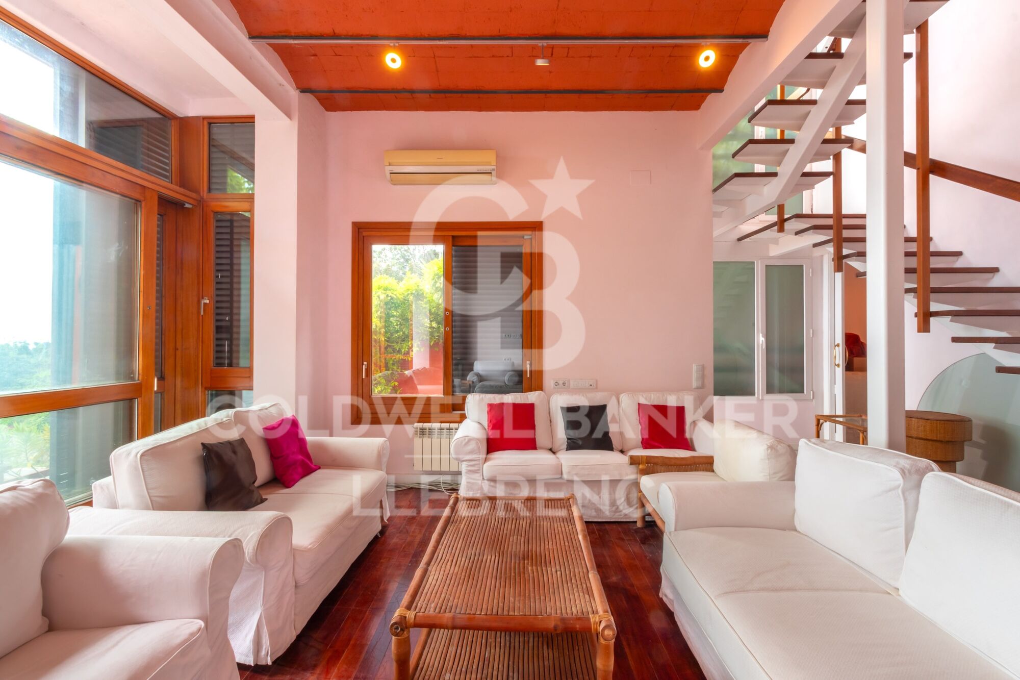 Spectacular contemporary design house in Vallvidrera, designed by architect Norman Cinnamond, built in 2000. The property, located in an exclusive community of 5 houses, offers panoramic views of Barcelona and is close to the city center and Sarrià via the funicular. The house has three floors. On the main floor, a spacious hallway leads to an impressive living-dining room with access to a 90 m² terrace offering panoramic views of Barcelona. The fully equipped kitchen has a pantry and laundry area with a separate entrance. Additionally, on this floor, there is a bedroom with a bathroom, which can be converted into an additional bedroom, and access to the garage with space for two cars from inside the house. On the upper floor, the sleeping area includes two large bedrooms with dressing rooms and full bathrooms, flooded with natural light and incredible city views. On the lower floor, accessible both by stairs from the main floor and by a garden path from the porch, there is a 115 m² summer apartment with dressing room and full bathroom, with independent access. From here, there is direct access to the garden area, swimming pool, utility room, and a small storage room. The house, with a facade clad in natural stone and slate floors on the noble floor and wood on the upper floor, offers a timeless design and high-quality materials. It features radiant heating throughout, ducted air conditioning, and quality exterior closures. We are facing an extraordinary residence, an architectural masterpiece that few will fully appreciate. Designed in a fan shape, this house offers the possibility to enjoy panoramic views from any point, providing a unique perspective in every corner. The large windows, designed with dimensions larger than usual, have been strategically placed on all floors to capture natural light and bathe each space with a unique luminosity. This careful attention to detail ensures a unique experience in every room. The spacious and well-distributed areas fill the house with a sense of comfort and serenity. Combined with the spectacular views it offers, this property becomes a sanctuary of tranquility and well-being, a truly exceptional place that invites relaxation and enjoyment to the fullest. In summary, this property is an exceptional jewel and the ideal choice for those looking to live in an exclusive location with excellent city connections and surrounded by nature. Located in Vallvidrera, an area that boasts the largest natural park in the city of Barcelona, the Collserola mountain range offers the perfect combination of tranquility and proximity to the city. #ref:CB4407LL