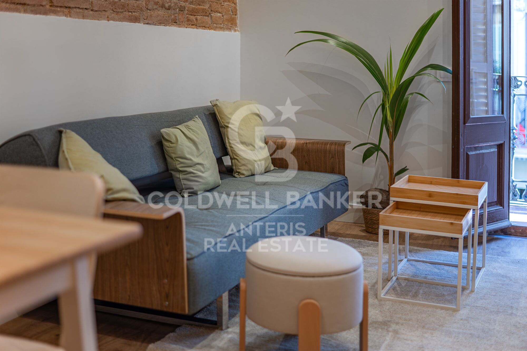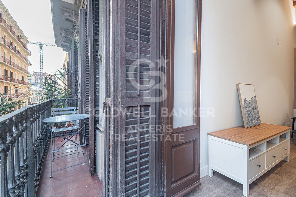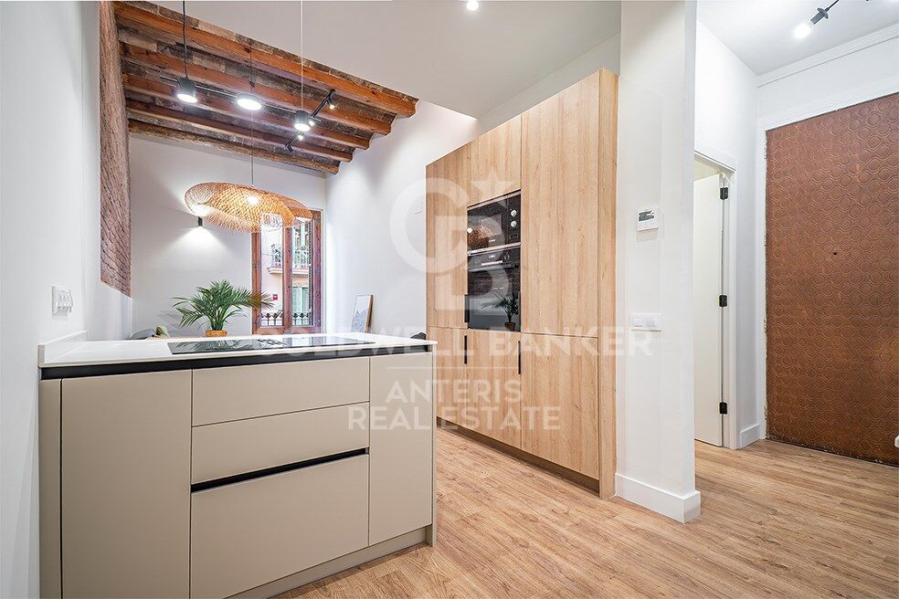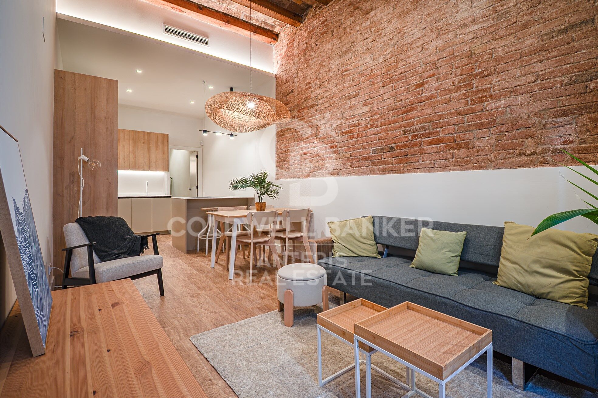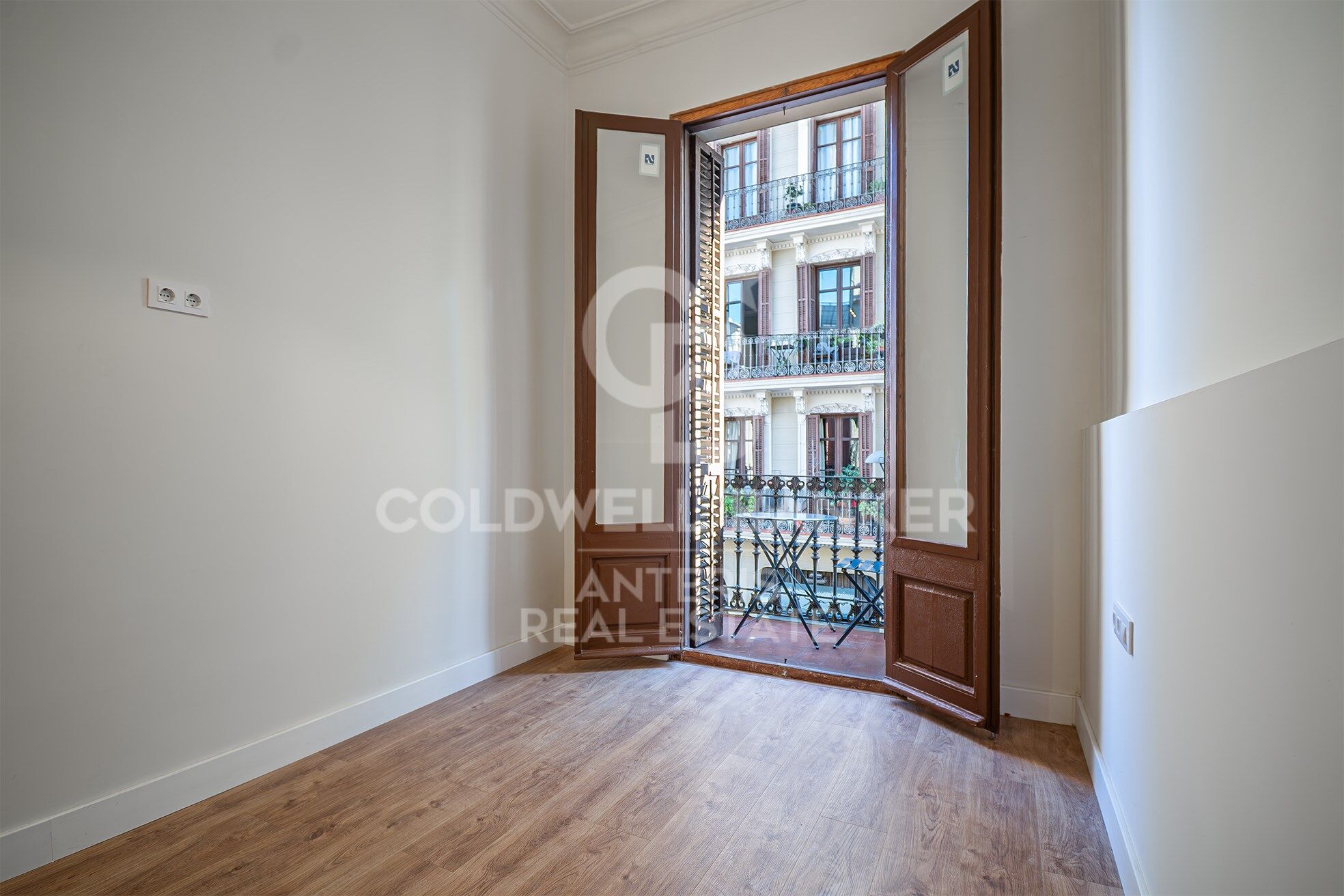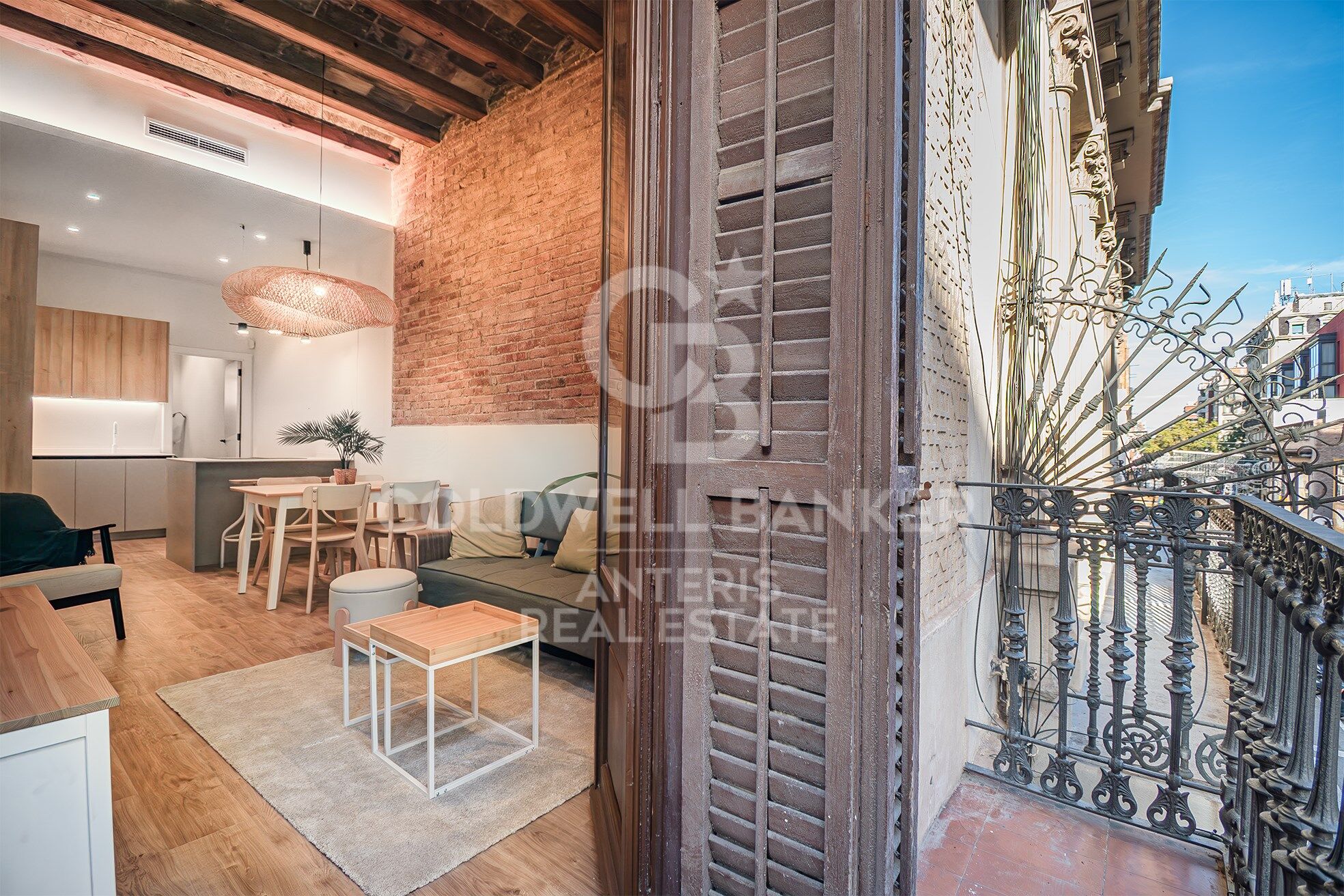 This apartment has been completely renovated and is brand new. It stands out for its excellent layout and for preserving the characteristic features of classic properties, such as high ceilings with moldings, exposed walls, Catalan vaulted ceilings, wooden beams, and a beautiful balcony overlooking the main street.