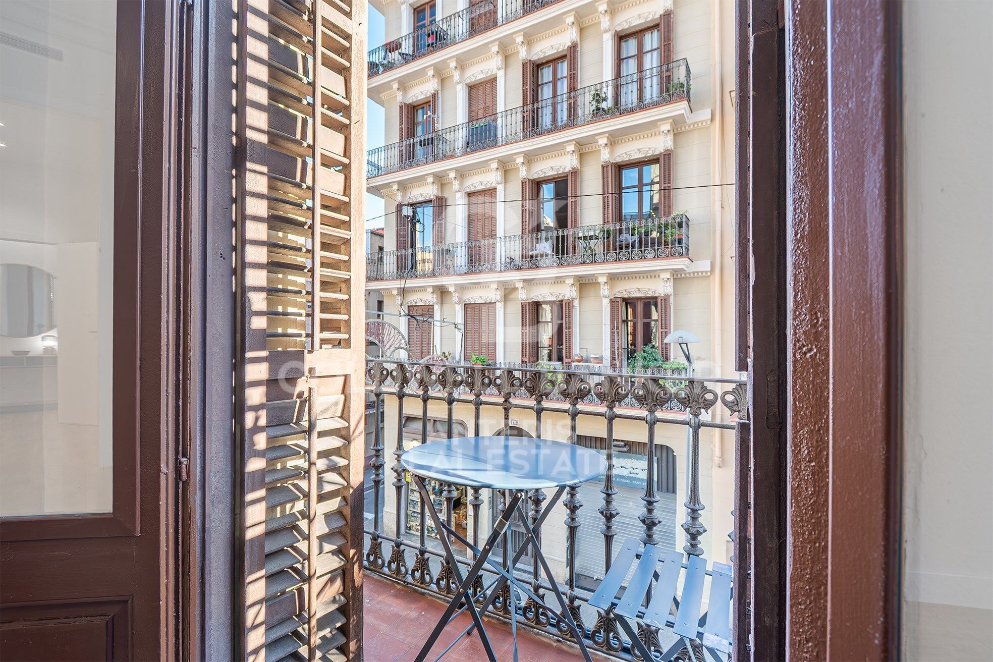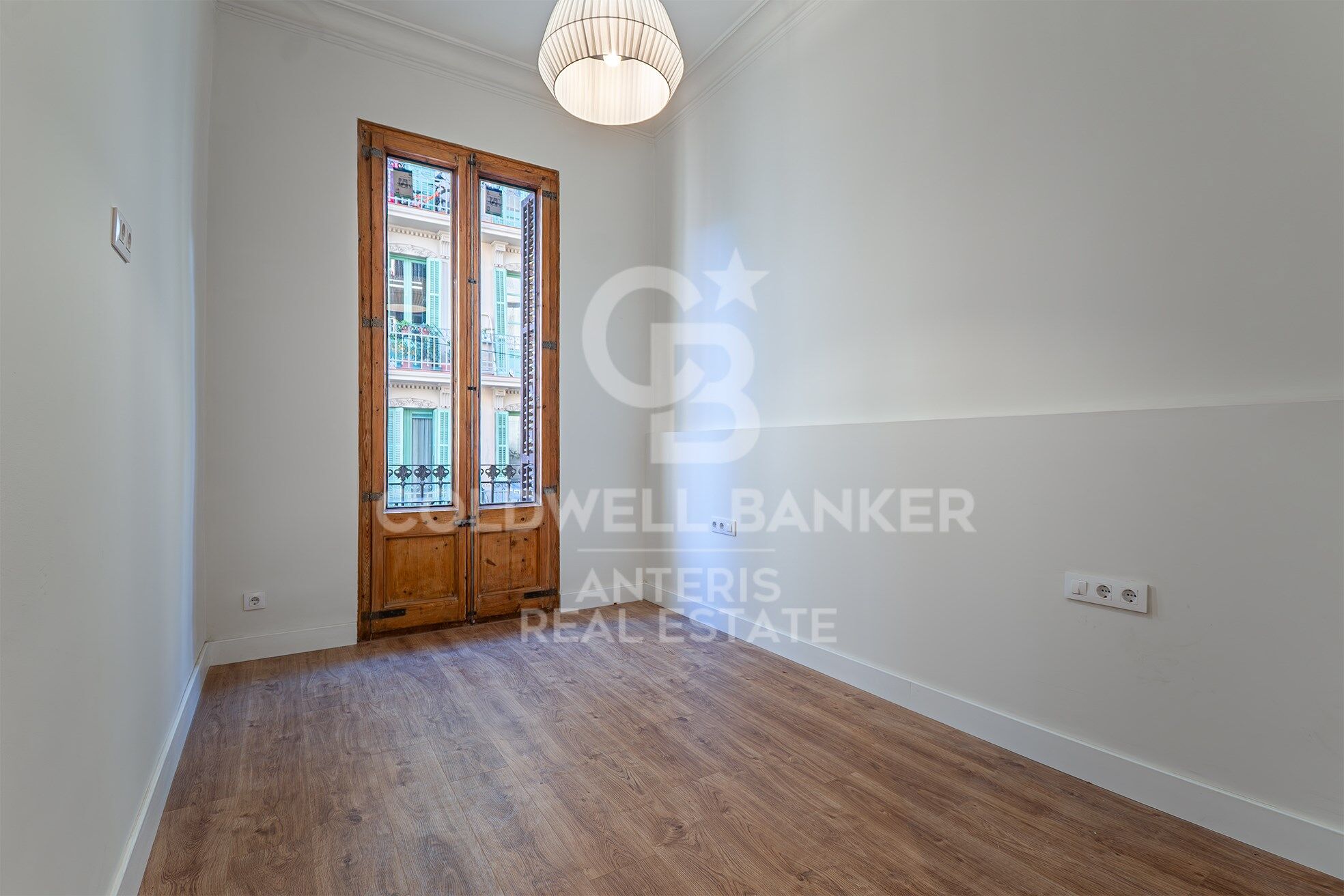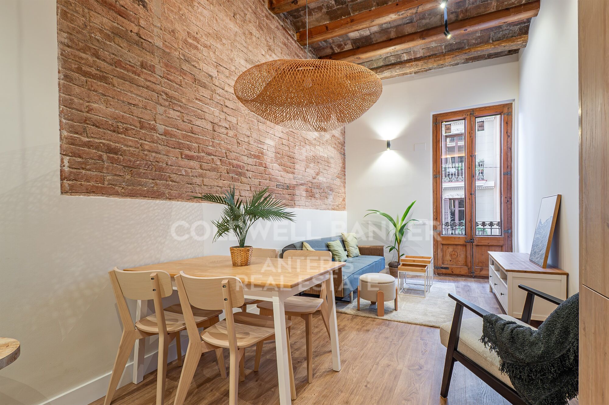 This apartment has been completely renovated and is brand new. It stands out for its excellent layout and for preserving the characteristic features of classic properties, such as high ceilings with moldings, exposed walls, Catalan vaulted ceilings, wooden beams, and a beautiful balcony overlooking the main street.