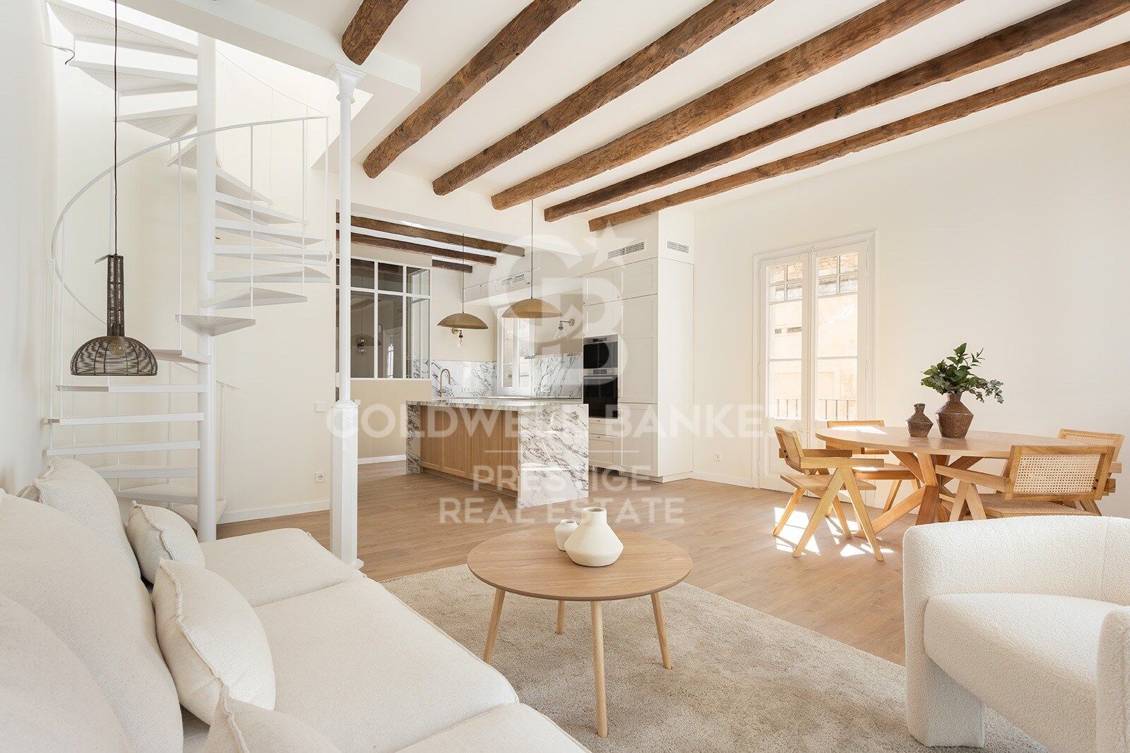 This corner apartment boasts numerous windows in every room, ensuring exceptional natural light. The high ceilings provide an incomparable sense of spaciousness. On the main floor, there is an open-plan living room, three double bedrooms with private bathrooms, a second, smaller living room or office, a guest toilet, and a sun-drenched first terrace. Ascending an elegant spiral staircase, you reach a second private terrace of 59 m².