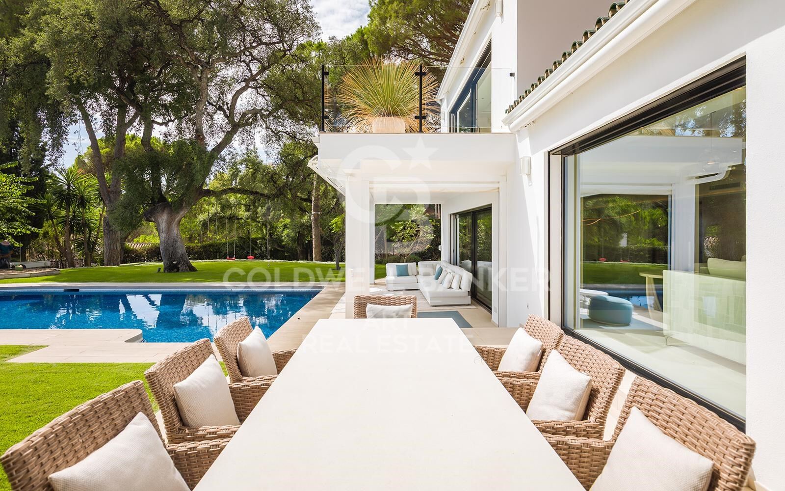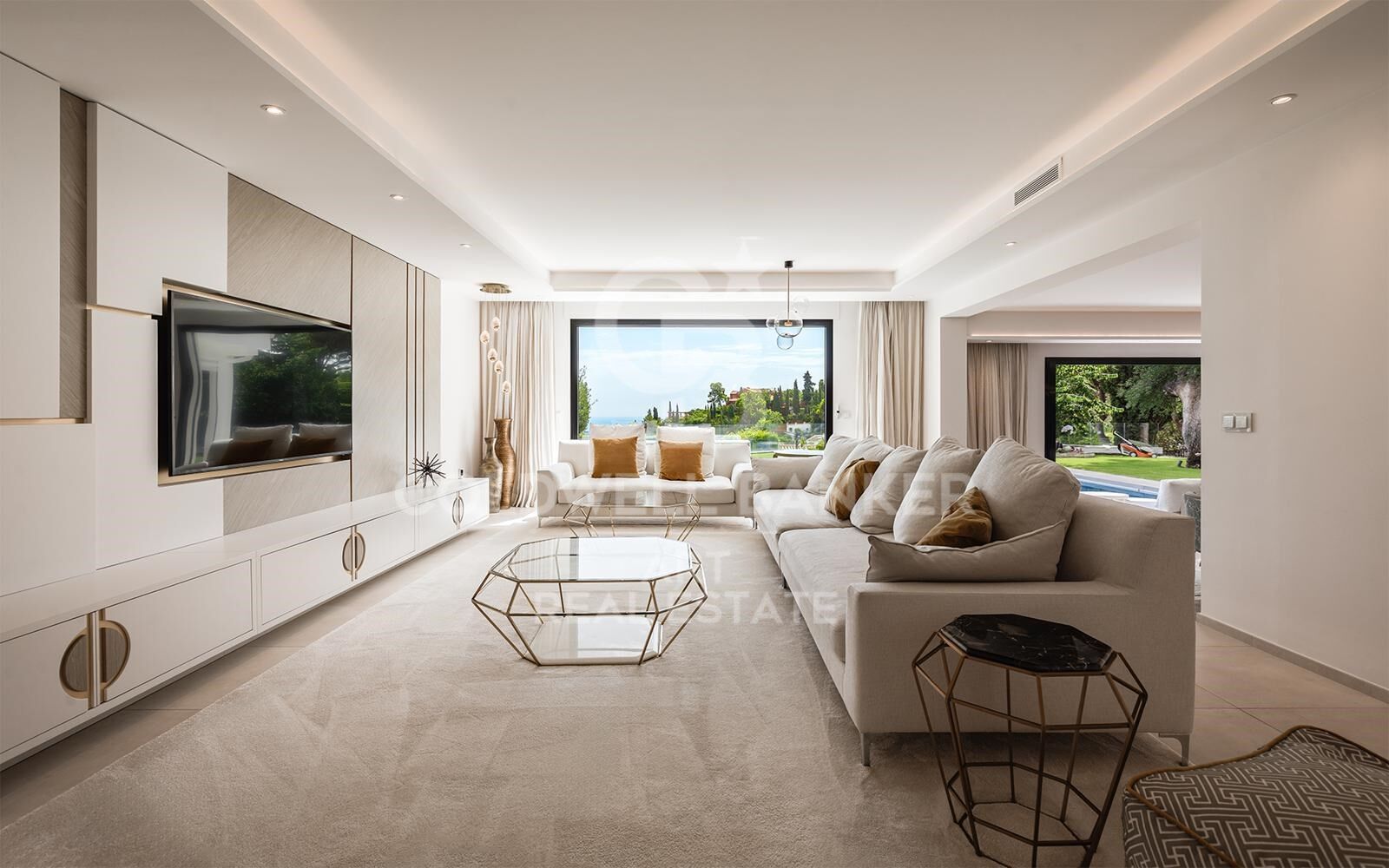 This exquisitely renovated luxury villa embodies elegance and comfort in one of Benahavís' most prestigious gated communities. Facing south to southeast, the property enjoys magnificent panoramic sea views and is bathed in natural light throughout the day. The villa comprises five spacious bedrooms and five beautifully appointed bathrooms, offering ample space and privacy for family and guests. The stylish eat-in kitchen is fully equipped, ideal for everyday living, while the separate formal dining room sets the tone for more elegant entertaining. The main living room is both welcoming and sophisticated, complemented by a versatile entertainment space perfect for leisure and relaxation. Comfort is assured year-round with underfloor heating throughout and integrated hot and cold air conditioning. Outdoors, the private garden and pool area provide a peaceful oasis, ideal for quiet reflection or hosting gatherings with friends and family. Additional features include a generous driveway and a two-car garage, enhancing convenience and security. Located within a secure gated urbanisation, the villa offers the utmost in privacy and peace of mind. Sold fully furnished with high-end décor, this exceptional property is move-in ready, allowing for immediate enjoyment of its serene setting and luxurious lifestyle. Viewings are highly recommended. El Madroñal is ideally located just 2 minutes by car from Monte Halcones shopping centrewith cafés, supermarkets, and boutique shopsand only 5 minutes from the vibrant town of San Pedro and its beautiful beaches. #ref:CBSH400