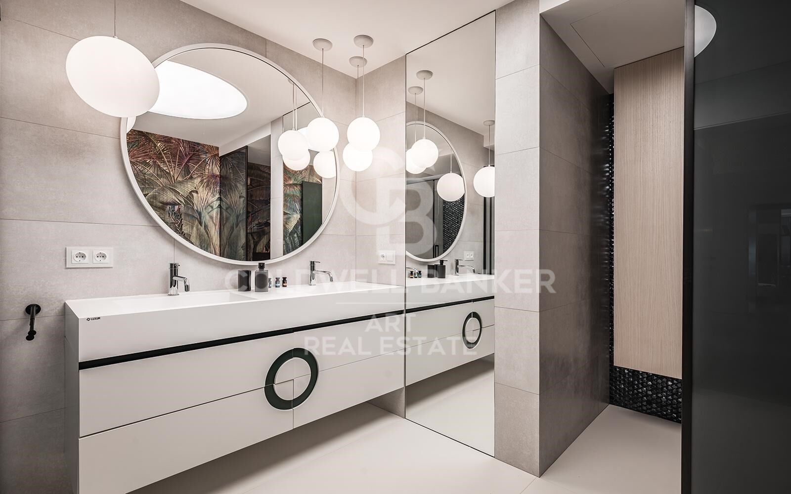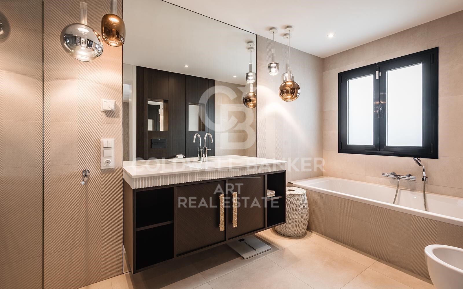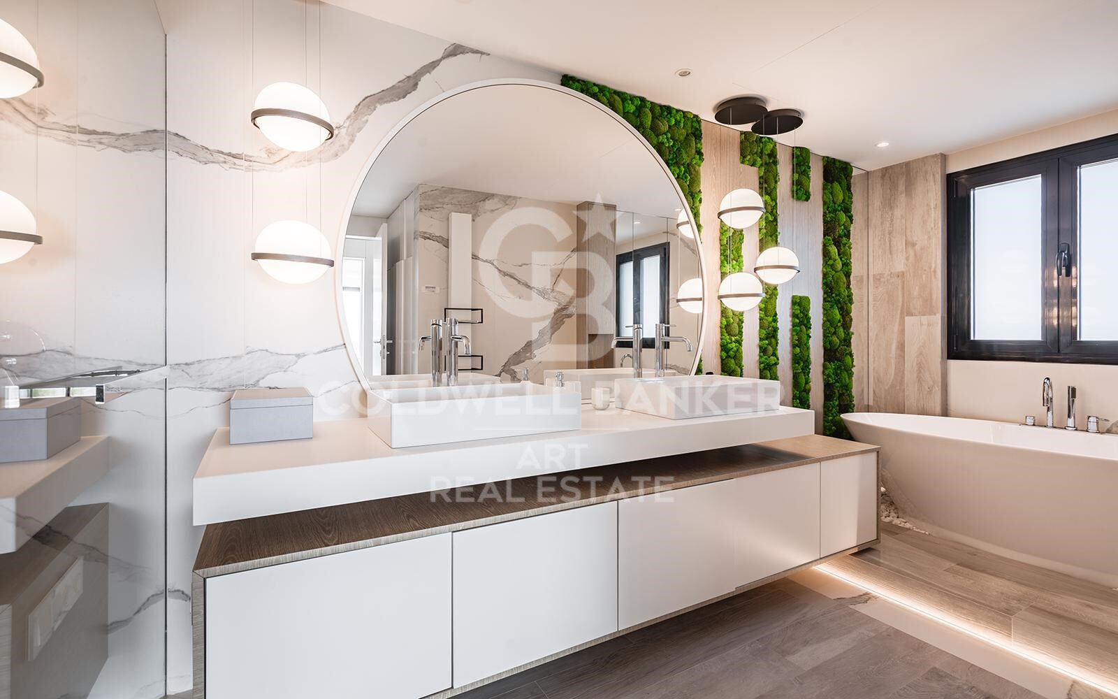 The upper floor is reserved for the luxurious master suite, complete with a bright bedroom, a bathroom featuring both a bathtub and a shower, a walk-in wardrobe, and a private terrace offering breathtaking views.