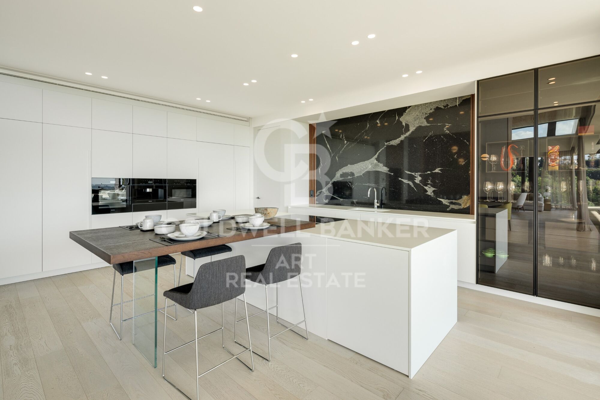 Every detail has been carefully crafted, from the open-plan interiors to the tranquil outdoor spaces. The villa welcomes you with large windows framing spectacular views and flooding the home with natural light. Interiors, designed by Aalto Exclusive Design, balance neutral tones with vibrant touches of color to create a sophisticated and comfortable atmosphere. The ground floor features four elegantly decorated bedrooms, including a master suite with walk-in closet and en-suite bathroom, while the lower level offers a gym, spa, and an entertainment area including a billiards table, poker table, and home cinema.
