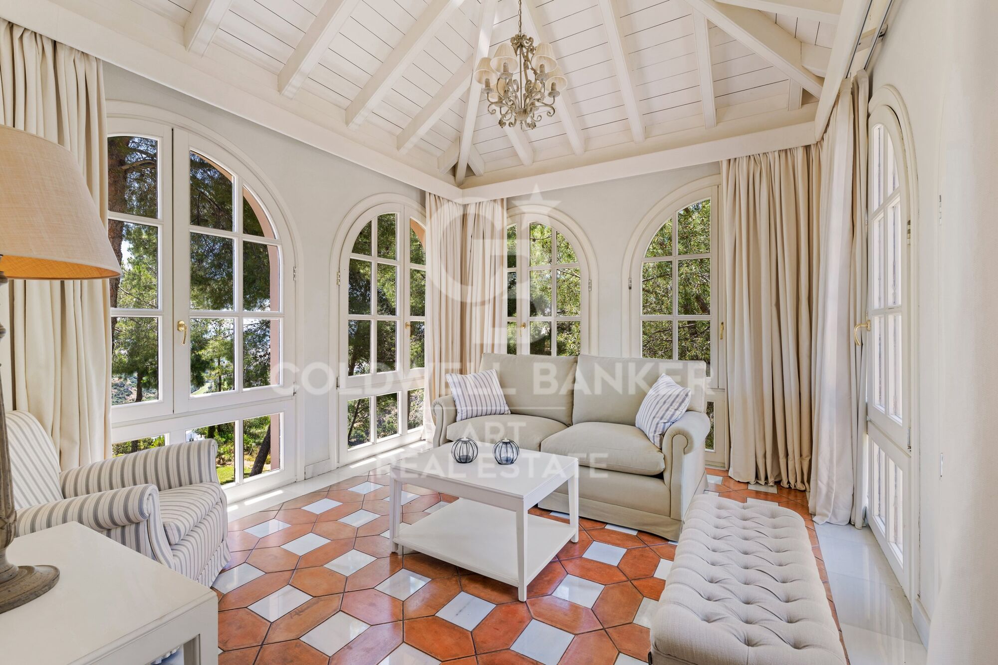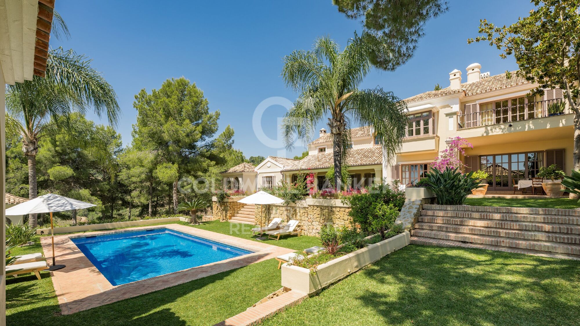 This grand Mediterranean estate is nestled within an exclusive gated community, offering an extraordinary Andalusian-style residence designed by renowned architect César de Leyva. Surrounded by mature pine trees and natural landscaping, the property spans two expansive plots, providing complete privacy, 24-hour security, and sweeping panoramic views of the Mediterranean Sea, La Quinta Golf Course, and the nearby mountains.