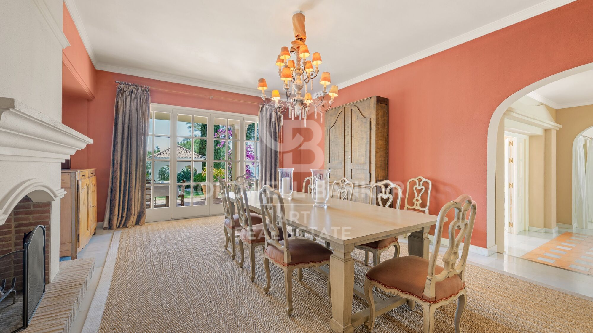A cobbled courtyard with a central fountain welcomes you upon arrival, flanked by a double garage and a staff apartment with independent access. Inside, a majestic entrance hall with triple-height ceilings and a dramatic fireplace leads into spacious living areas full of Andalusian character. The formal dining room and TV lounge each feature their own fireplace and open directly onto the gardens.