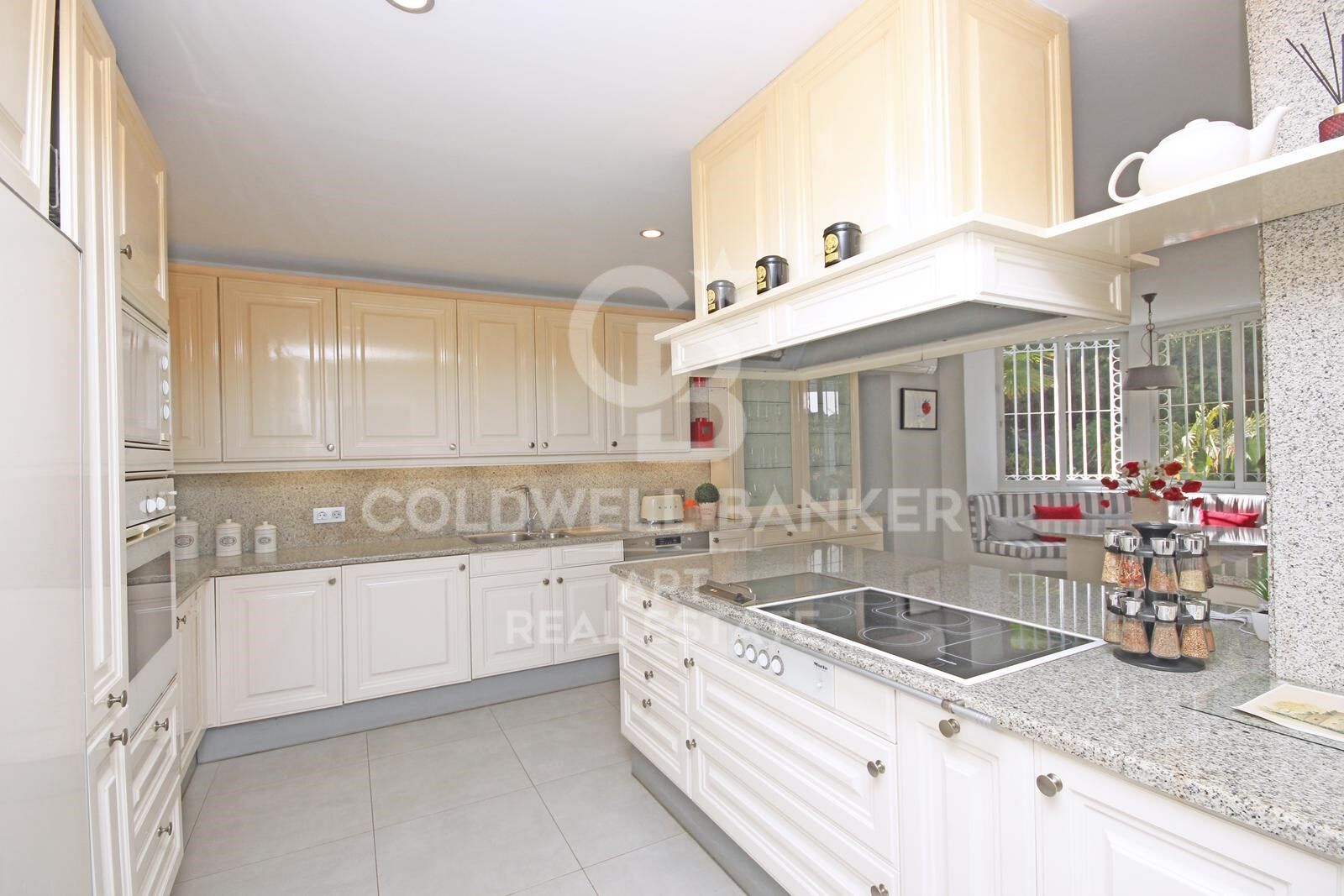 The beautifully landscaped garden surrounds a large private swimming pool, complemented by a covered outdoor kitchen and barbecue areaperfect for embracing the Mediterranean lifestyle throughout the year. A private garage provides parking for two vehicles.