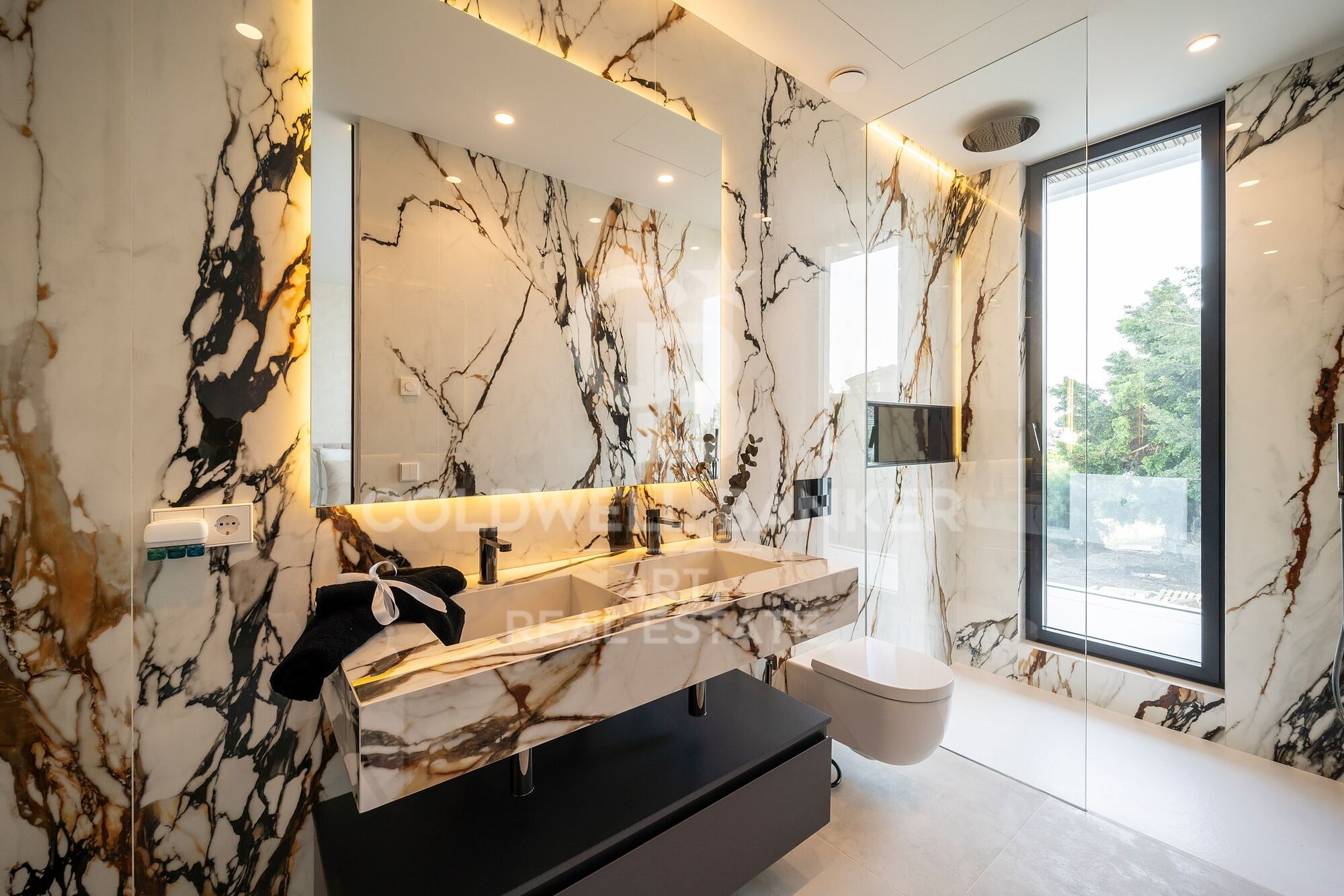 Outdoors, a landscaped garden surrounds the expansive terraces, perfect for relaxing or entertaining. The highlight is the spectacular infinity pool with a cascading waterfall, complemented by a fully equipped outdoor kitchen, ideal for unforgettable evenings under the stars.