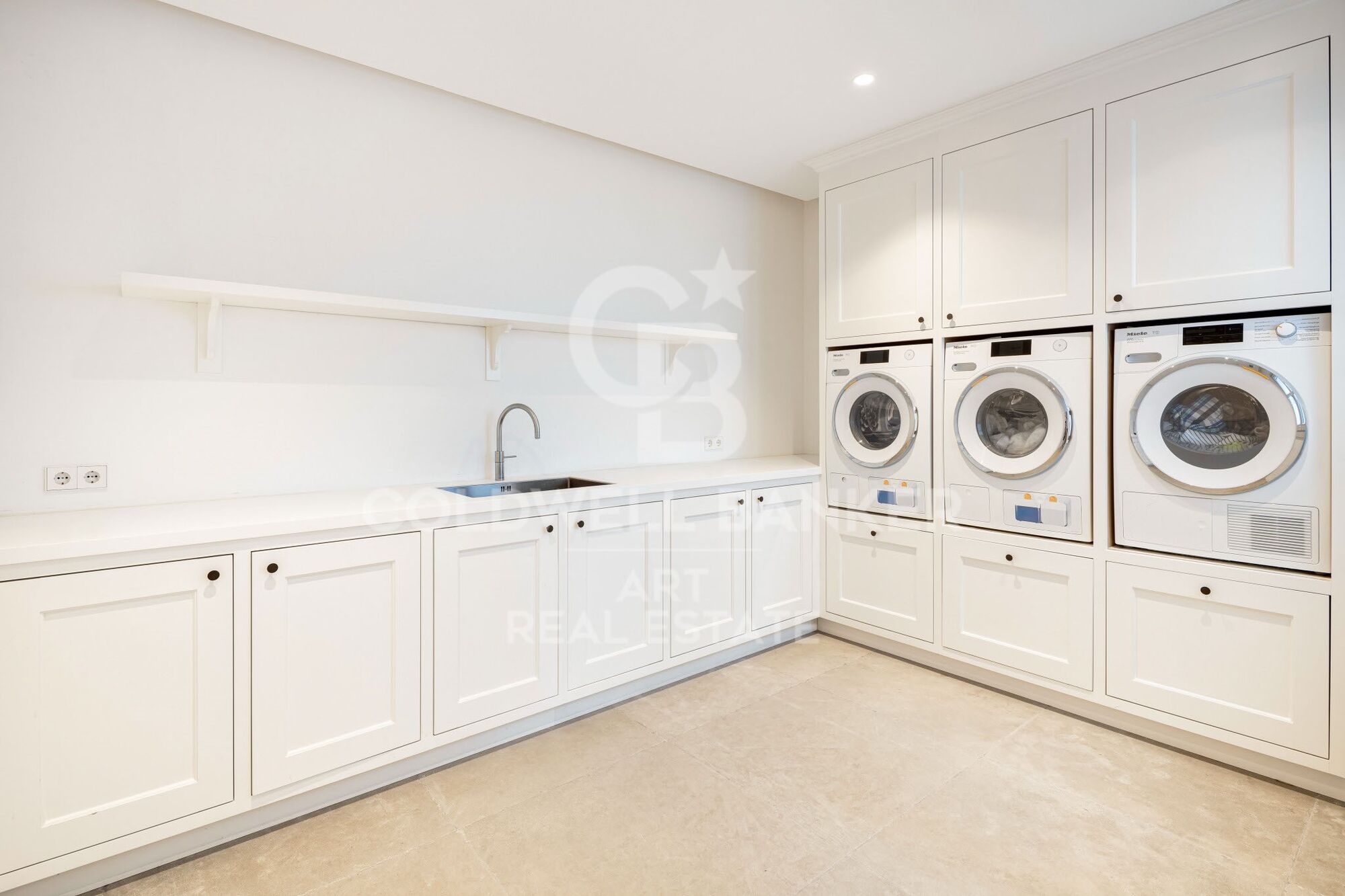 On the upper floor, the master suite features a dressing room and luxurious bathroom, along with two additional bedrooms and a full bathroom. Amenities include a private gym, sauna, steam bath, home cinema with Bang & Olufsen, large terraces with panoramic views, outdoor kitchen with barbecue, and leisure areas.