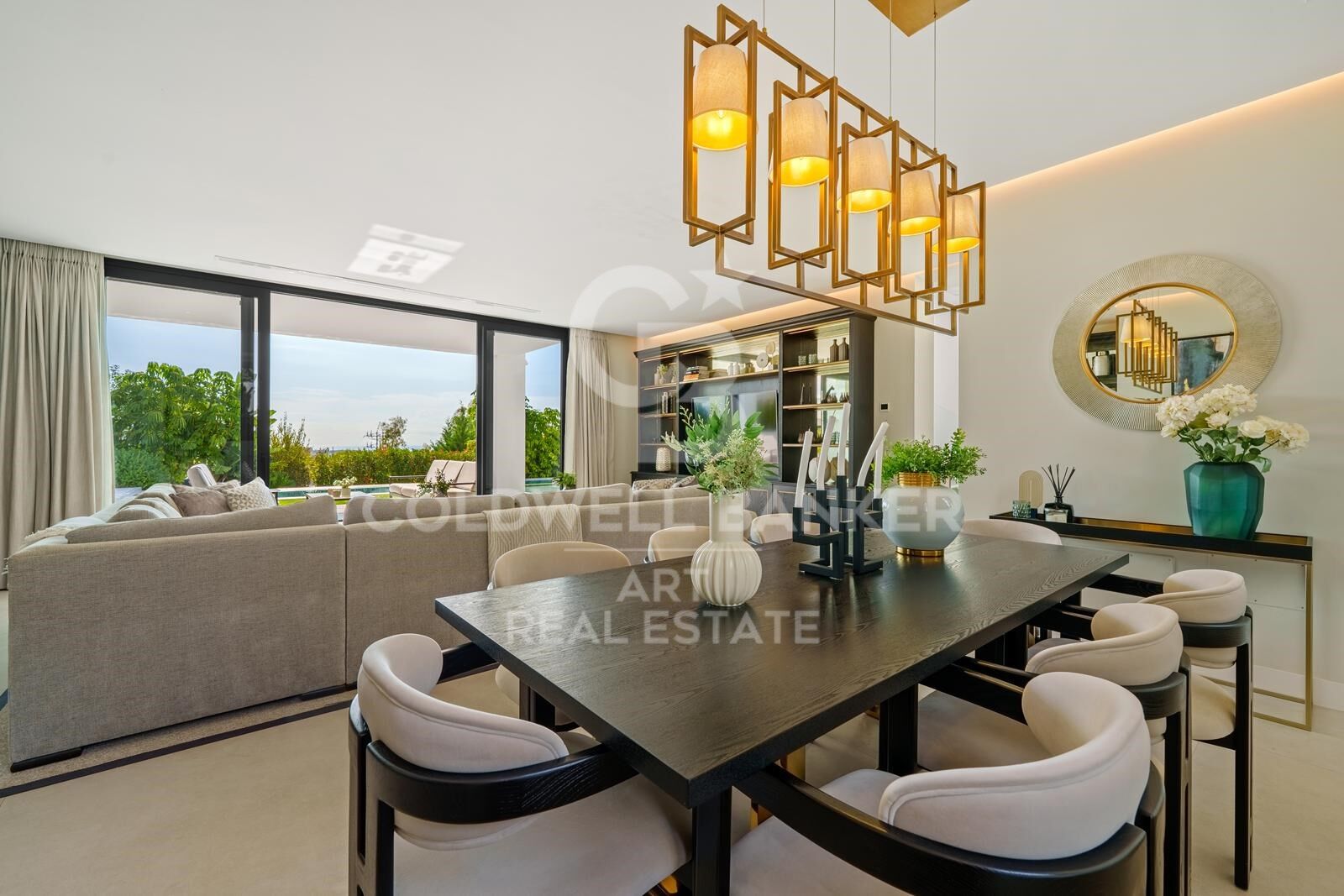 A contemporary residence designed for modern, elegant living, featuring a spacious open-plan layout integrating the lounge, dining area, and fully equipped kitchen, seamlessly connecting to the outdoors through floor-to-ceiling glass doors.