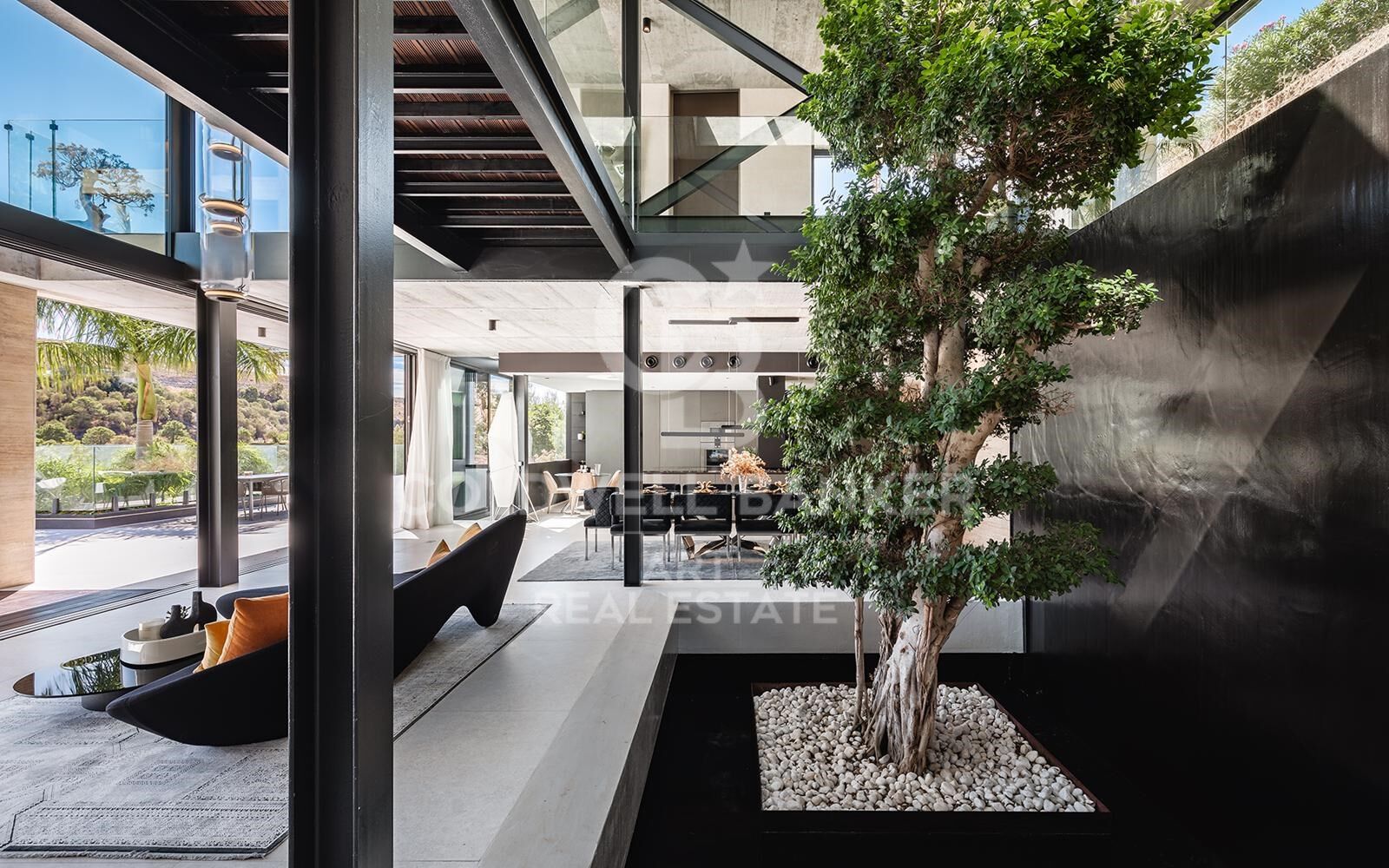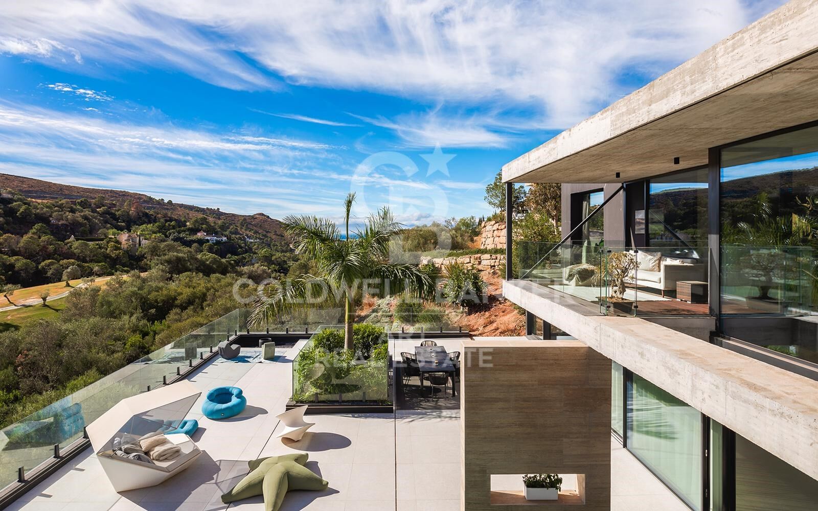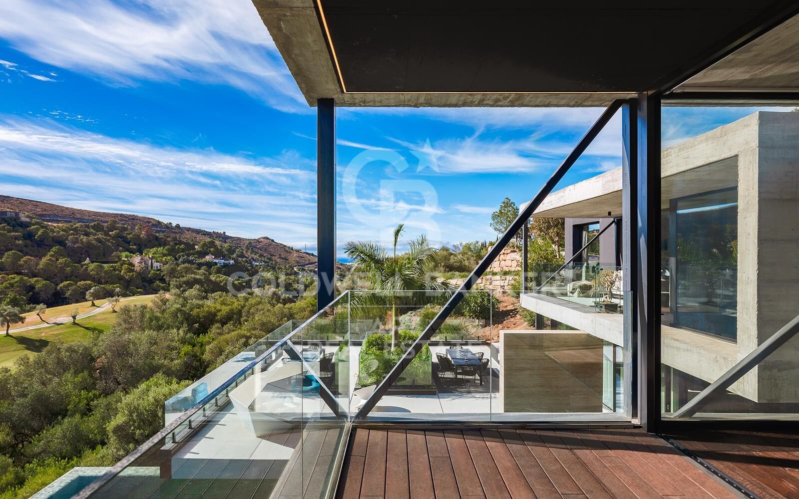 Set at one of the highest vantage points in the exclusive gated community of El Herrojo Alto, this extraordinary residence represents the epitome of contemporary architectural excellence. A true statement home, it seamlessly combines bold modern design with timeless natural elements, all framed by sweeping panoramic views of the surrounding landscape. A scenic, tree-lined approach introduces the property, culminating in a grand entrance and expansive driveway that set the tone for what lies within. The exterior's striking geometry is softened by the warm texture of organic materials, creating an inviting yet sophisticated first impression. Step inside to a world of light and openness, where floor-to-ceiling windows flood the interior with natural sunlight and capture uninterrupted vistas. The main living area is anchored by a sculptural fireplace, elegantly separating the stylish lounge from the dining space and state-of-the-art kitchen. An adjacent outdoor kitchen and entertaining area further enhance the sense of effortless luxury living. Also on this level are two beautifully appointed guest suites with private en-suite bathrooms. The upper floor features three additional en-suite bedrooms, including a show-stopping master suite of over 70 m². This private sanctuary includes a spacious walk-in wardrobe, a luxurious bathroom, and an expansive terrace complete with a jacuzziperfect for soaking in the spectacular surroundings in total privacy. On the lower level, nearly 800 m² of exceptional living space unfolddesigned to elevate comfort, wellness, and entertainment. This level includes multiple lounges, a cinema room, games area, fully equipped gym, and an indulgent indoor spa with pool and jacuzzievery element thoughtfully curated to deliver an unmatched lifestyle experience. Additional highlights include a dedicated home office, garage space for up to eight vehicles, and three more en-suite bedroomsone of which features a separate entrance and kitchenette, ideal for guests or staff accommodation. A truly rare offering, this home is not merely a residenceit is an architectural landmark, crafted for those who demand the extraordinary. #ref:CBSH1170