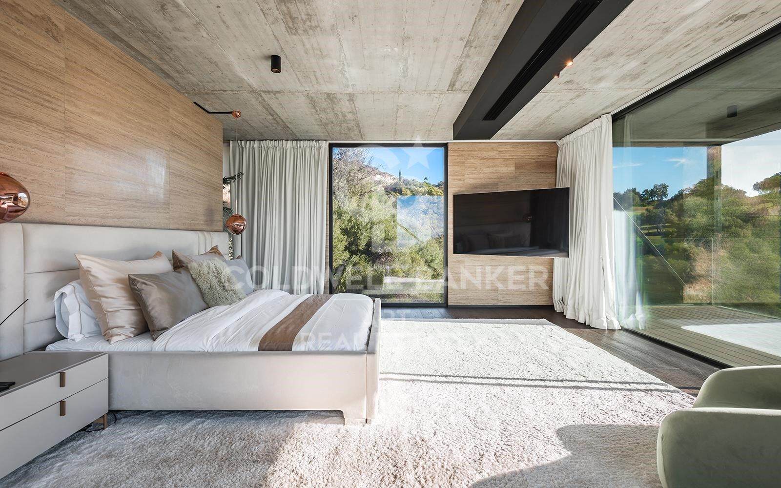 Tucked away in the heart of Monte Mayor, Benahavís, this brand-new contemporary villa is a hidden gem within an exclusive gated community of 330 hectares of rolling hills and valleys, more than half of which is preserved as a protected green zone. Surrounded by pristine nature and high-end residences, this low-density estate offers 24-hour security, total privacy, and breathtaking views over the Mediterranean Sea, Gibraltar, and the North African coastline. Just 15 minutes from the coast and within easy reach of world-class golf courses, top schools, restaurants, beach clubs, and all amenities, this property delivers the ultimate blend of seclusion and accessibility in the Marbella area. Set on a generous plot of 5,127 m², the villa extends over 1,100 m² of built space with an additional 500 m² of terraces, surrounded by a drought-tolerant garden. Every detail of the home has been thoughtfully designed to offer comfort, sustainability, and visual harmony with the surrounding landscape. Built to the highest eco-conscious standards, it features a green roof, solar panels, LED lighting, and expansive floor-to-ceiling windows with Schüco frames that frame 180-degree panoramic sea and mountain views. The layout is elegantly divided into private and guest wings. The private wing includes a stunning master suite and guest master bedroom, along with a private living room, gym, and serene outdoor space. The guest wing offers additional bedrooms, living areas, fully equipped kitchens, and terracesideal for hosting visitors in style. The main living space is warm and inviting, featuring a built-in fireplace, elegant wood paneling, and exposed brick accents that enhance the natural ambiance. A second fireplace separates the master bedroom and its luxurious en-suite bathroom, both adorned with wood flooring and rich feature walls. The sleek, fully fitted kitchen and dining area combine form and function with designer details and premium Gaggenau appliances. There are four kitchens in totalincluding one for a private chefand a 6 m² walk-in refrigerator ensures ample storage. Interior design is curated by Signature Design Concepts, bringing cohesion and character throughout. Entertainment is a key focus, with a fully equipped cinema room boasting a high-end laser video system and immersive Bose audio. The closed garage accommodates four to five vehicles. Seamless indoor-outdoor living is achieved through multiple terraces, a dramatic infinity pool with fountains, and inviting sunbathing and lounge areas. Outdoor showers, sunbeds, infrared heaters, and automated irrigation enhance the comfort and convenience of the outdoor experience. The villa is elegantly furnished with top-tier Italian brands including Minotti, Molteni, Gessi, and DeCastelli. It features refined finishes, built-in wardrobes, seamless cabinetry, double-glazed glass doors, multiple gas fireplaces, and a sophisticated lighting and ceiling design. A full Domotic system by Control4 governs the integrated audio-visual setup, with stealth speakers and streaming platforms like Netflix, Tidal, TuneIn, and even a karaoke system. Two elevators provide convenient accessone near the kitchens, the other by the master suiteand the home is pre-configured for an indoor pool if desired. Security and privacy are paramount. With no direct neighbours and the option to acquire surrounding plots, the property benefits from an automatic entry barrier, advanced camera systems powered by AI, fire and smoke detection, and full integration with local security teams and emergency response centers. This extraordinary residence is more than just a homeit's a private sanctuary designed for refined living in harmony with nature, offering an unmatched opportunity to experience the Mediterranean lifestyle at its finest. #ref:CBSH1156
