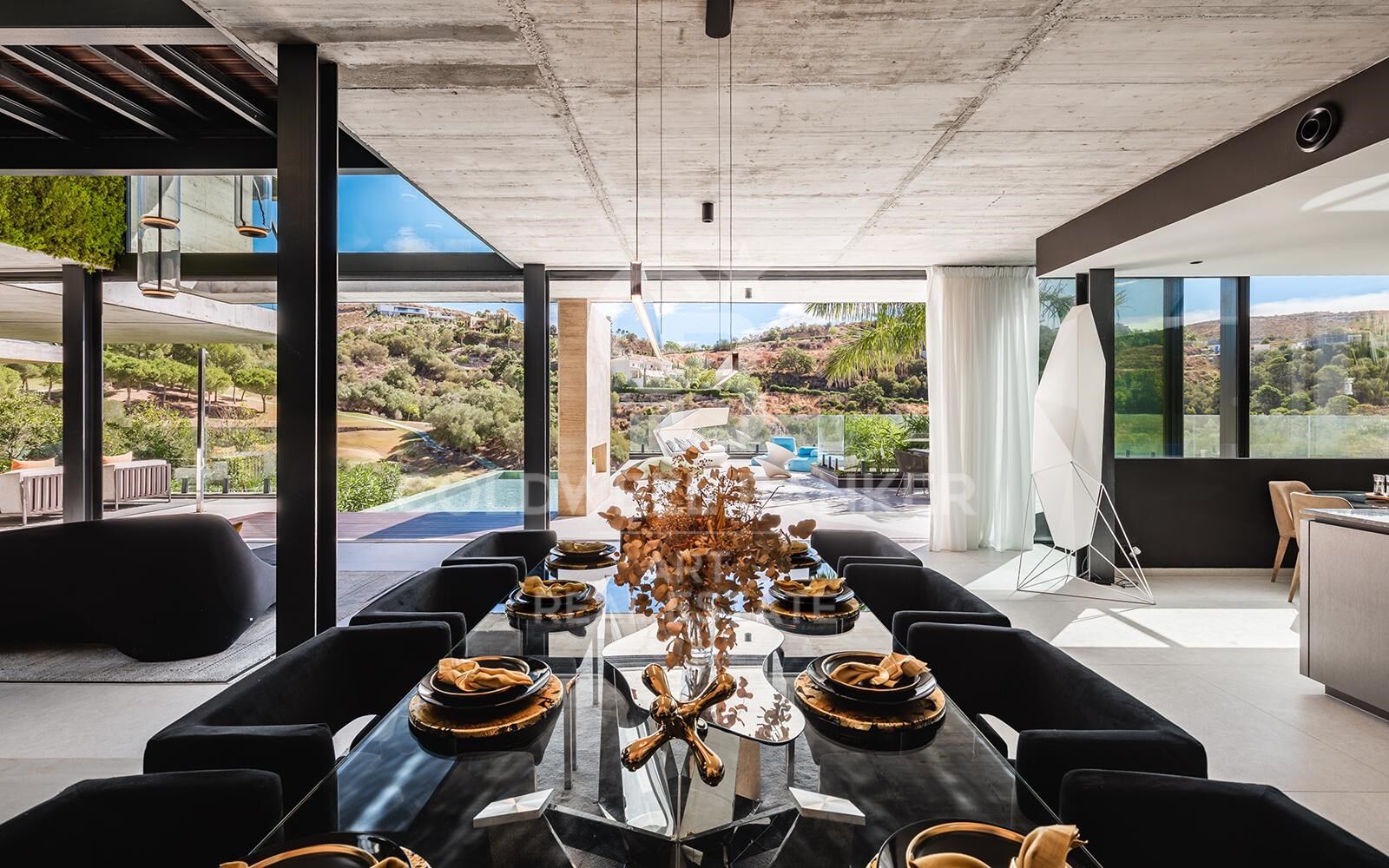 This exceptional villa is located within the prestigious gated community of El Herrojo Alto, one of the most desirable residential enclaves in La Quinta. Positioned on an elevated frontline golf plot, the property perfectly blends timeless Andalusian architecture with modern design, offering sweeping views over La Quinta Golf Course and toward the iconic La Concha mountain. Recently renovated to the highest standards, the home embodies contemporary Mediterranean living with seamless integration of indoor and outdoor spaces. Distributed across two levels and connected by a glass lift, the villa ensures both comfort and accessibility. Remarkably, all main living areas including the kitchen, lounges, bedrooms, gymnasium, and swimming pool are conveniently situated on a single level, promoting effortless flow throughout the home. Two elegant lounges, each furnished with custom Eichholtz pieces, provide versatile areas for relaxation and entertaining. The formal dining area adjoins a bespoke KoK Studio kitchen with Gaggenau appliances, natural wood cabinetry, and a secondary prep area. Finishes such as Scandinavian oak and porcelain flooring, Fujitsu climate control, and underfloor heating enhance year-round comfort. The master suite is a private haven featuring a walk-in dressing room and a luxurious bathroom with Villeroy & Boch porcelain, Hansgrohe fittings, a freestanding bath, and a walk-in shower. Each additional bedroom continues the theme of refined craftsmanship with Uecko wardrobes and detailed finishes. Expansive Cortizo glass panels and frameless balustrades create seamless transitions between indoor and outdoor living, framing spectacular mountain and golf views. The exterior features a salt-heated infinity pool, shaded terraces with electric awnings, and a fully equipped outdoor kitchen and barbecue area ideal for al fresco dining. Further highlights include a Technogym fitness area with a sliding glass roof, a private garage with EV charging, and a comprehensive security system supported by Target cameras, 24-hour surveillance, and gated entry. Located close to the La Quinta Golf & Country Club, Monte Halcones Commercial Center, and the vibrant areas of Nueva Andalucía and San Pedro de Alcántara, the villa offers easy access to fine dining, boutiques, and international schools. Puerto Banús and the Golden Mile are less than ten minutes away. Fully furnished inside and out with Eichholtz interiors, G&G Italia outdoor furniture, and a Samsung QLED system, this property exemplifies modern Andalusian luxury where architecture, design, and lifestyle unite in perfect harmony. #ref:CBSH1230