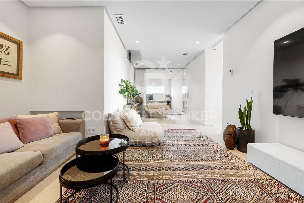 The main level features a spacious open-plan kitchen, living, and dining area, seamlessly connected to expansive terraces and a private garden via large sliding glass doors. The master bedroom is also located on this floor, and thanks to the property's original design, an additional 40m² extension has been added. This versatile space is currently used as a cozy TV lounge and home office.