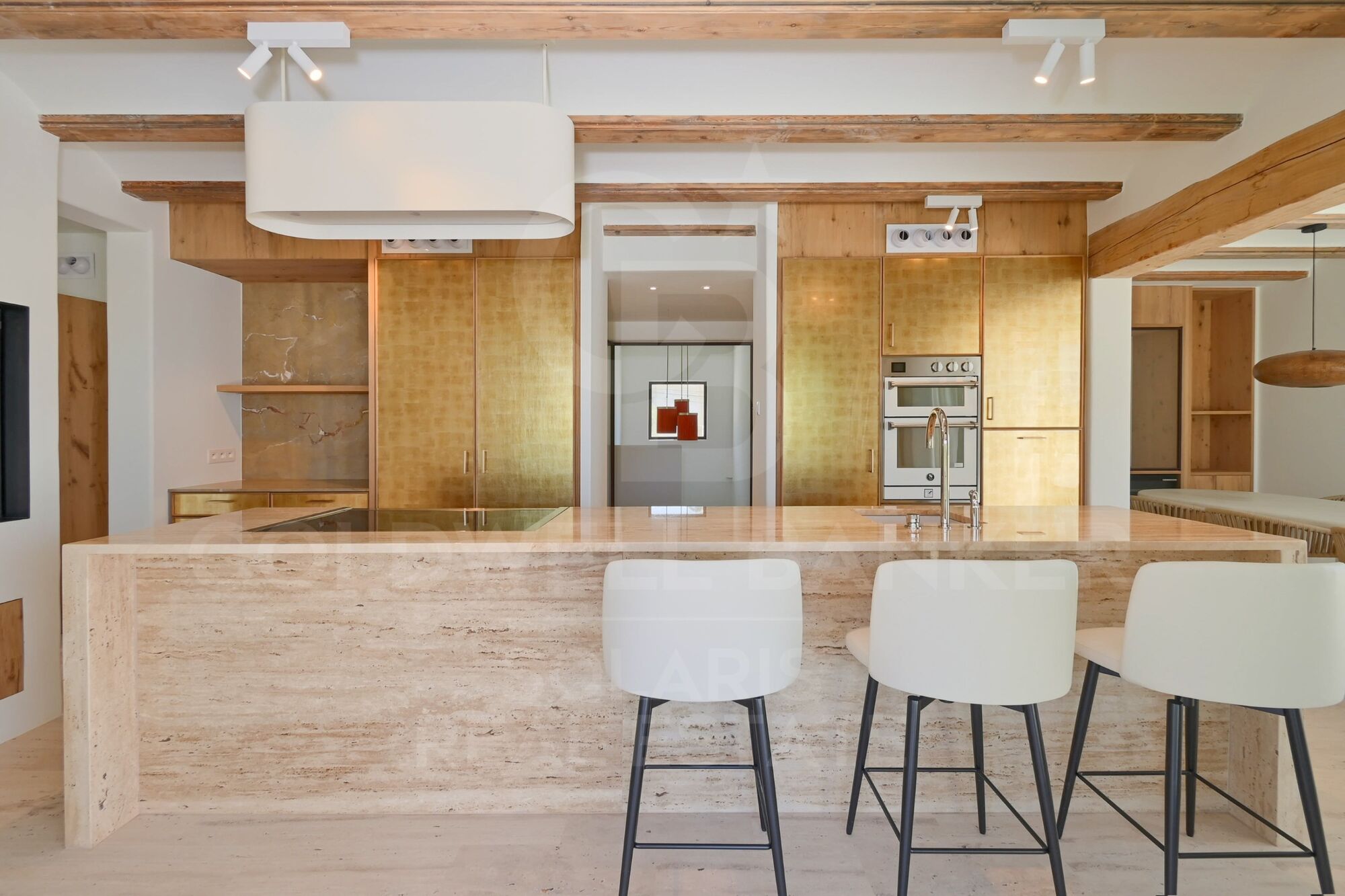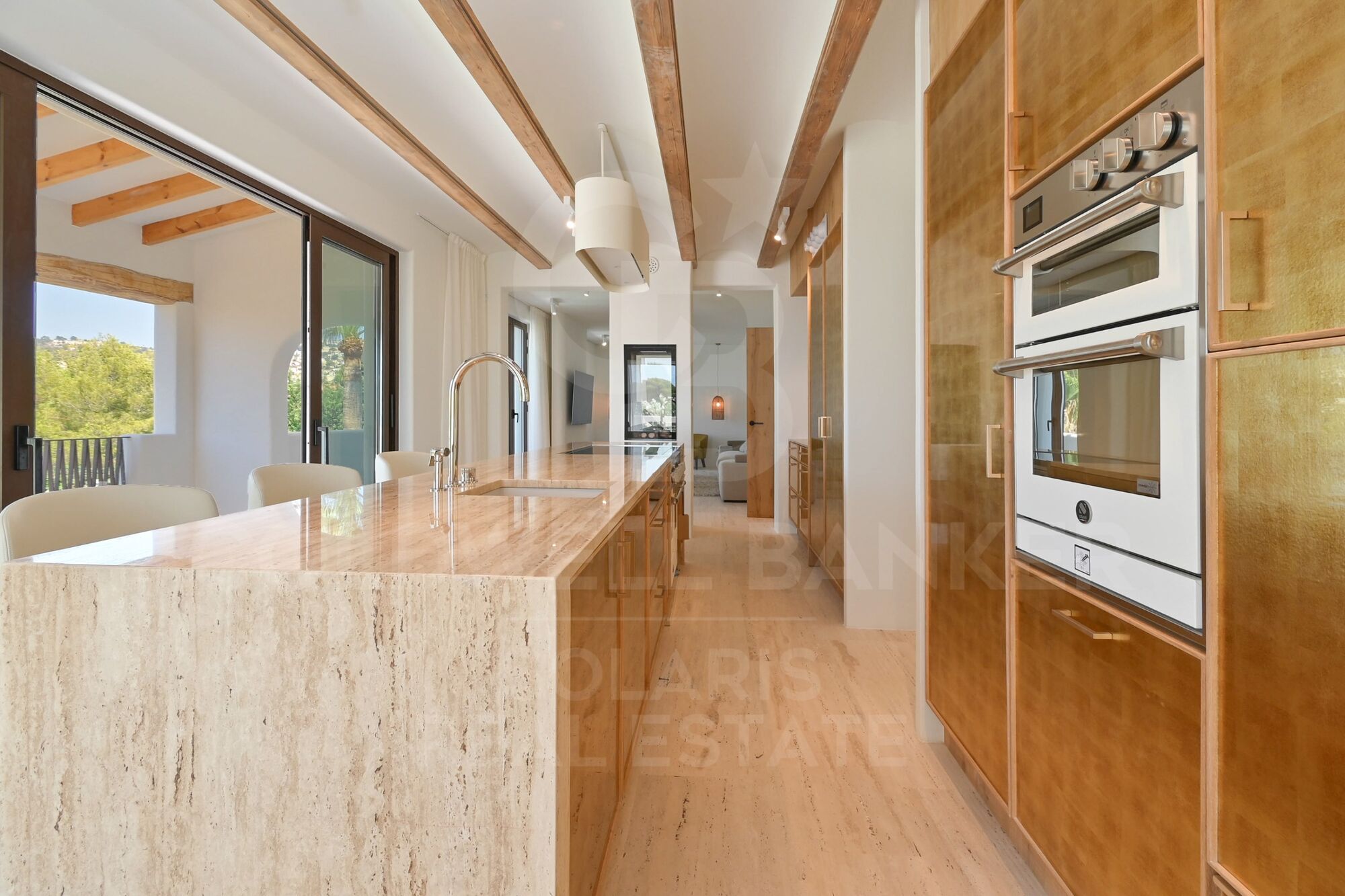 La cocina es uno de los grandes atractivos. Completamente equipada con electrodomésticos de alta gama, encimeras de travertino y una exclusiva cocina con horno de pizza integrado, se complementa con una práctica despensa. Los dos lavavajillas y el espacio adicional de refrigeración garantizan la máxima funcionalidad.