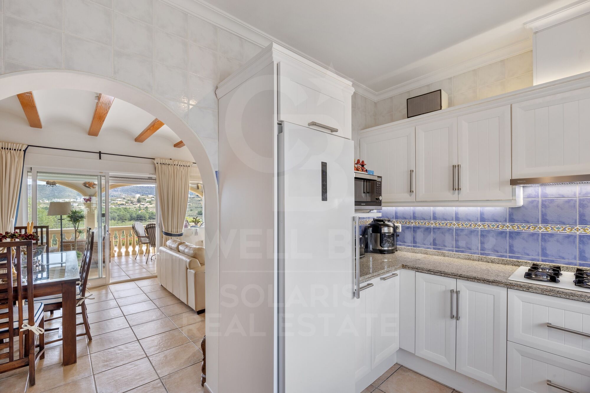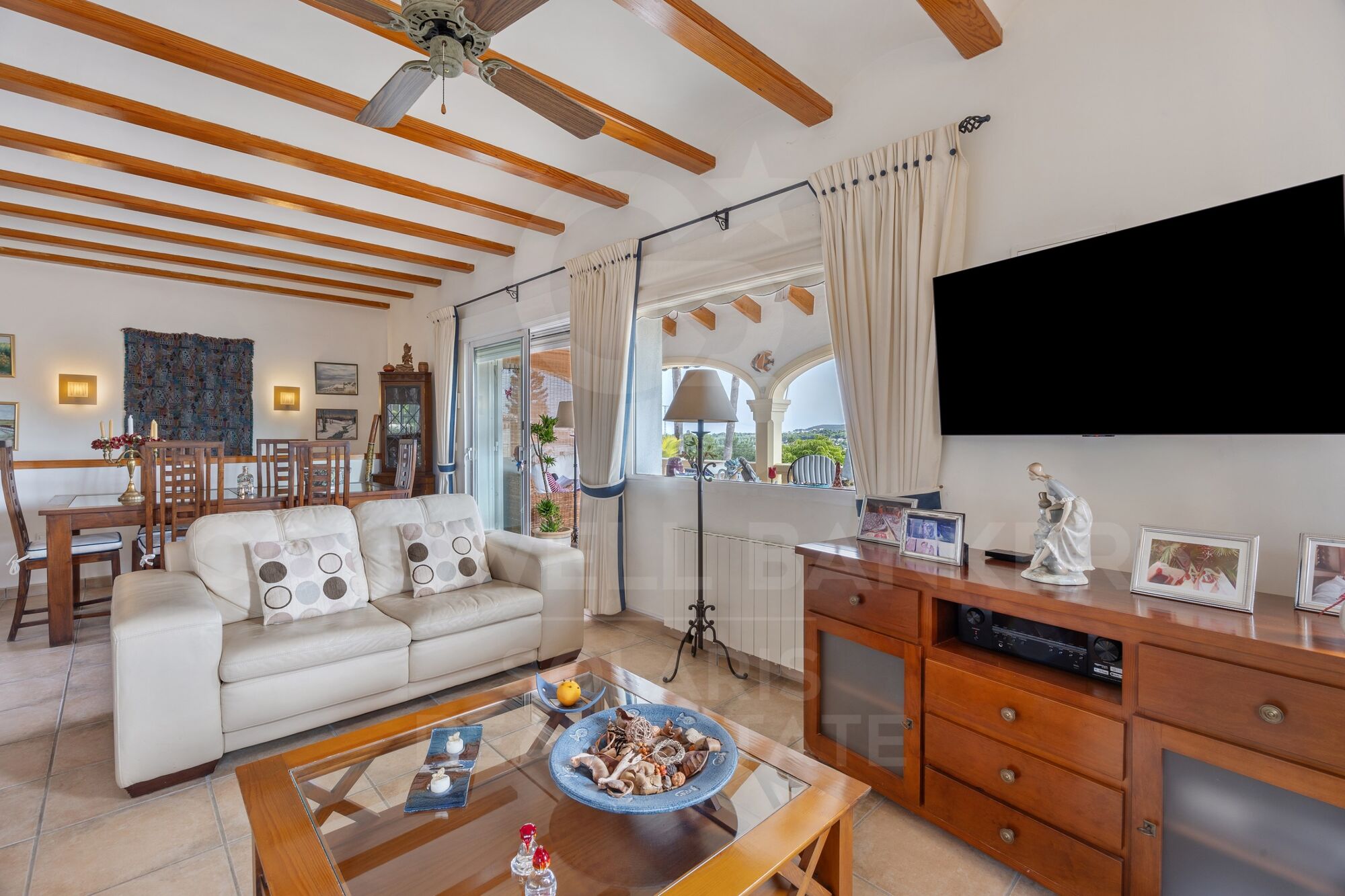 At the heart of this home are its outstanding outdoor living spaces. Steps up from the pool terrace lead to the impressive glazed Naya, enclosed on two sides and open at the front to capture the spectacular views across the countryside toward Benitachell and its iconic church. This generous space is ideal for dining and relaxation and includes electric remote-control awnings for shade, along with direct access to the open-plan lounge and dining room.