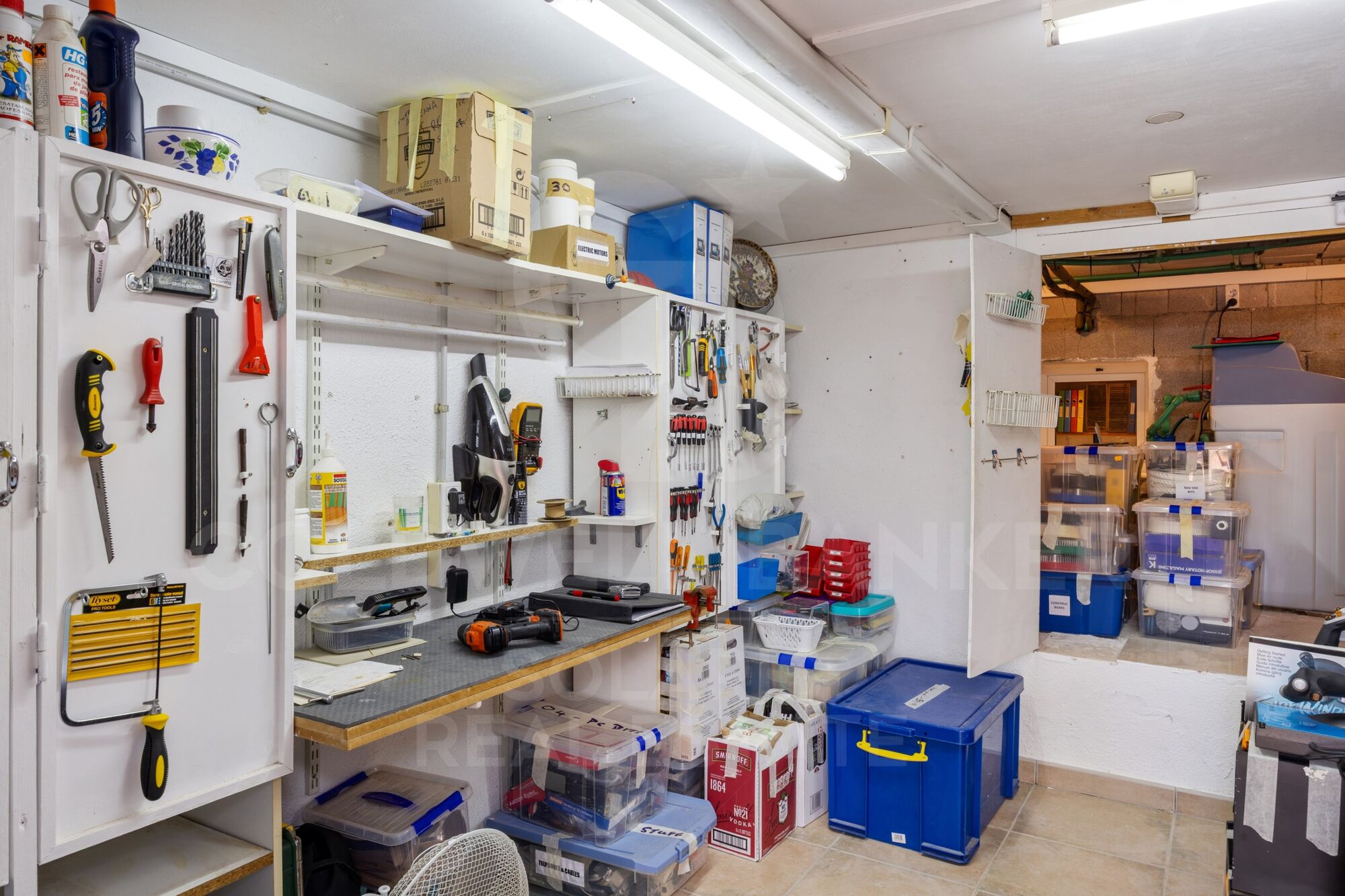 Three steps above the pool area is the inviting BBQ and bar zone. Semi-open in design and sheltered by glazed panels, it is perfectly suited for use throughout the year. A door leads from here into a second workshop and storage room, which also contains the central-heating boiler and water softener. The pool benefits from an automatic disinfection system for effortless maintenance.