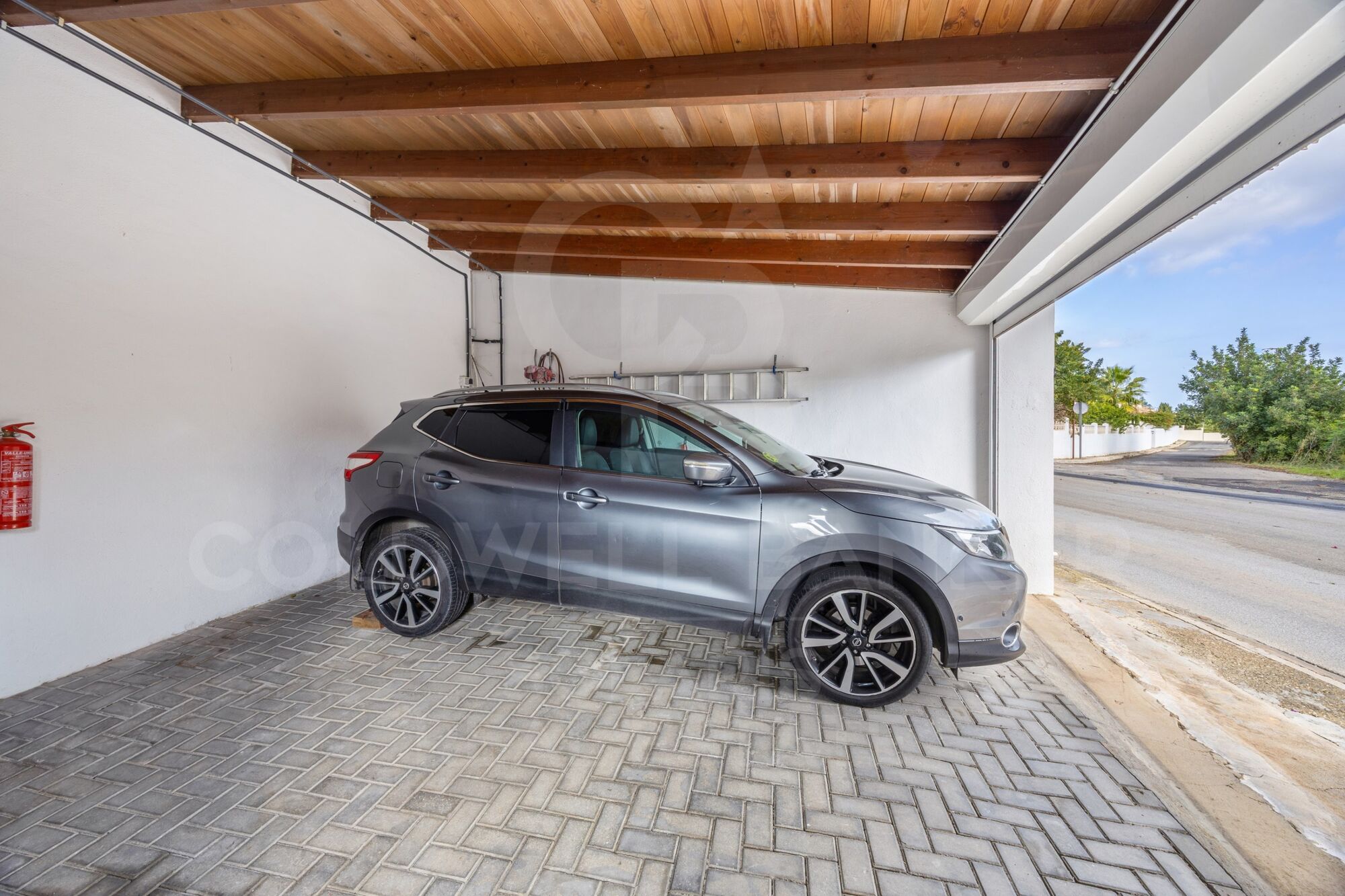 Access to the property is available from both the front and rear. At the front, an electric garage roller door opens into a spacious double covered parking area, complemented by a separate single garage currently used as a workshop. A pedestrian electric gate leads down a few steps toward the entrance, passing a large gas tank on the left and a landscaped pathway on the right. This path winds through Mediterranean planting, fruit trees, and an automatic irrigation system before arriving at the front door.