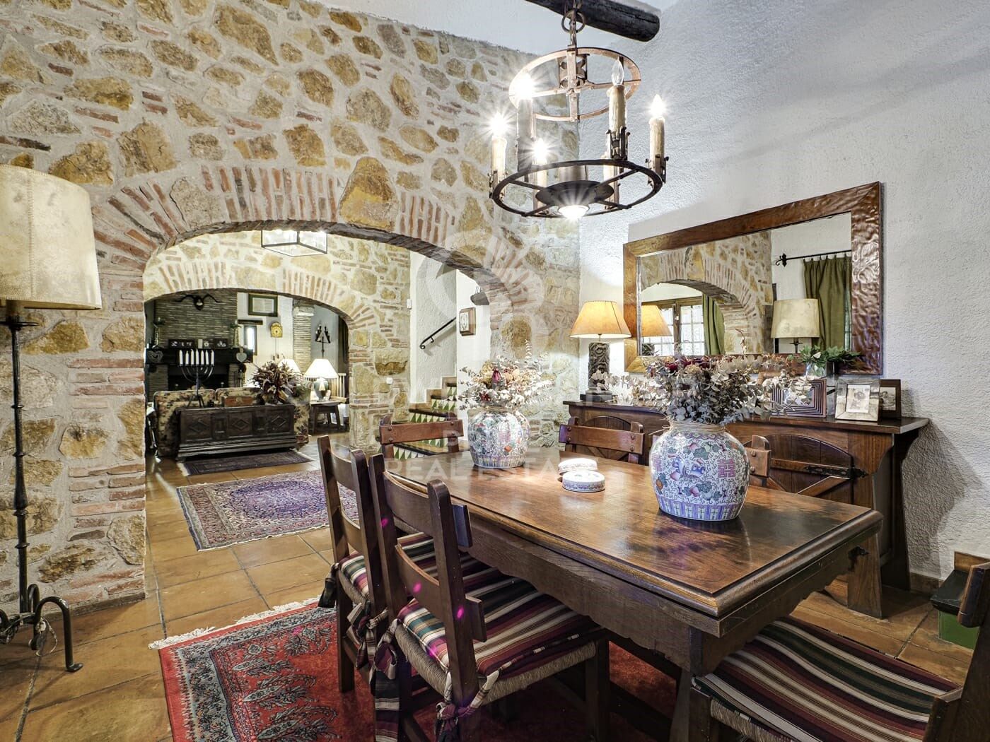 The 500 m² Catalan masia offers 5 bedrooms, 3 bathrooms, 1 guest toilet, living room, dining room, kitchen with fireplace, games room, bar, wine cellar, garage, and various outbuildings.