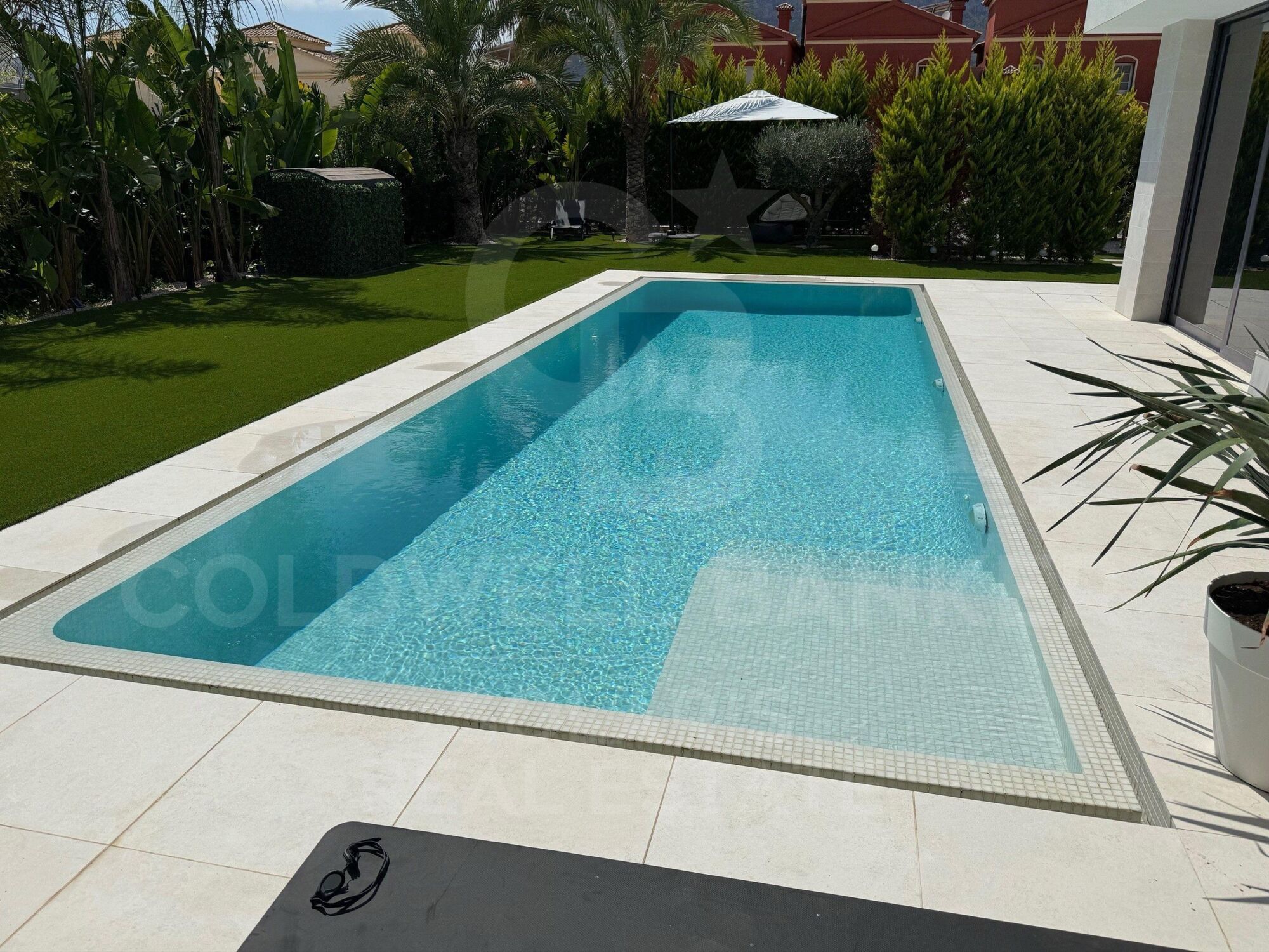 The exterior is a true oasis: saltwater pool, chill-out area, and a Mediterranean garden with native vegetation that is largely self-sustaining and requires very little maintenance. A smart irrigation system ensures the garden is perfectly watered at all times. A closed garage provides security and comfort, and the property also offers ample parking space for 5 to 6 vehicles, ensuring convenience for residents and guests alike. All this framed by an optimal orientation that guarantees sun throughout the day and open views that reinforce the feeling of freedom.