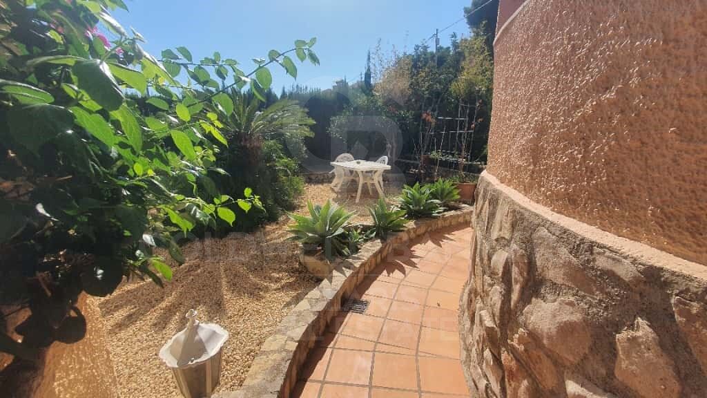Jardín mediterráneo consolidado, con 5 palmeras, frutales (naranjos, limoneros, higuera, caqui, cerezo, níspero, olivo) y setos de ciprés
