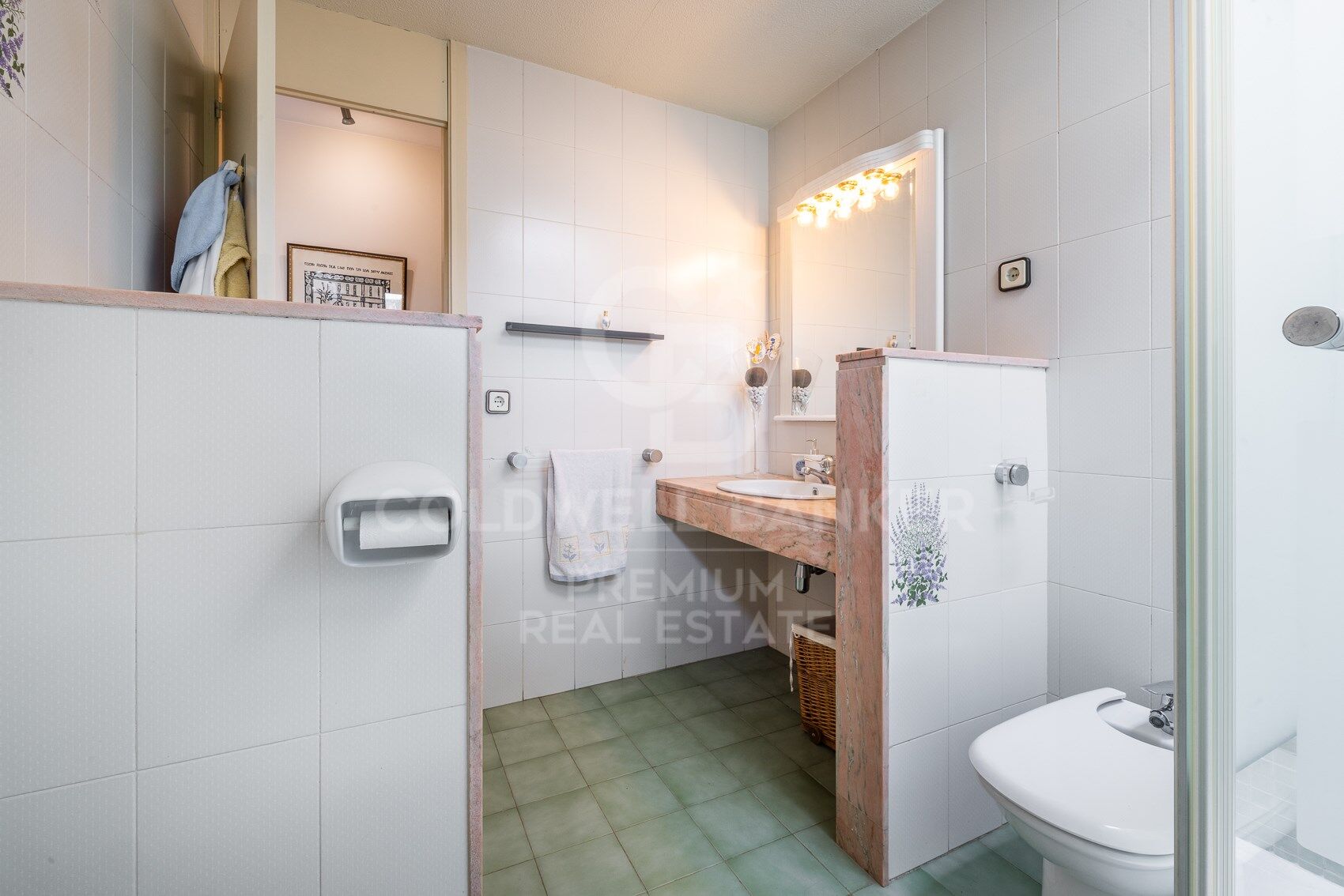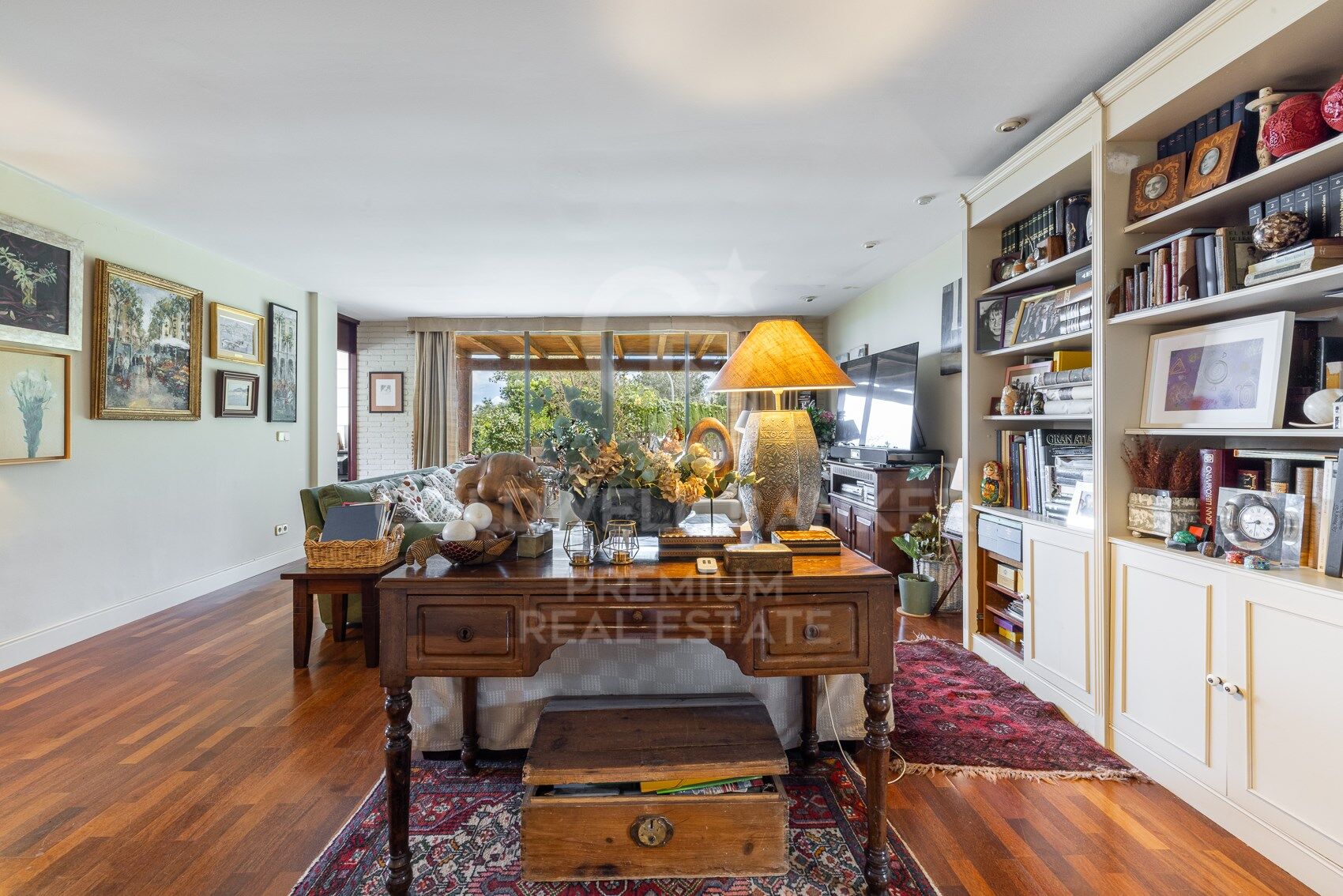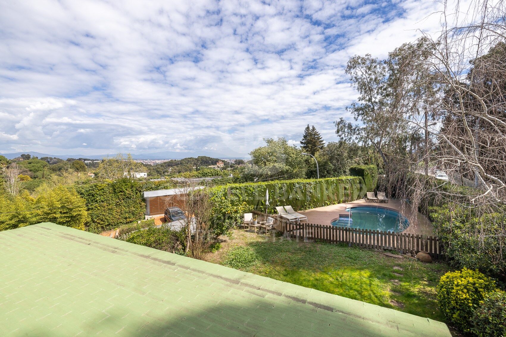 We are welcomed by a warm entrance hall that leads to a comfortable living room. The same large space houses the dining room. The living room also connects to the kitchen and, like the kitchen, has direct access to the garden through large sliding glass doors. Behind these doors is a practical terrace for outdoor lunches and dinners, with the beautiful pool in the background, leaving a large green space for a sunbathing area in between. The kitchen area is completed by a delightful office room with a bright window for breakfast and lunch. From the living room, we can also access an office with spectacular views of La Mola and Montseny. Returning to the entrance, we have access to the master bedroom with a dressing room and en suite bathroom, and another double bedroom with a walk-in closet. There is also a guest toilet and the stairs that lead to the remaining floors of the house.