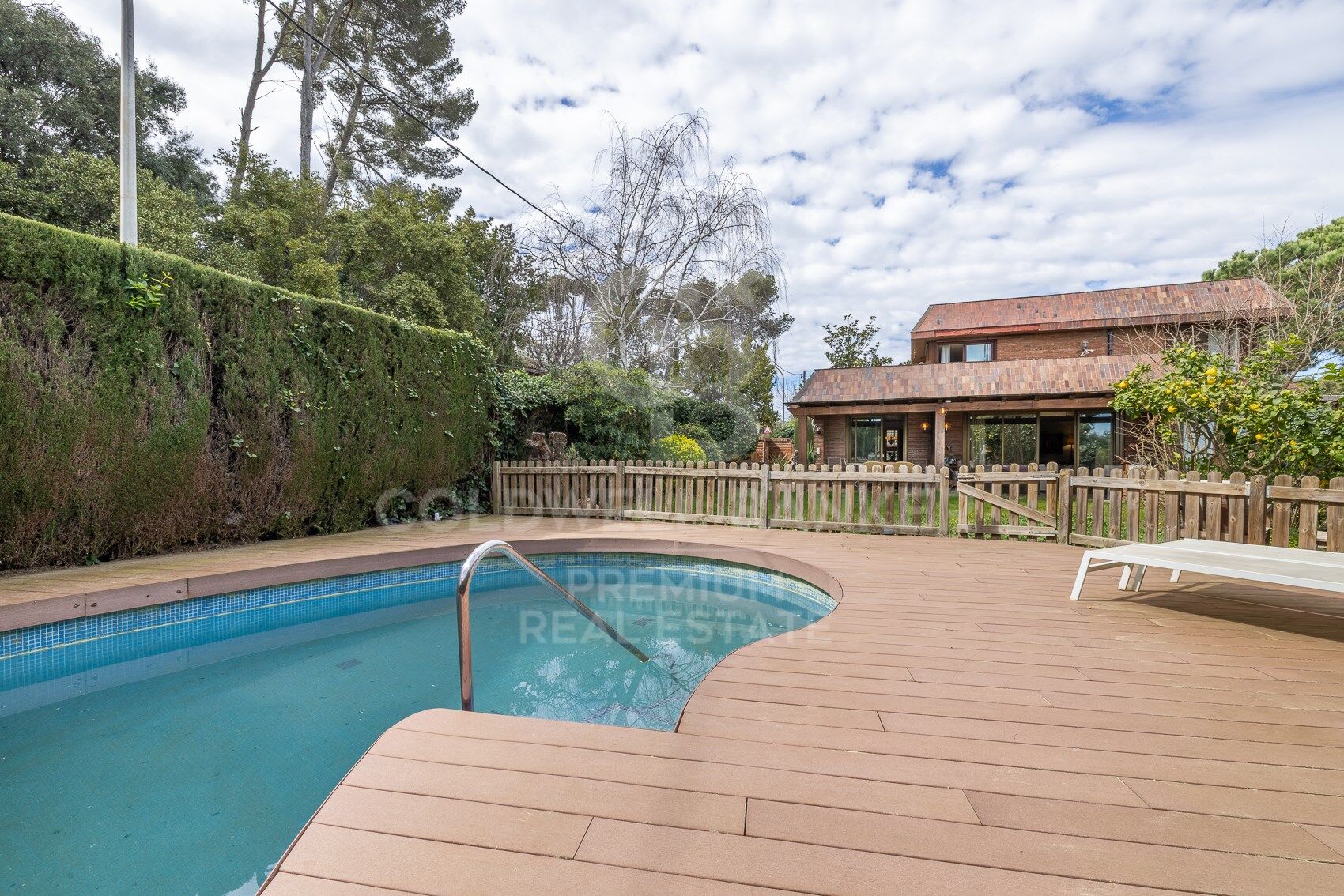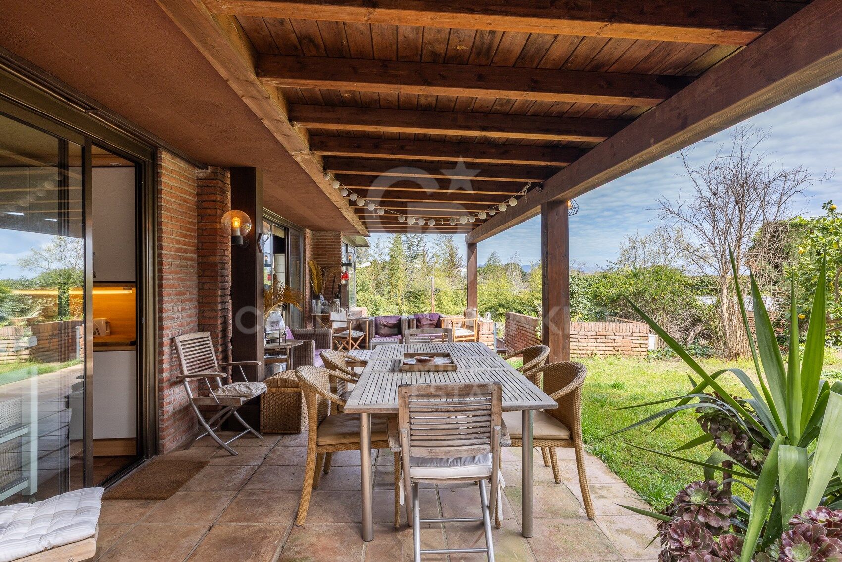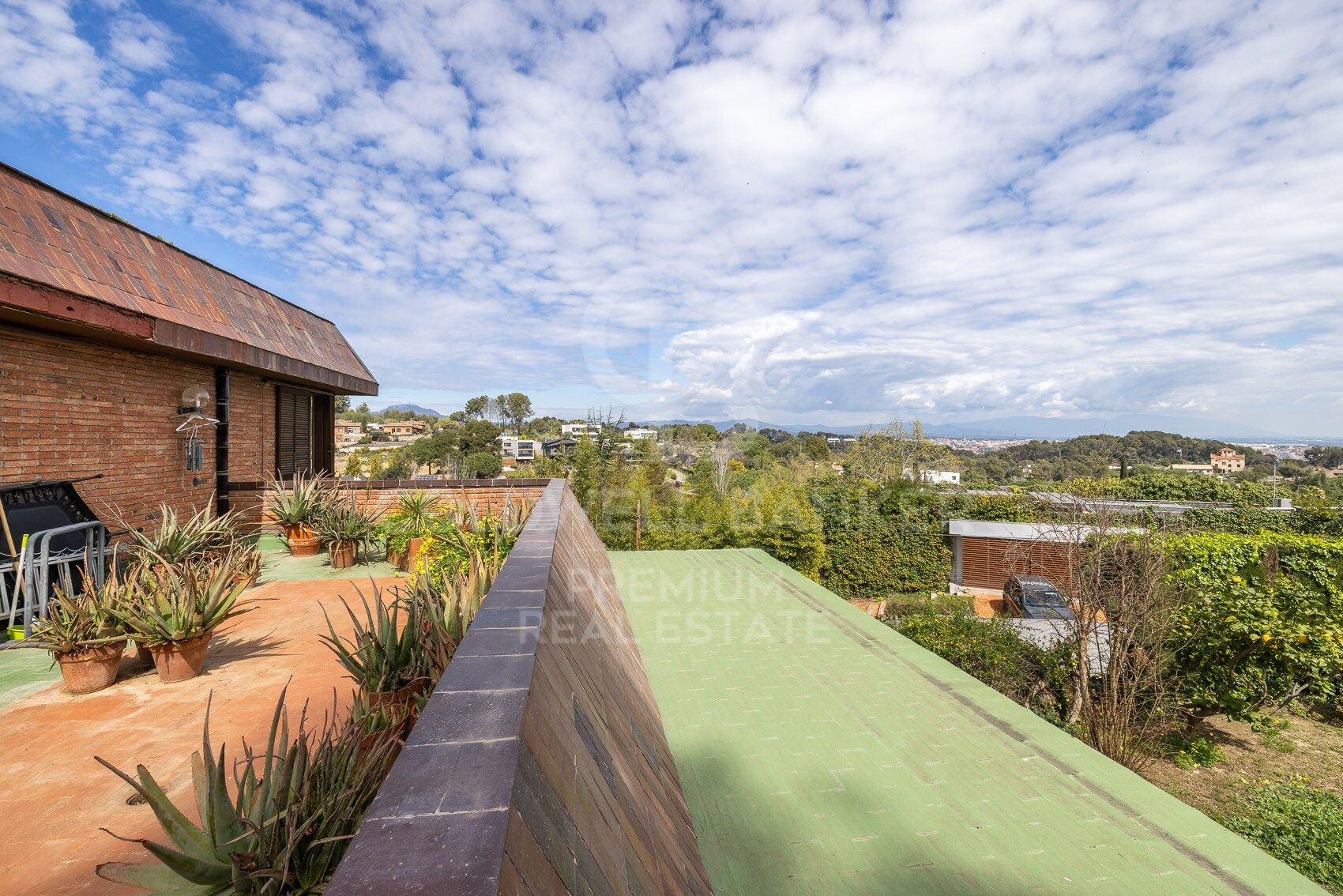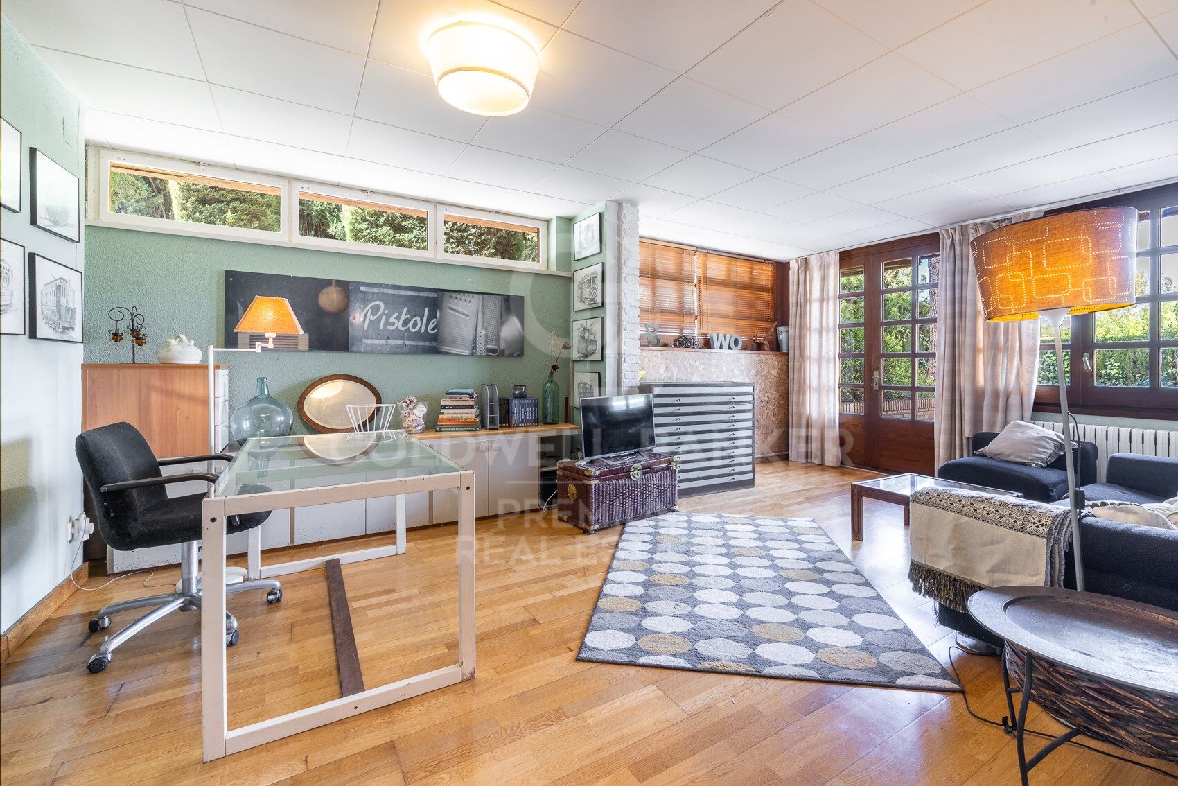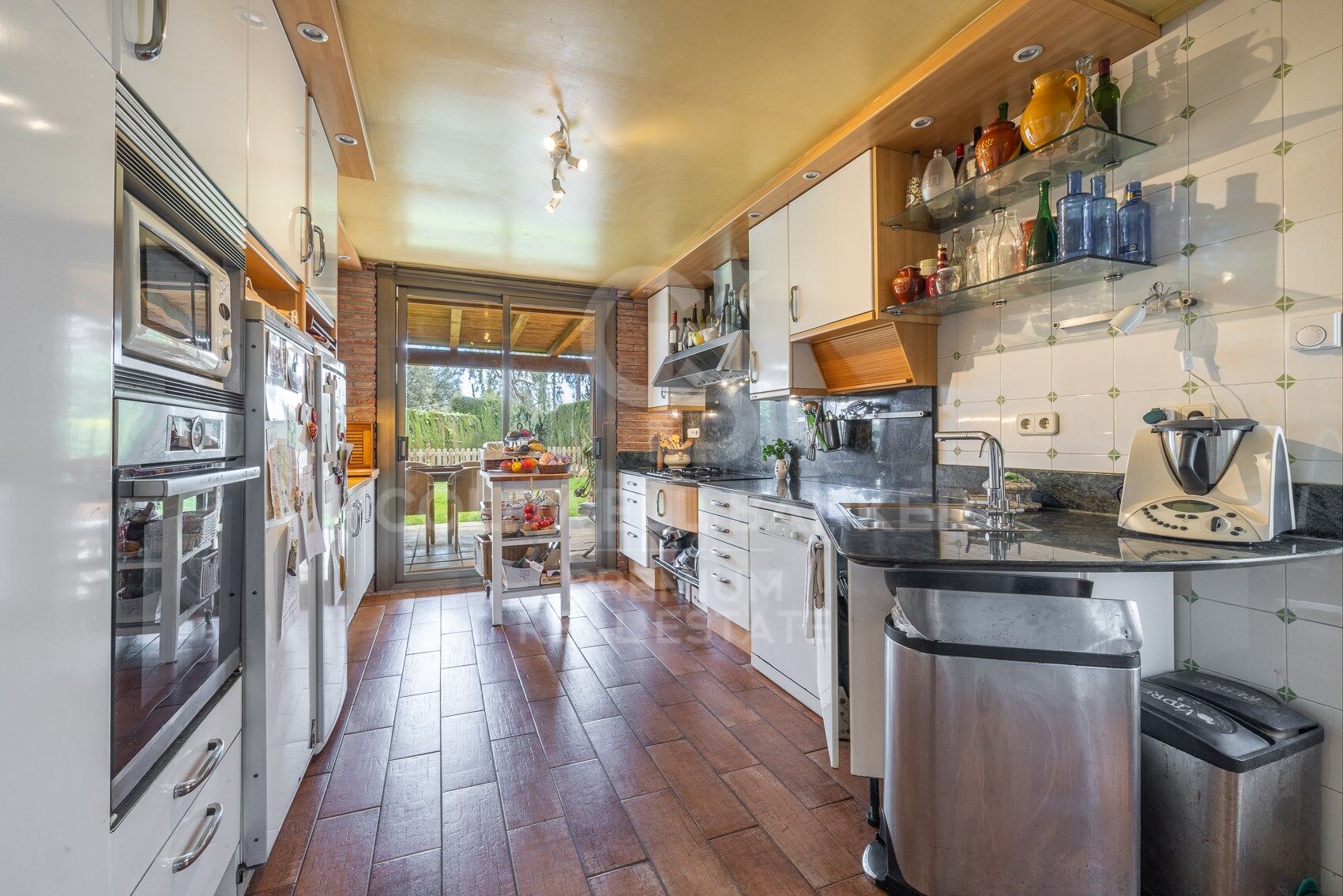 We are welcomed by a warm entrance hall that leads to a comfortable living room. The same large space houses the dining room. The living room also connects to the kitchen and, like the kitchen, has direct access to the garden through large sliding glass doors. Behind these doors is a practical terrace for outdoor lunches and dinners, with the beautiful pool in the background, leaving a large green space for a sunbathing area in between. The kitchen area is completed by a delightful office room with a bright window for breakfast and lunch. From the living room, we can also access an office with spectacular views of La Mola and Montseny. Returning to the entrance, we have access to the master bedroom with a dressing room and en suite bathroom, and another double bedroom with a walk-in closet. There is also a guest toilet and the stairs that lead to the remaining floors of the house.