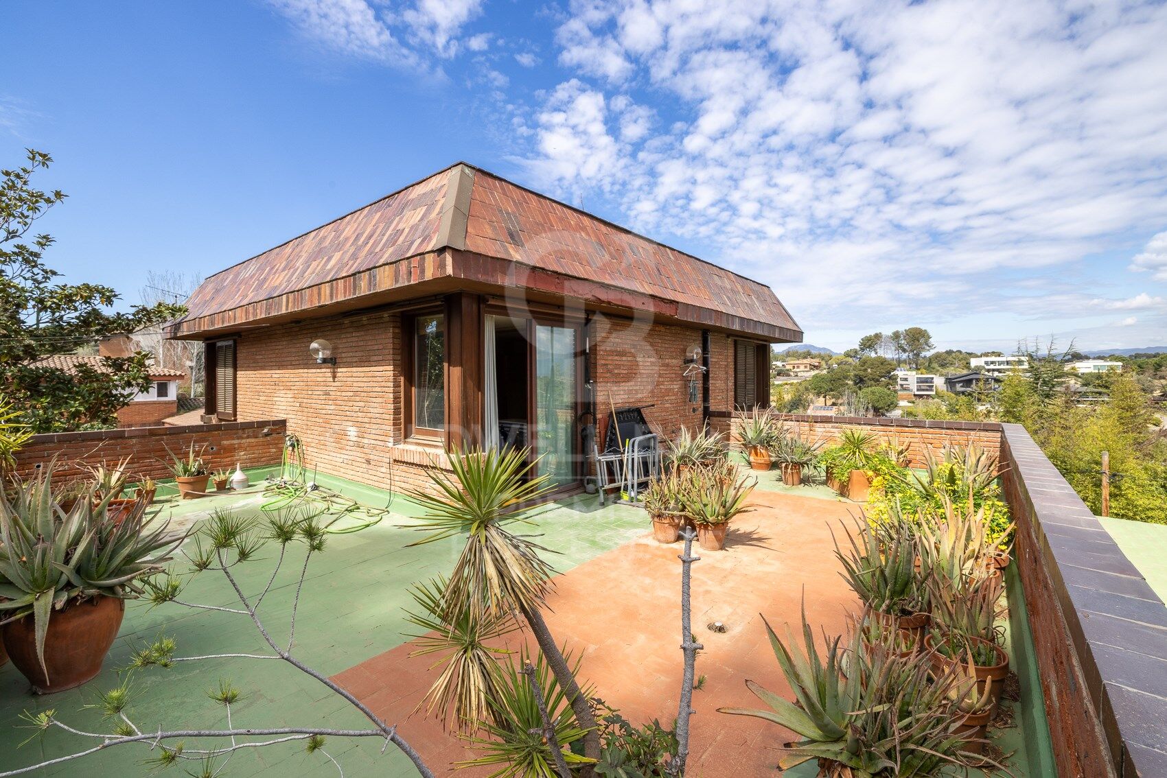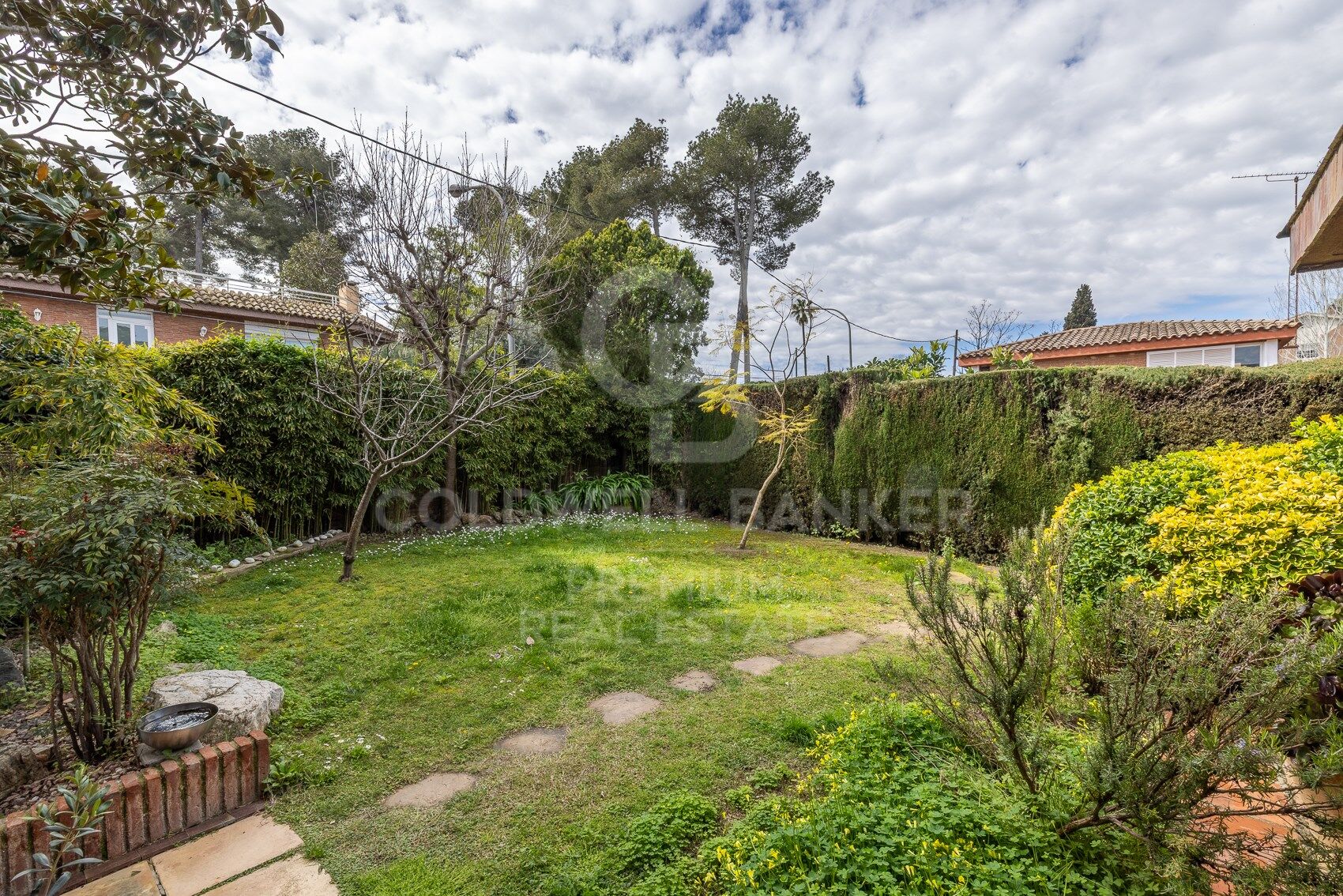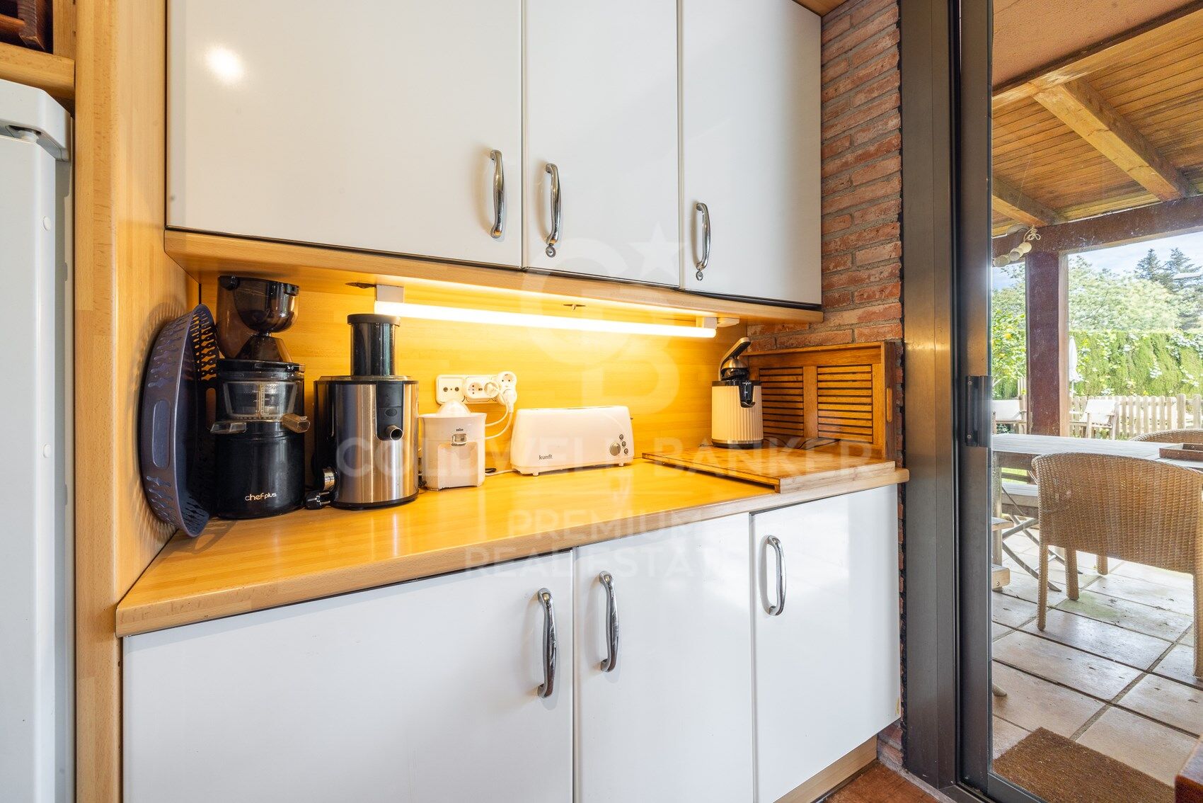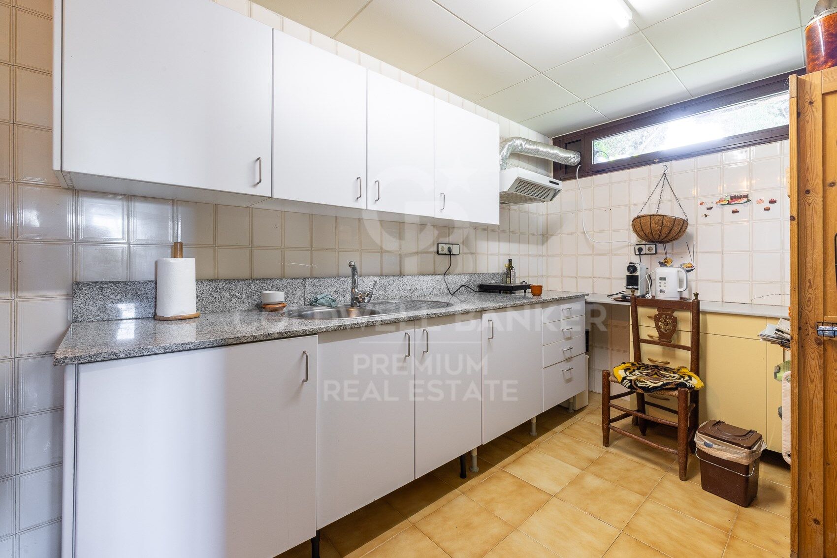 We are welcomed by a warm entrance hall that leads to a comfortable living room. The same large space houses the dining room. The living room also connects to the kitchen and, like the kitchen, has direct access to the garden through large sliding glass doors. Behind these doors is a practical terrace for outdoor lunches and dinners, with the beautiful pool in the background, leaving a large green space for a sunbathing area in between. The kitchen area is completed by a delightful office room with a bright window for breakfast and lunch. From the living room, we can also access an office with spectacular views of La Mola and Montseny. Returning to the entrance, we have access to the master bedroom with a dressing room and en suite bathroom, and another double bedroom with a walk-in closet. There is also a guest toilet and the stairs that lead to the remaining floors of the house.