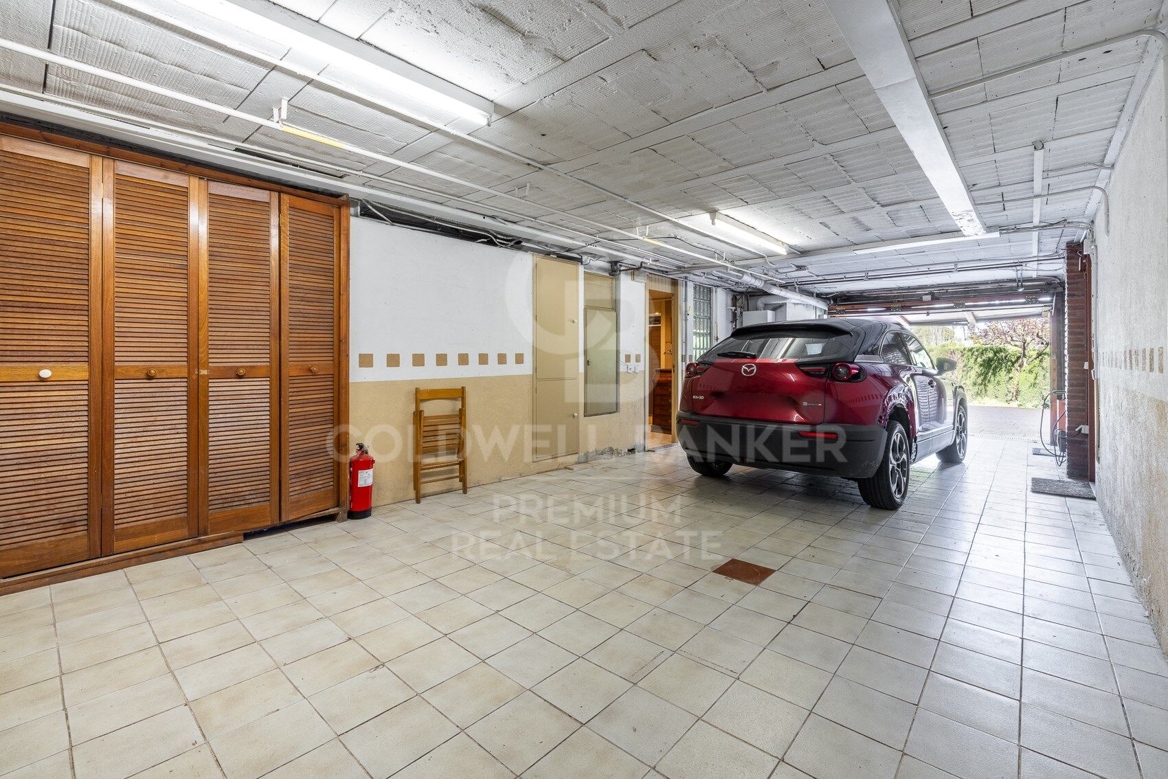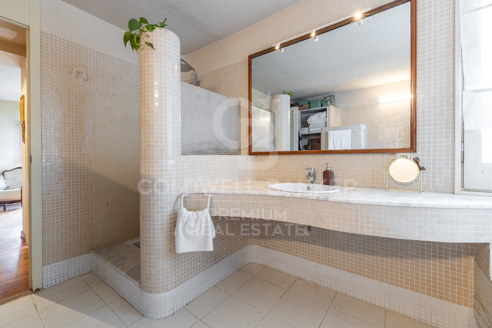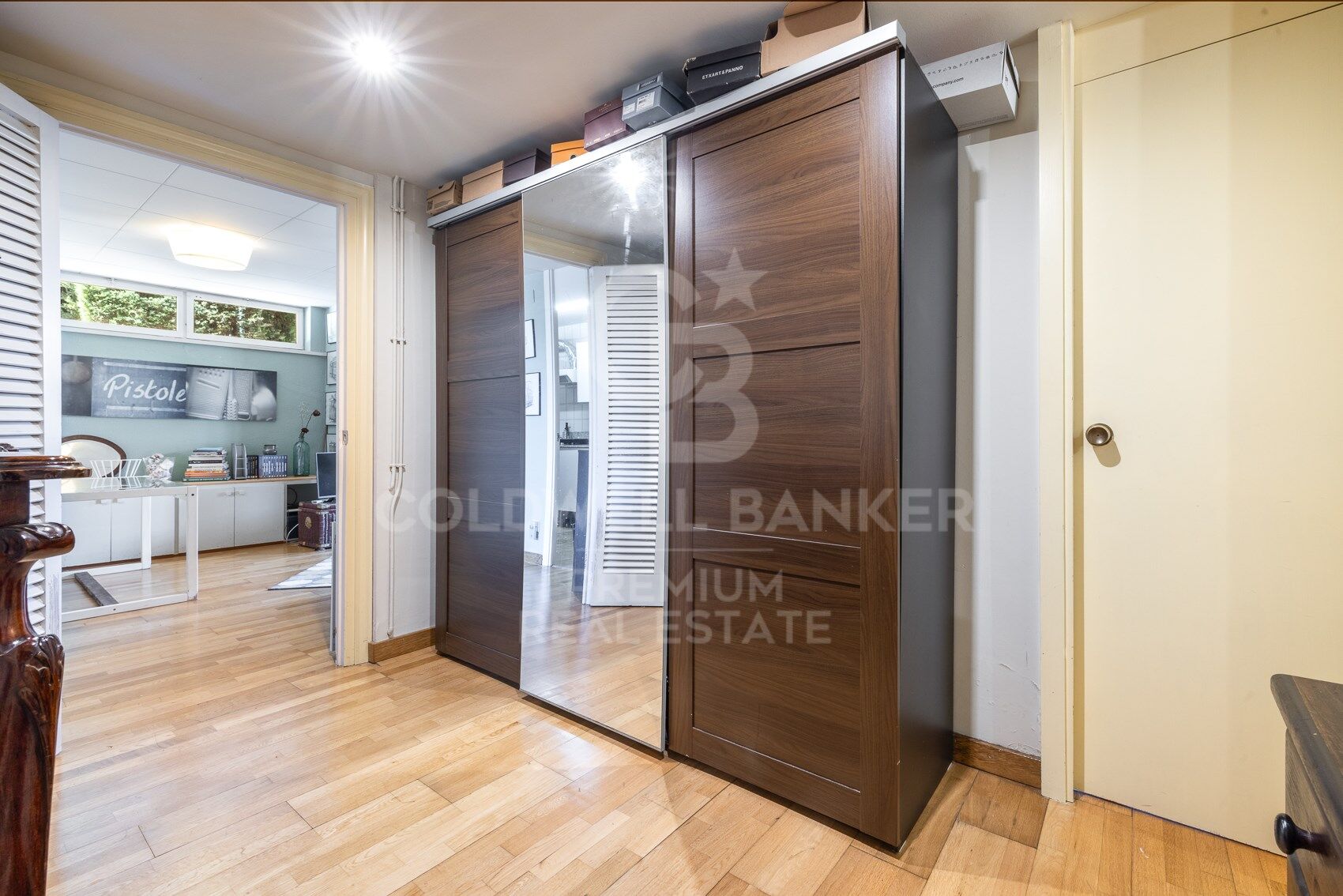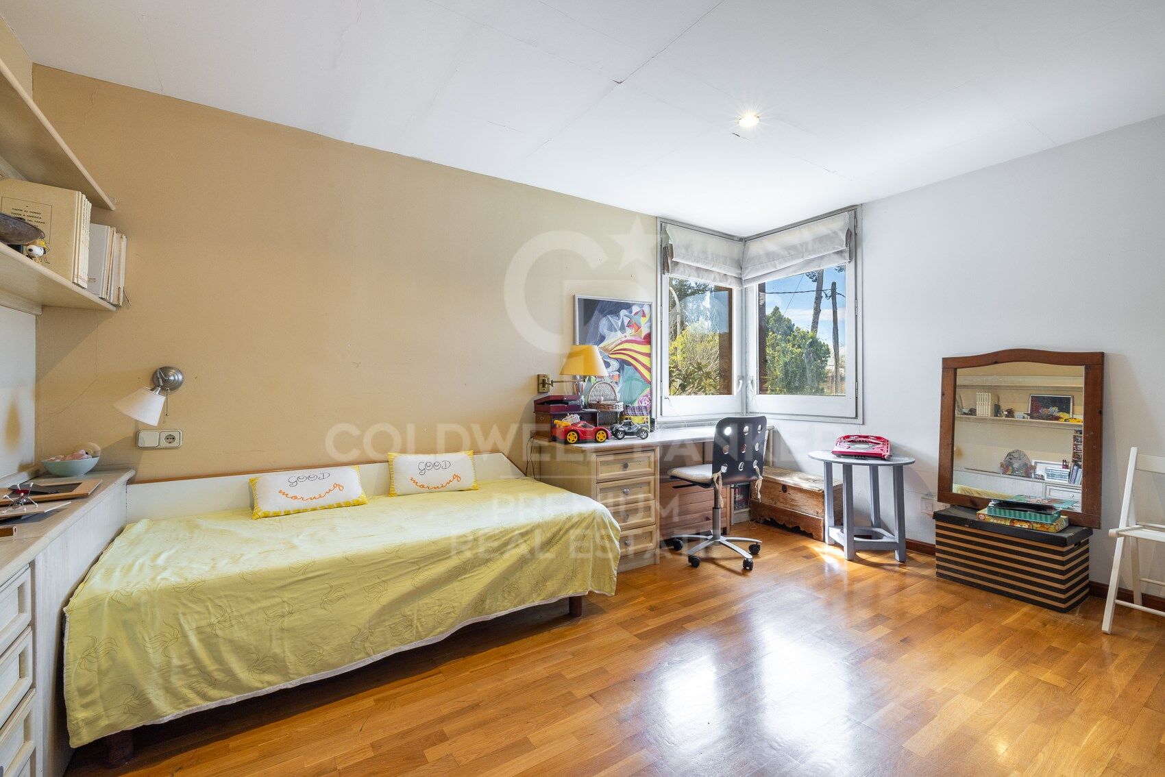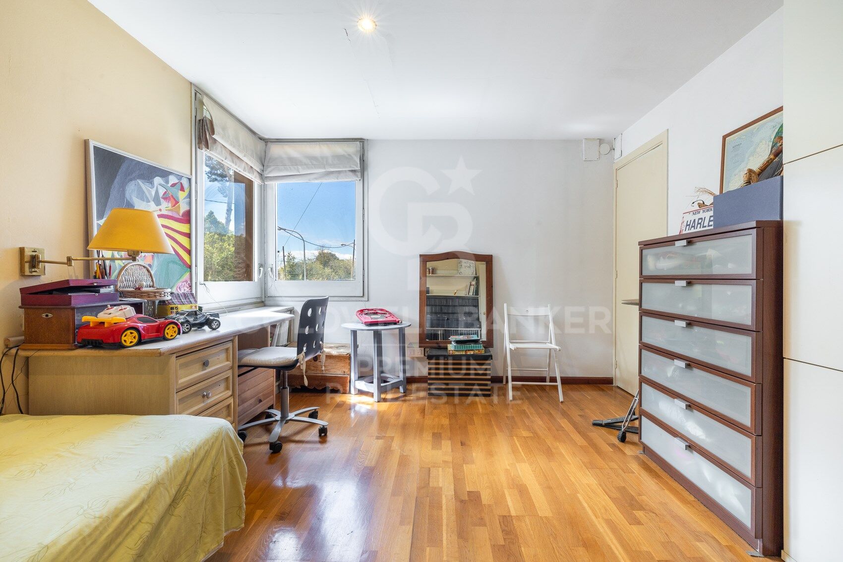 We are welcomed by a warm entrance hall that leads to a comfortable living room. The same large space houses the dining room. The living room also connects to the kitchen and, like the kitchen, has direct access to the garden through large sliding glass doors. Behind these doors is a practical terrace for outdoor lunches and dinners, with the beautiful pool in the background, leaving a large green space for a sunbathing area in between. The kitchen area is completed by a delightful office room with a bright window for breakfast and lunch. From the living room, we can also access an office with spectacular views of La Mola and Montseny. Returning to the entrance, we have access to the master bedroom with a dressing room and en suite bathroom, and another double bedroom with a walk-in closet. There is also a guest toilet and the stairs that lead to the remaining floors of the house.