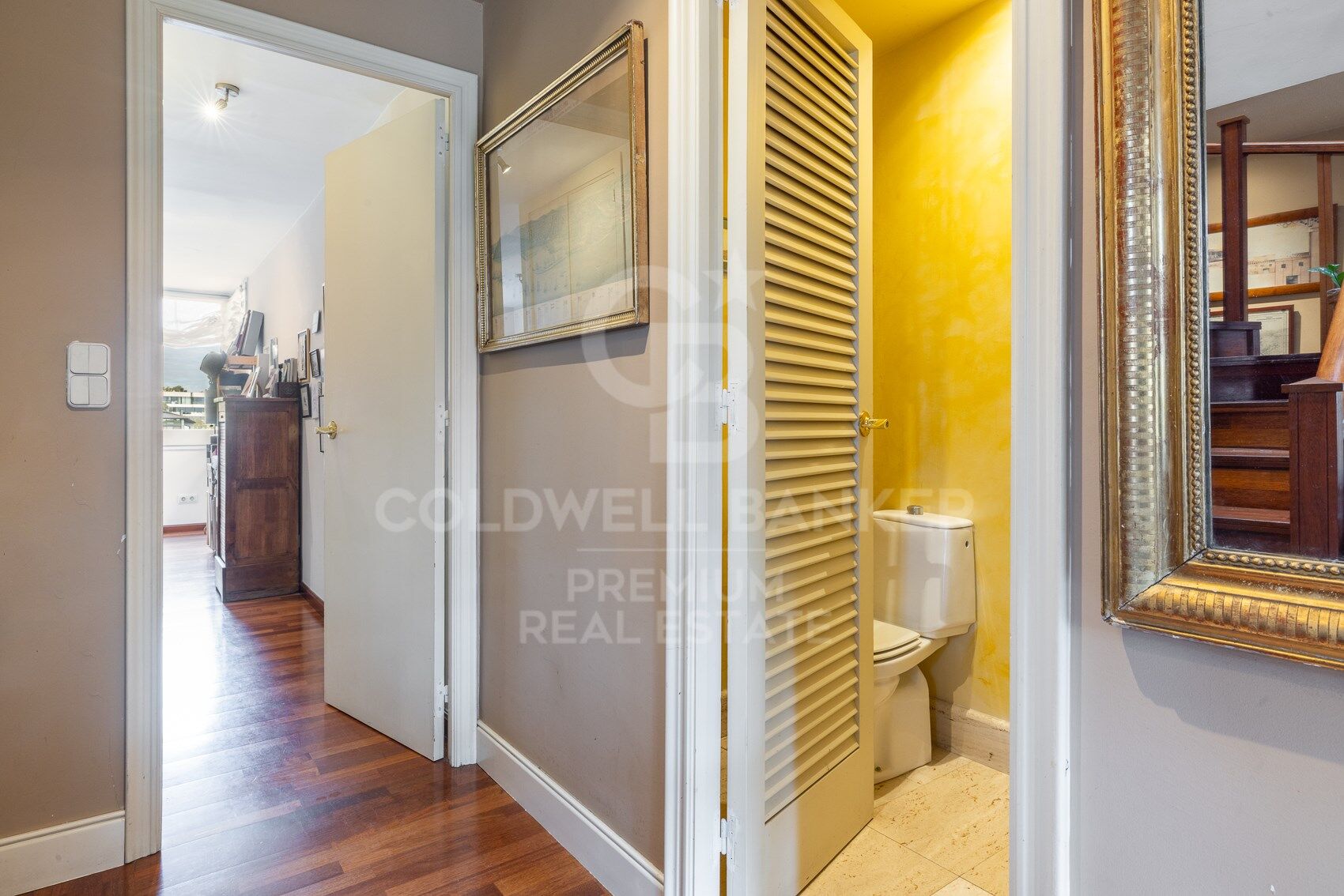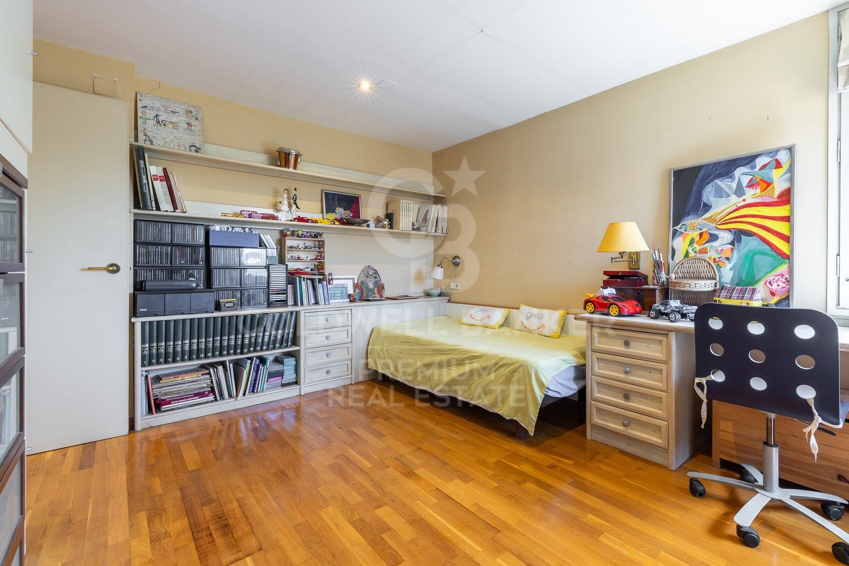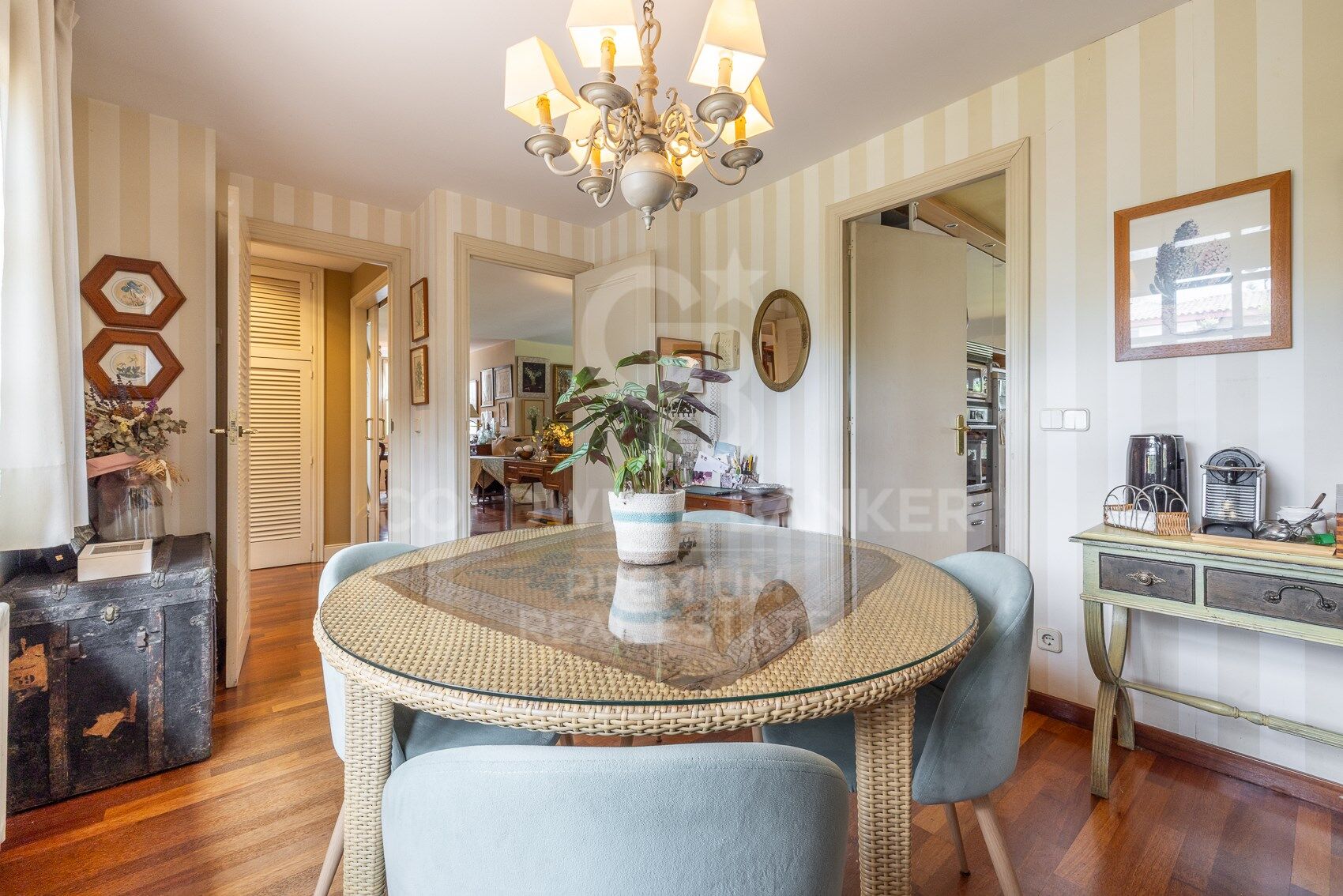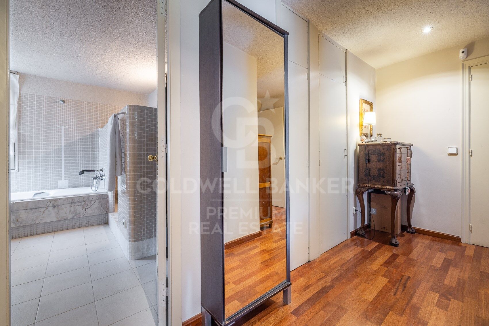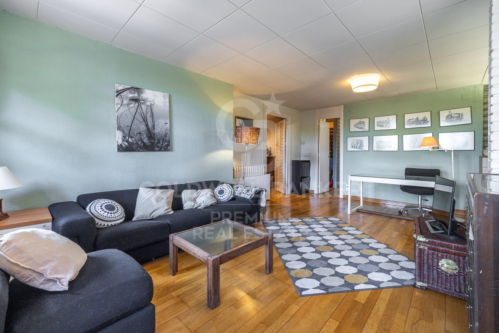 We are welcomed by a warm entrance hall that leads to a comfortable living room. The same large space houses the dining room. The living room also connects to the kitchen and, like the kitchen, has direct access to the garden through large sliding glass doors. Behind these doors is a practical terrace for outdoor lunches and dinners, with the beautiful pool in the background, leaving a large green space for a sunbathing area in between. The kitchen area is completed by a delightful office room with a bright window for breakfast and lunch. From the living room, we can also access an office with spectacular views of La Mola and Montseny. Returning to the entrance, we have access to the master bedroom with a dressing room and en suite bathroom, and another double bedroom with a walk-in closet. There is also a guest toilet and the stairs that lead to the remaining floors of the house.