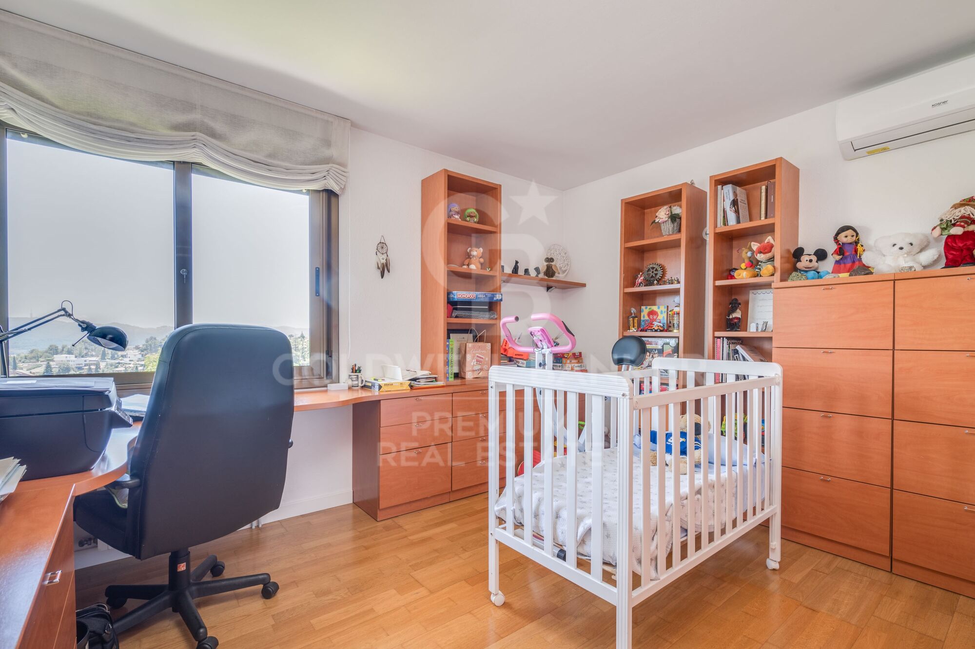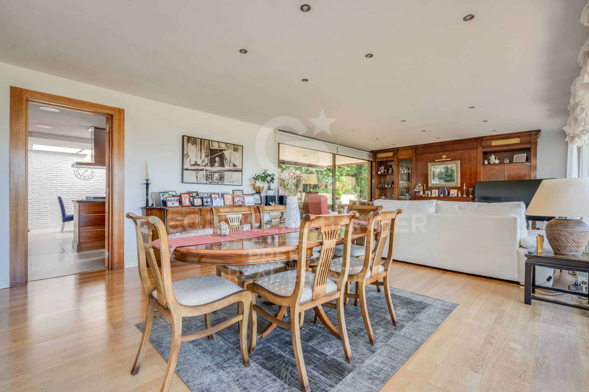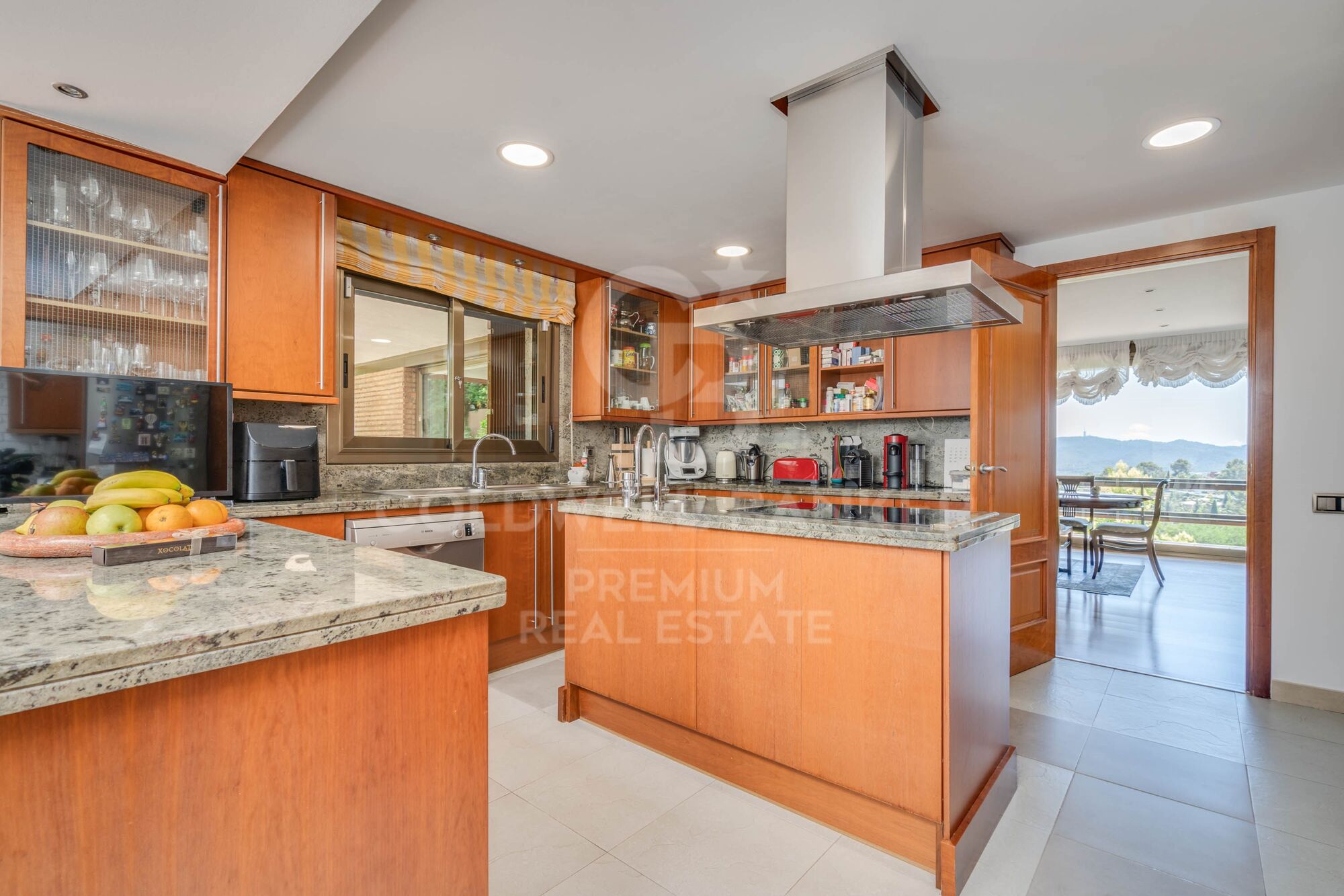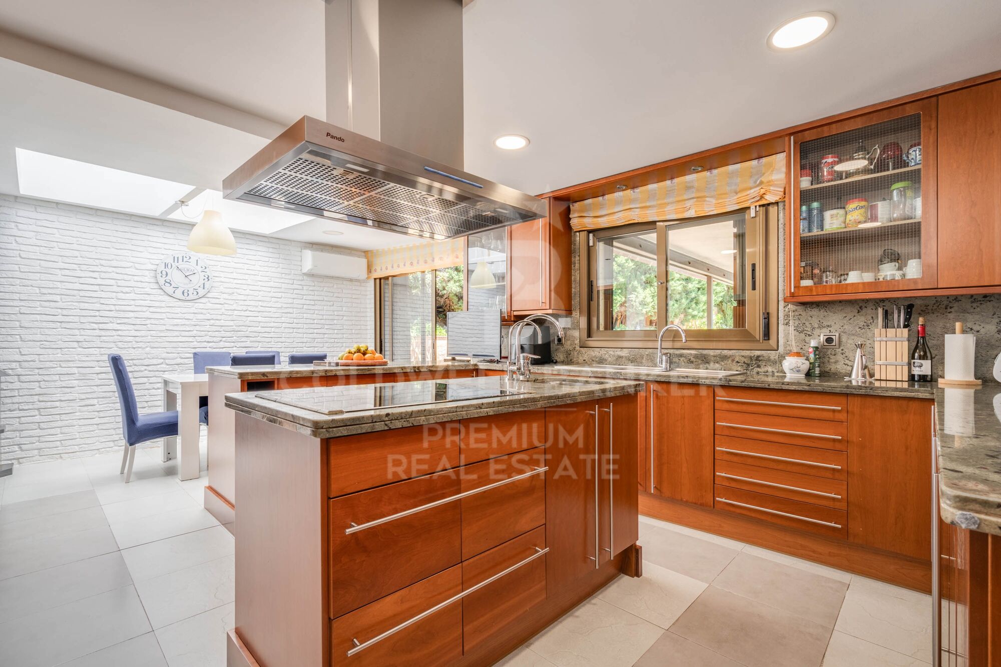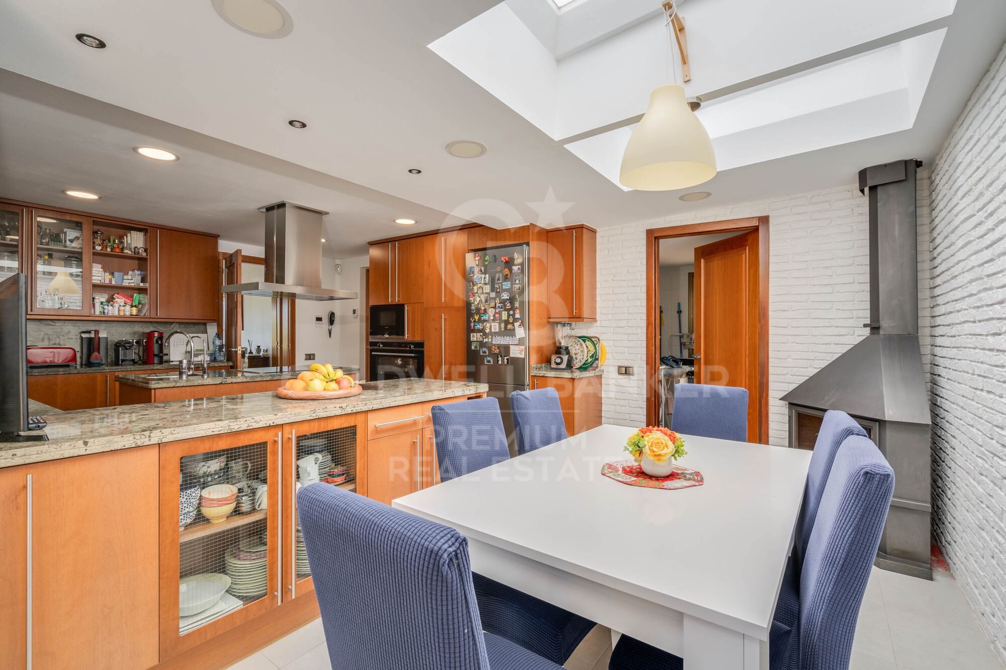 The living room connects to the bright kitchen with a central island and a large and cosy office area that will be the delight of our breakfasts, with a skylight and its own access to the pool. Connected to it is the laundry room and equipment.