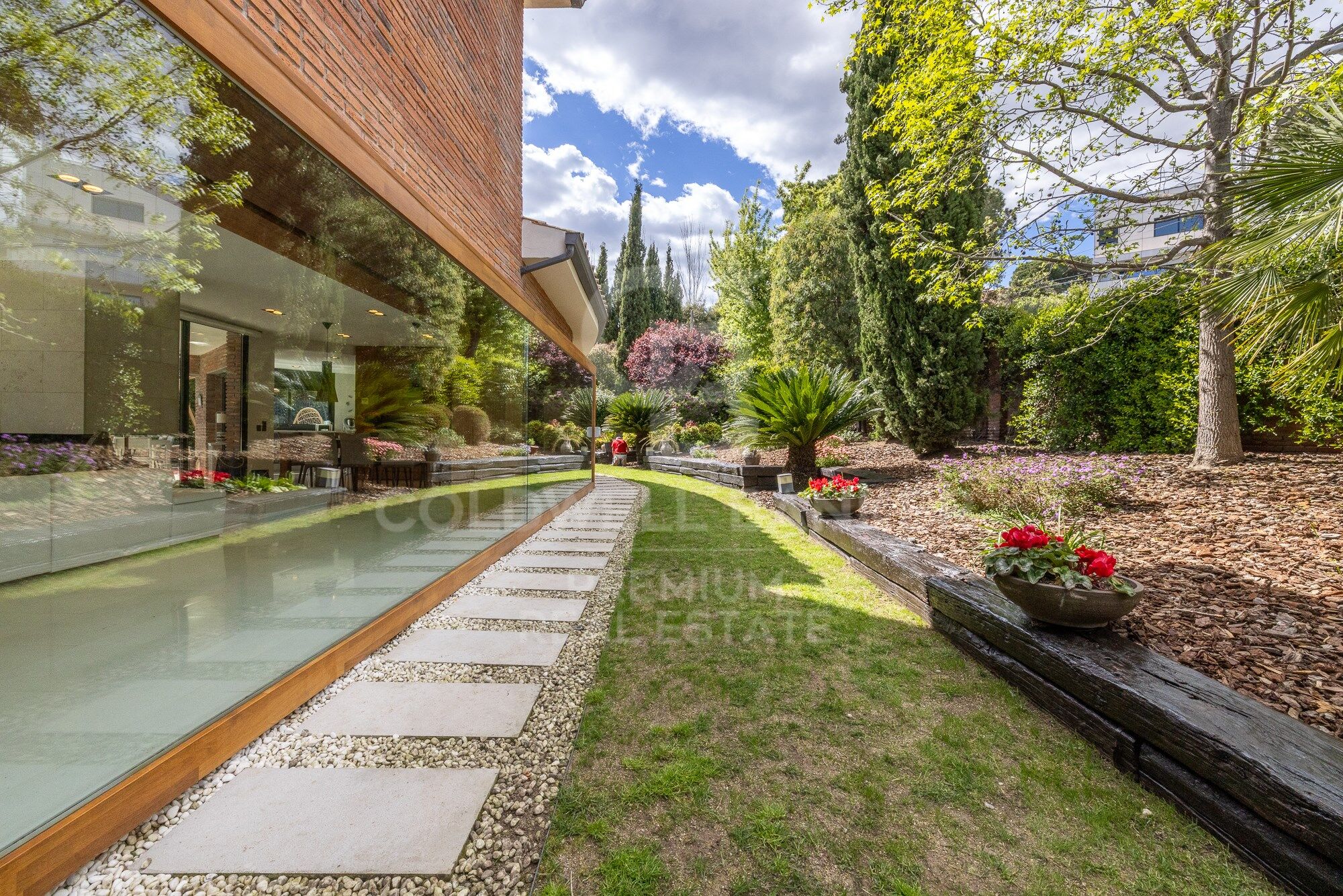 As we enter the property, we are greeted by a lush, well-kept garden. Before entering the home, a unique window opens up, revealing the interior. Once inside, we feel immersed in the garden thanks to the large glass openings on both sides. The hall, located in a central area of the floor plan, facilitates access and horizontal and vertical communication between the floors. It presents two distinct areas: a very spacious living room opens to the right, with the dining room and kitchen at the far end. The entire space is unified by a luminous, light-colored porcelain floor, highlighted by a large fireplace. Straight lines and fine materials are the key elements. There are no dividing walls, but rather panels and sliding doors that connect or separate all the rooms. The house exudes style, comfort, and functionality. Returning to the hall, just on the opposite side, we find a large private area consisting of a bedroom with a dressing room and en suite bathroom, and a separate living room, also accessible from the garden and pool. There is also an office and library. The stairs leading to the different floors are also located in this area. In the garden, the undisputed centerpiece is a never-ending infinity pool. Accompanying it is a large terrace perfectly equipped for the hottest summer days, ready to host the most special moments. A barbecue area, a large sun terrace, and a chill-out area complete the outdoor leisure area. Specifically, the garden underwent a major renovation, with a series of terraces that neutralize the unevenness of the garden and allow access to the entire plot and maximize the views.