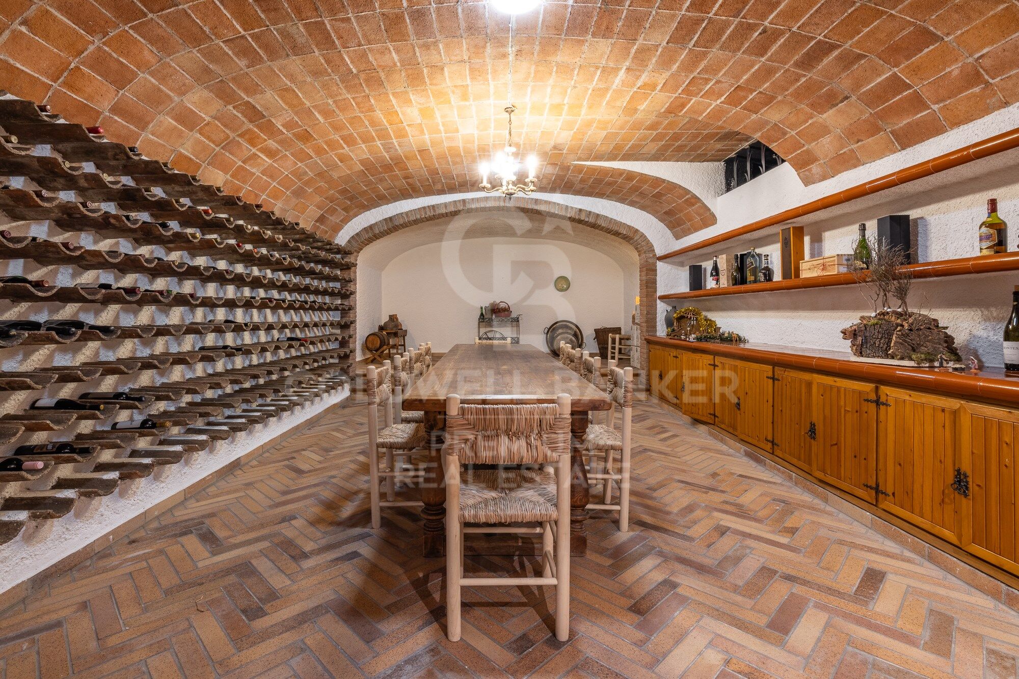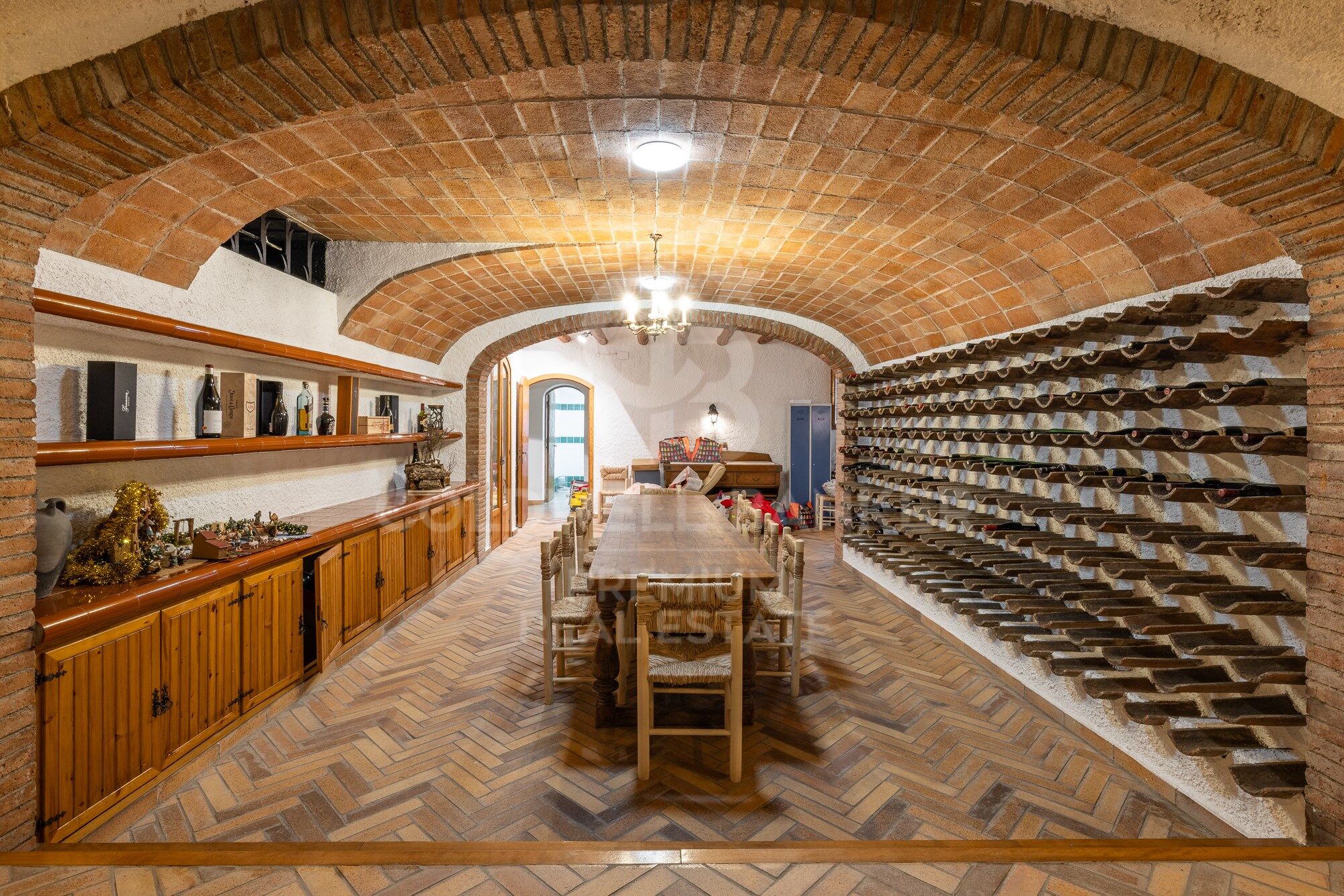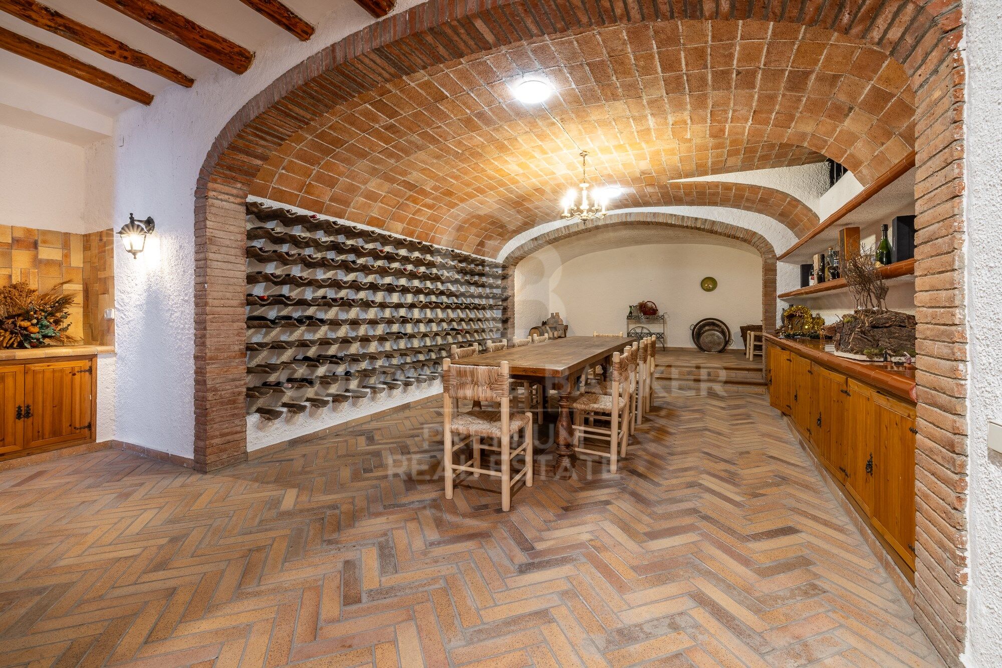 On the lower floor, we can enjoy the magnificent cellar, a beautiful piece of engineering and good taste for its arched ceiling that gives off sobriety and elegance. It also has a cinema room and a recording room, an equipped gym and a Hammam sauna, a room for pets and several rooms for storage. The lower floor is completed by the closed garage for 4 cars and a very large porch for 2 guest cars.