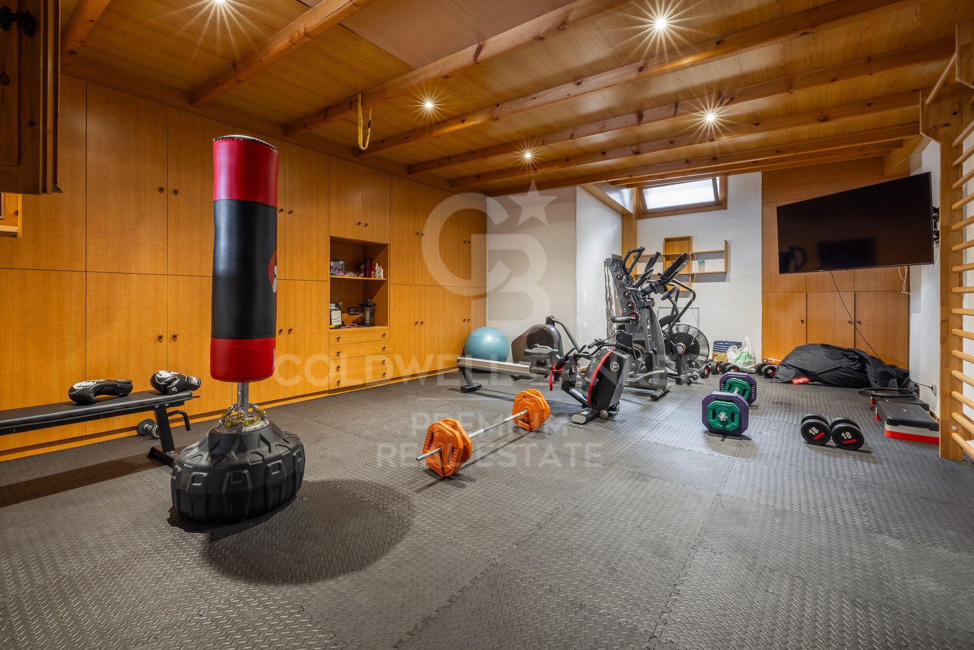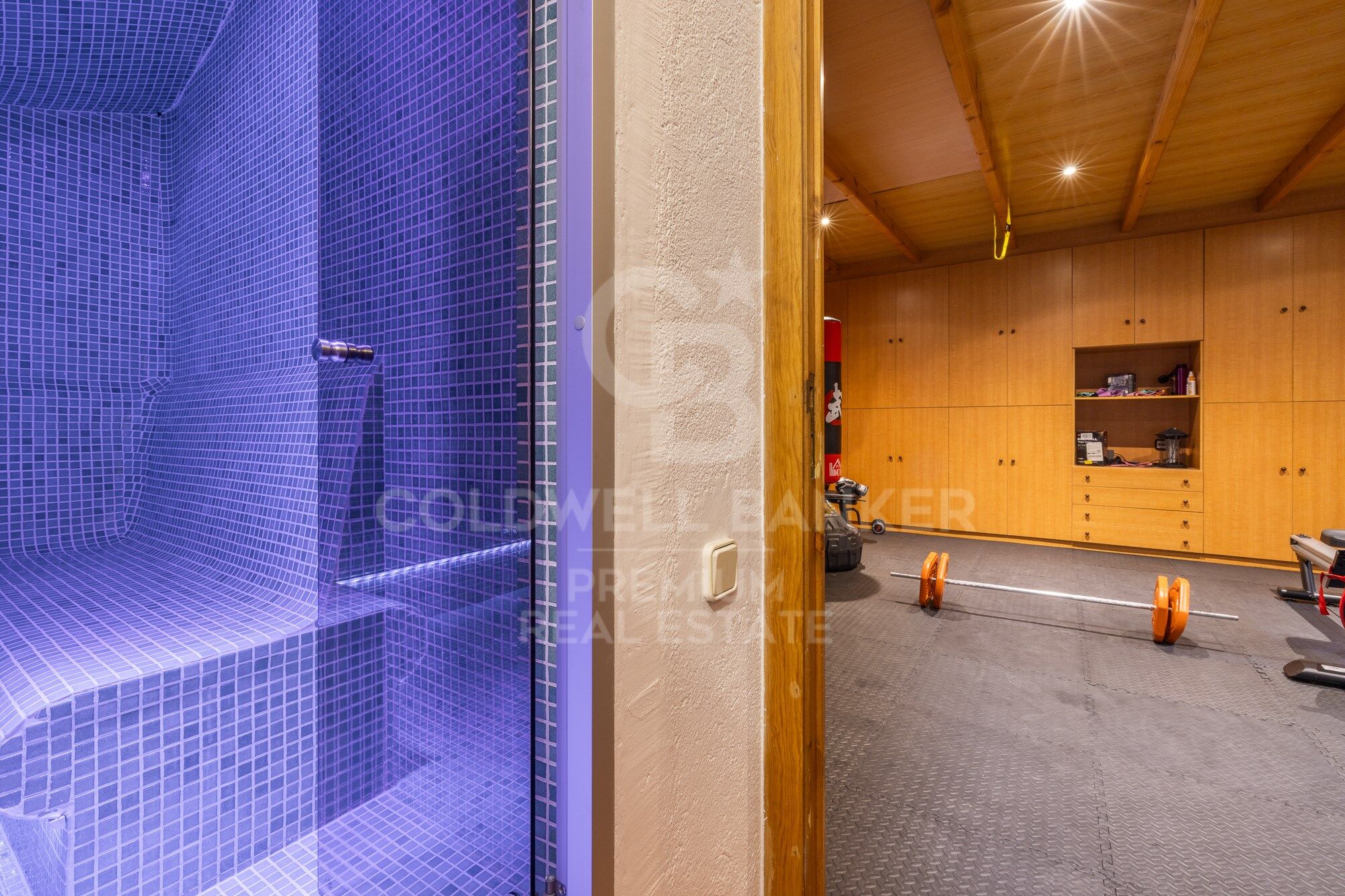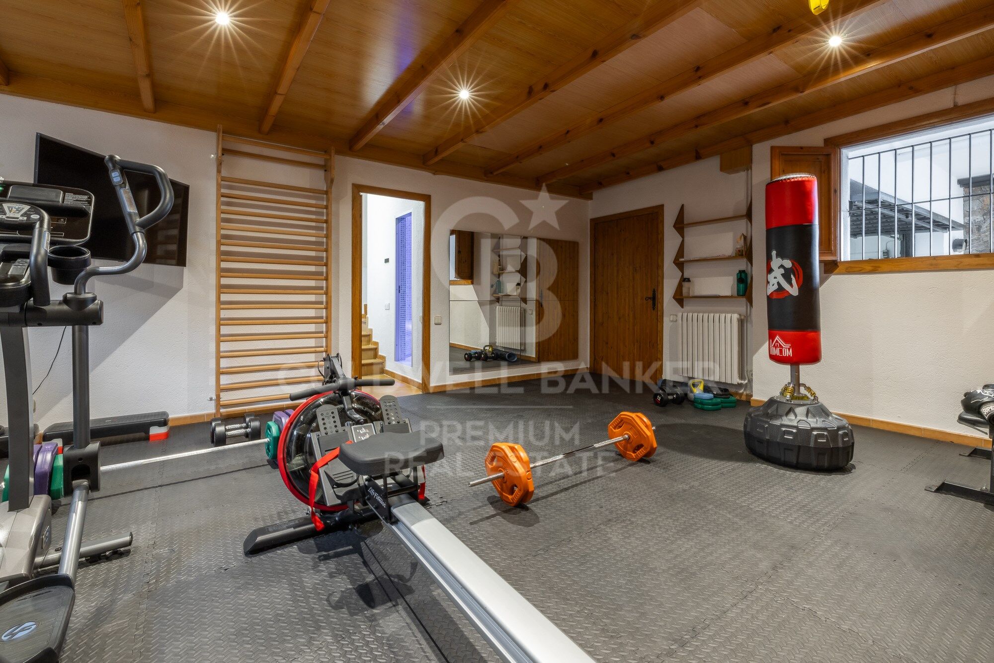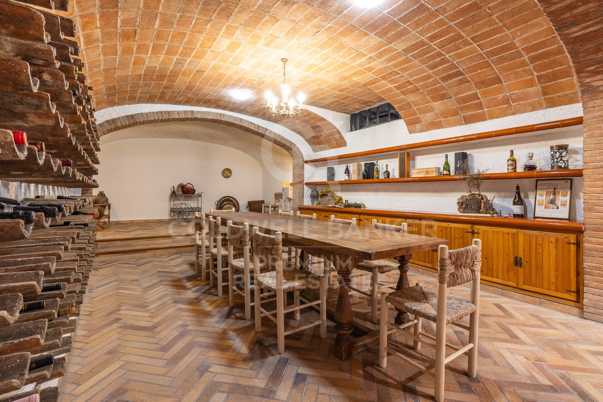 On the lower floor, we can enjoy the magnificent cellar, a beautiful piece of engineering and good taste for its arched ceiling that gives off sobriety and elegance. It also has a cinema room and a recording room, an equipped gym and a Hammam sauna, a room for pets and several rooms for storage. The lower floor is completed by the closed garage for 4 cars and a very large porch for 2 guest cars.