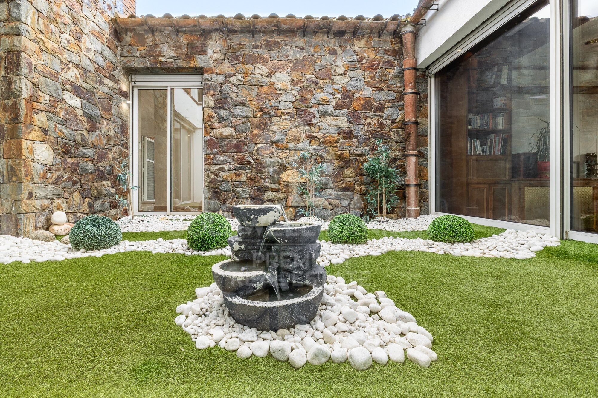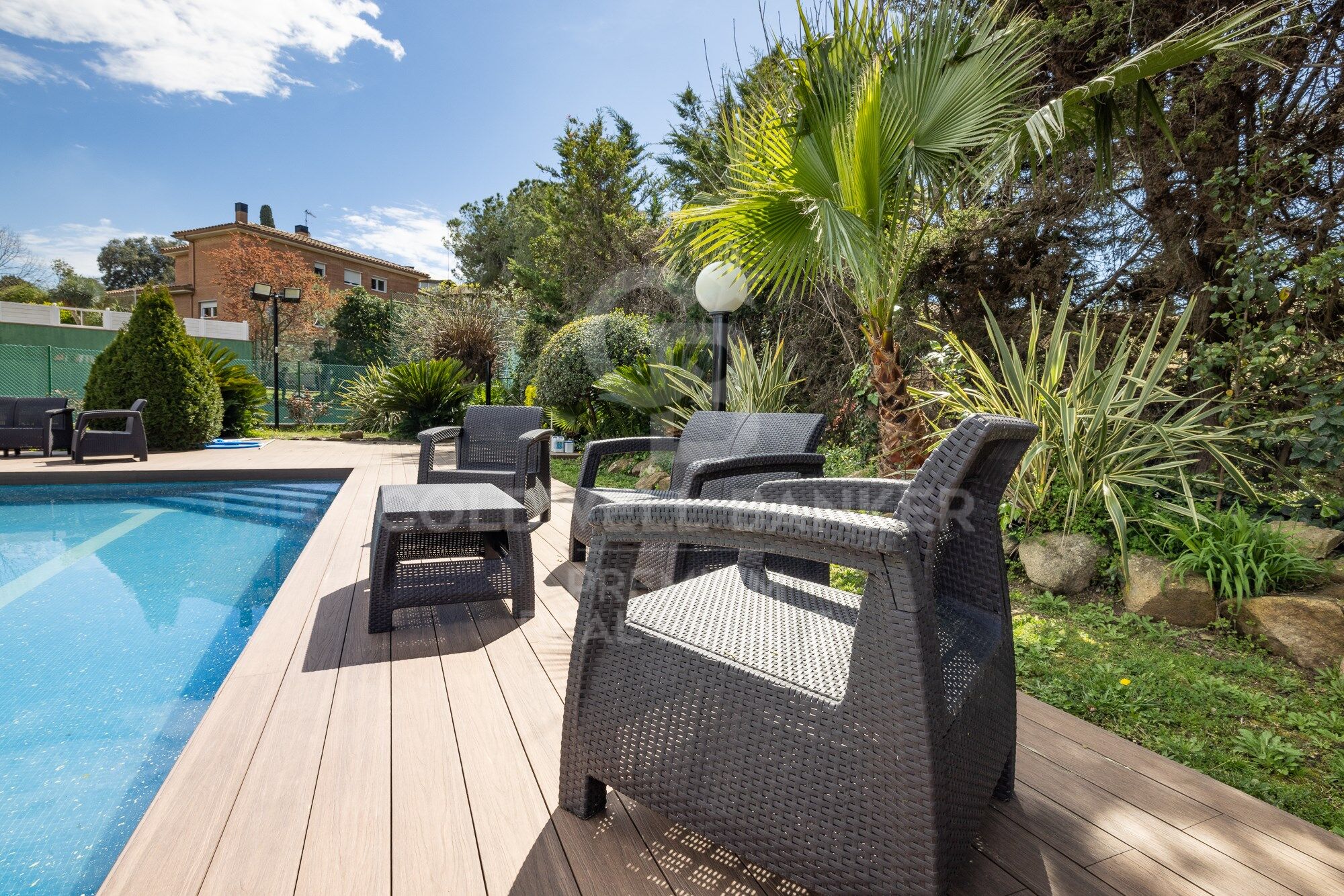 A century-old olive tree welcomes us. We access the house and a large hall separates the common areas from the rest of the rooms. On the right we access a first living room that allows us to see the immense expanse of grass that leads to the pool, all at the same level and the lush vegetation that crowns its entire perimeter. From this living room we can go out to a pleasant porch that hosts a summer dining room. Returning to the interior, there is the main living room with a magnificent fireplace from where we do not lose sight of the entire garden through the large glazing. The other main protagonist is a beautiful interior patio that floods the entire area with light. Next we have the dining room that shares an interior patio. From here we connect to the kitchen and also access the night area. The kitchen is very large and is complemented by a laundry and ironing room. From the kitchen we can go out to a terrace for breakfast and meals equipped with a barbecue. The night area is distributed along the glazed central patio. We have 5 bedrooms and three bathrooms and have independent access to the garden.