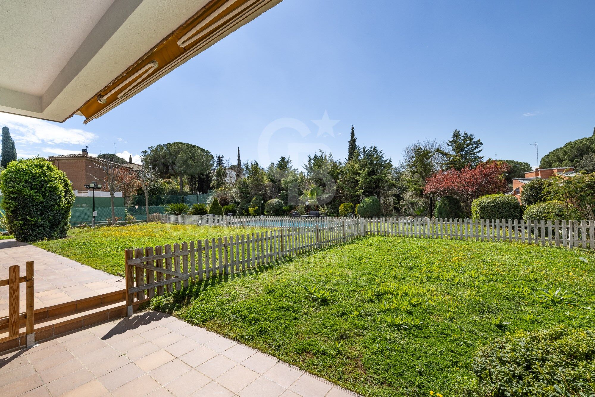On the upper floor there is a beautiful living room with a fireplace and a terrace where you can see the whole garden, swimming pool and tennis court. In addition to two bedrooms, one of them with an en suite bathroom.