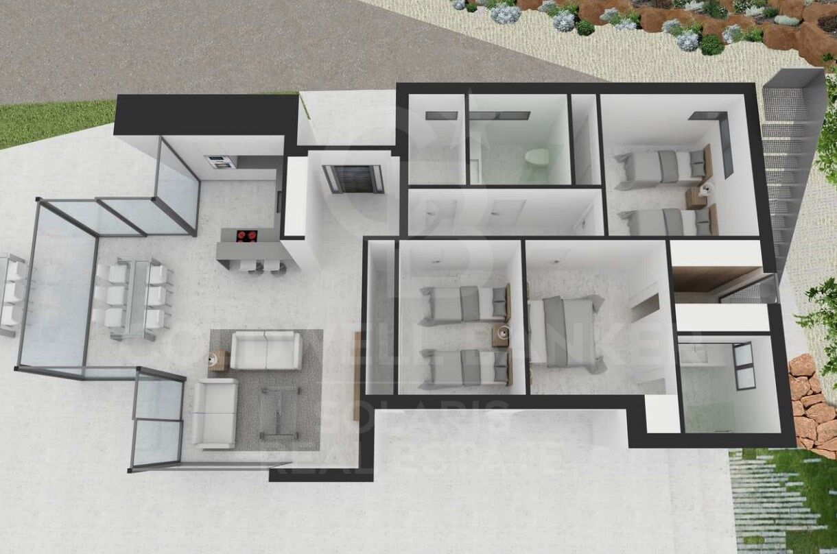 La propuesta arquitectónica plantea una vivienda moderna y luminosa, de líneas depuradas y grandes ventanales que favorecen la entrada de luz natural. Diseñada para integrarse en el entorno, utiliza materiales de alta calidad, asegurando eficiencia energética, máximo confort y un estilo contemporáneo exclusivo.