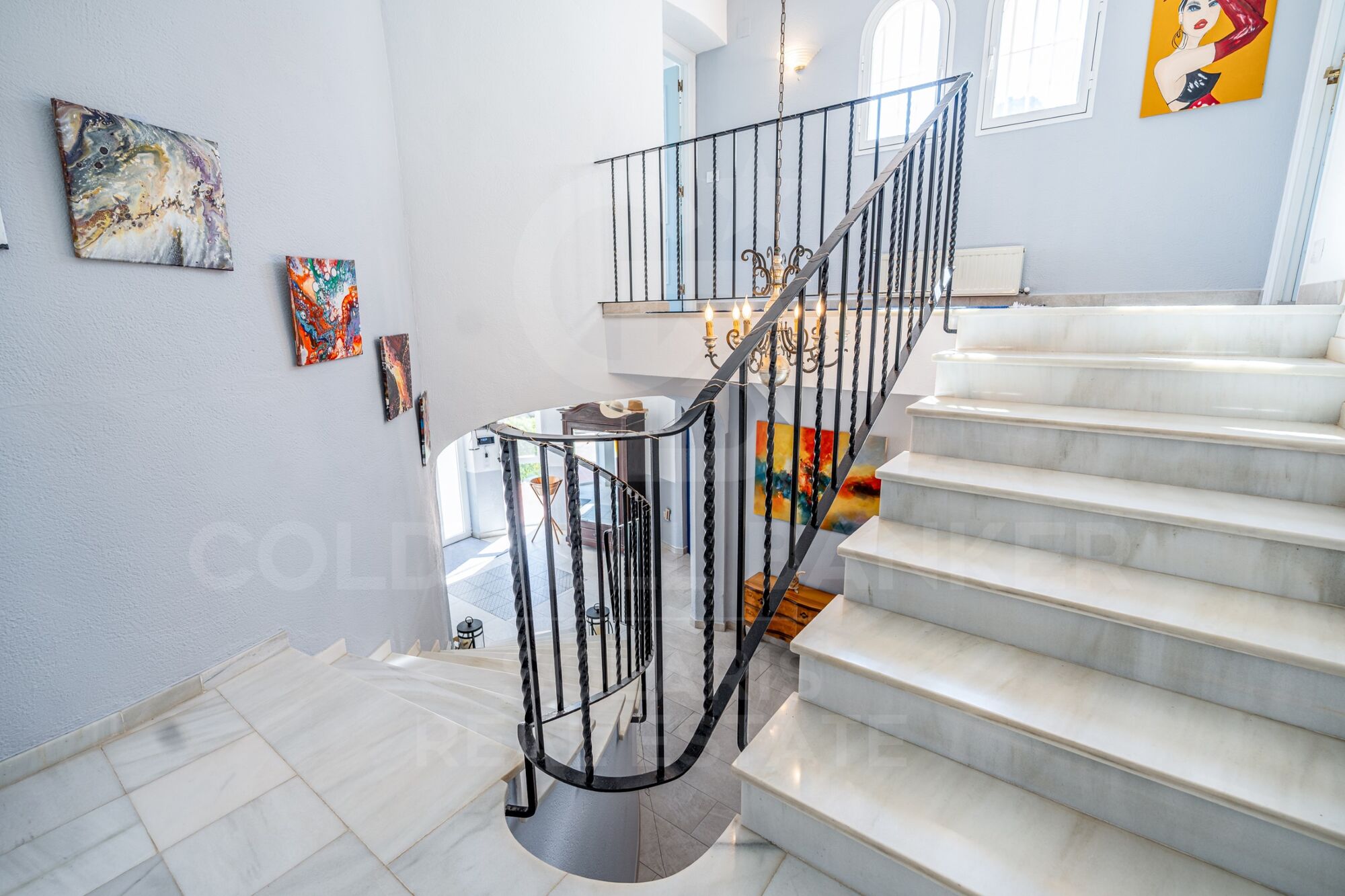 The main house welcomes with a distinguished lobby that marks the character of the property. A refined marble staircase leads to the upper floor, where the master suite is located: an intimate and bright space with a private terrace, separate dressing room and a bathroom designed to enjoy the views in total comfort.