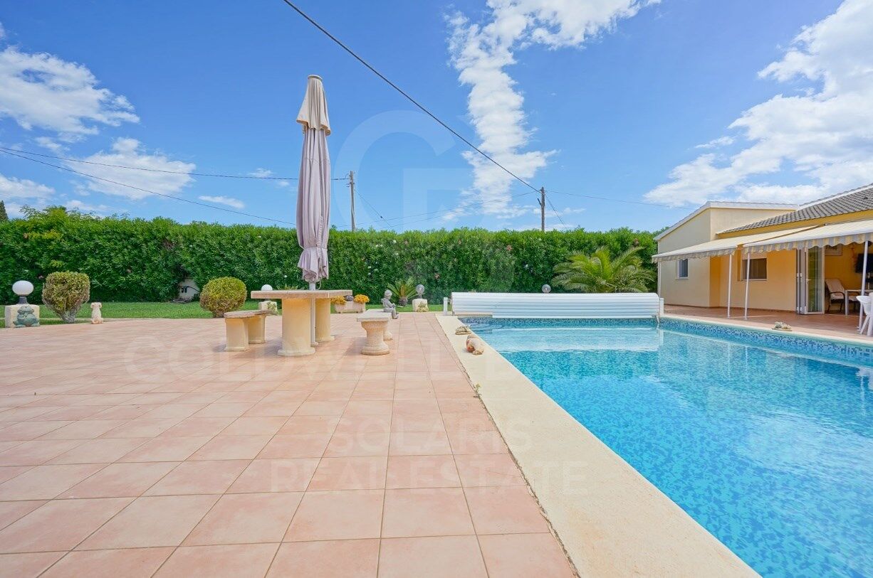 Esta encantadora villa se encuentra en una parcela llana y muy soleada de 2000 m², en una zona tranquila y residencial, muy cerca del centro de Els Poblets y a tan solo un kilómetro del mar y la playa.