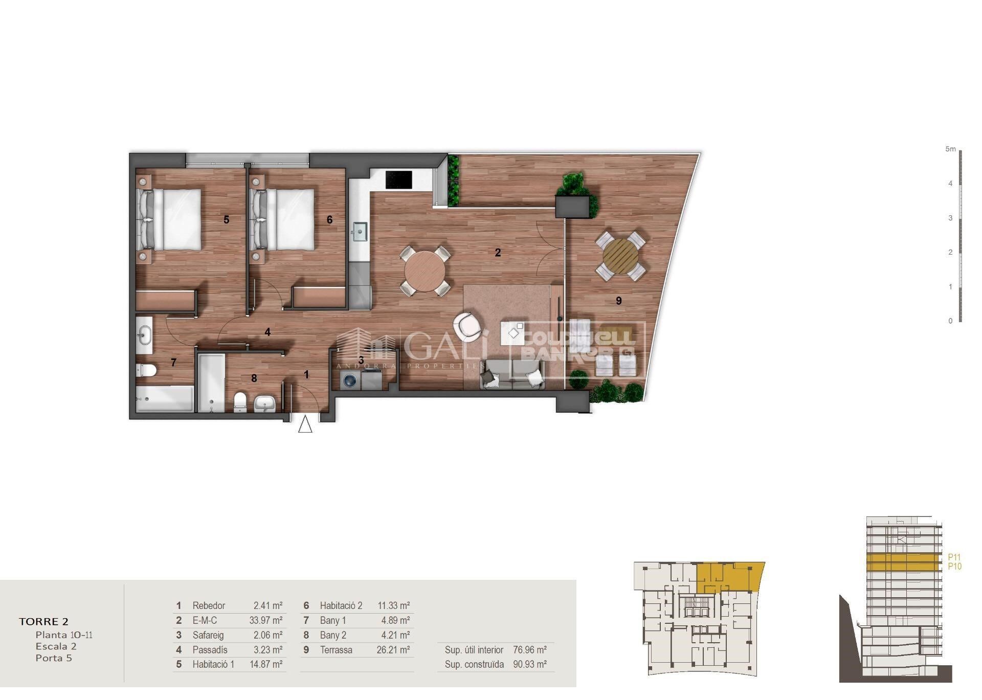 Exclusive promotion of living in the center of Escaldes-Engordany, 500 meters from the economic and social center of Principado.~~It is a 123 m2 apartment plus 47 m2 of terrace. It consists of 3 rooms. One double suite type and the other two normal. All of them with built-in wardrobes. Kitchen open to the dining room and practical laundry area.~~Located in a unique enclave, its homes will have spectacular panoramic views over the Andorra Valley and Escaldes, and sun all year round.~~The second tower on the market, 15 stories high, is made up of 68 homes with 1 to 4 bedrooms. All rooms are exterior, with perimeter terraces.~~You will find homes of various types and lengths, very bright and functional, with modern design, perimeter terraces and high-end finishes.~~It is worth noting in this promotion the fantastic community areas with heated indoor pool, gym, garden areas and solarium (for the exclusive use of the owners). The owners will also be able to enjoy exclusive direct access to the Falgueró and Rec del Solà paths.~~Regarding the FINISHES AND QUALITIES of the homes, we would highlight:~- EXTERIOR CARPENTRY in aluminum with SCHUCO type thermal break or similar.~- Triple glass with double air chamber adapted to energy requirements.~- Stoneware flooring, with two finishing options to be chosen by the client.~- built-in cabinets of the Carré brand or similar~- Open KITCHENS with Neolith, Silestone or similar countertops, equipped with a 'BORA' type surface extractor fan incorporated into the hob, induction hob, oven, microwave, fridge and dishwasher from SIEMEMS or similar. Wall and base units of the Santos or similar brand, combining a solid color with an imitation wood finish. Extendable faucet.~- BATHROOMS with walls covered with top quality ceramics. Equipped with furniture with drawer and embedded sink. Hansgrohe or similar regulating taps, glass partition and mirror. Built-in shower 'rain' effect~- AIR CONDITIONING AND RENEWAL:~ * ACS production system and centralized air conditioning connected to~ FEDA ECOTERM.~ * Underfloor heating system throughout the house.~ * Air conditioning with cold air throughout the house except in bathrooms, through~ air ducts integrated into the false ceiling with supply and extraction.~ * Renewal of airer with double flow system with compact equipment~ with Siber or similar brand heat recuperator. Individualized equipment~ for each house.~- ELECTRICAL INSTALLATION:~ * Spotlights integrated into the false ceiling in bathrooms, laundry and kitchen.~ * LED strip lighting in the hallway and other rooms.~ * HOME AUTOMATION: home climate control system.~~With the possibility of buying parking spaces and storage rooms in the same building.~~Do not hesitate to contact us to clarify any questions and have additional information.~~Expected completion date: last quarter 2027. #ref:04103/5210