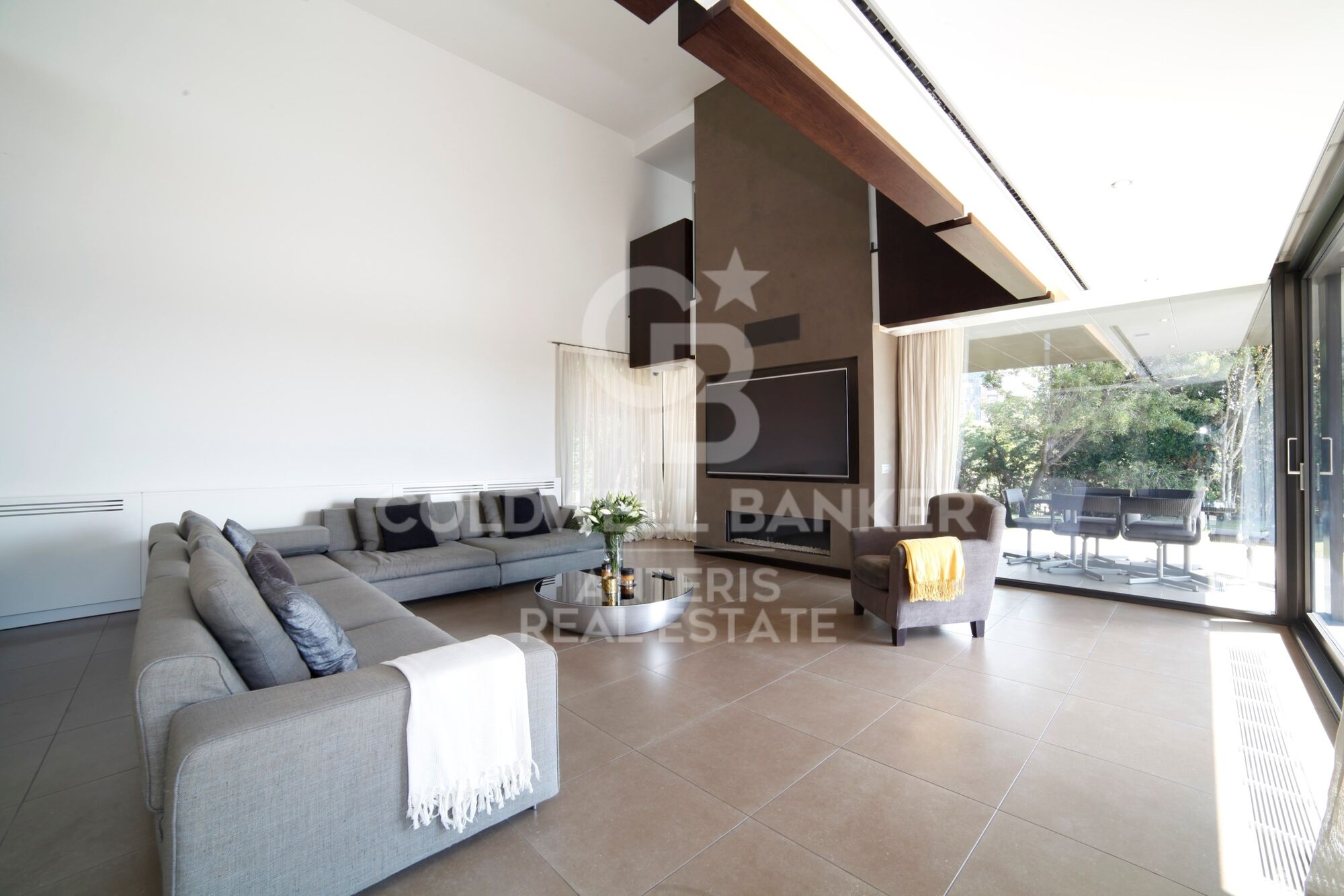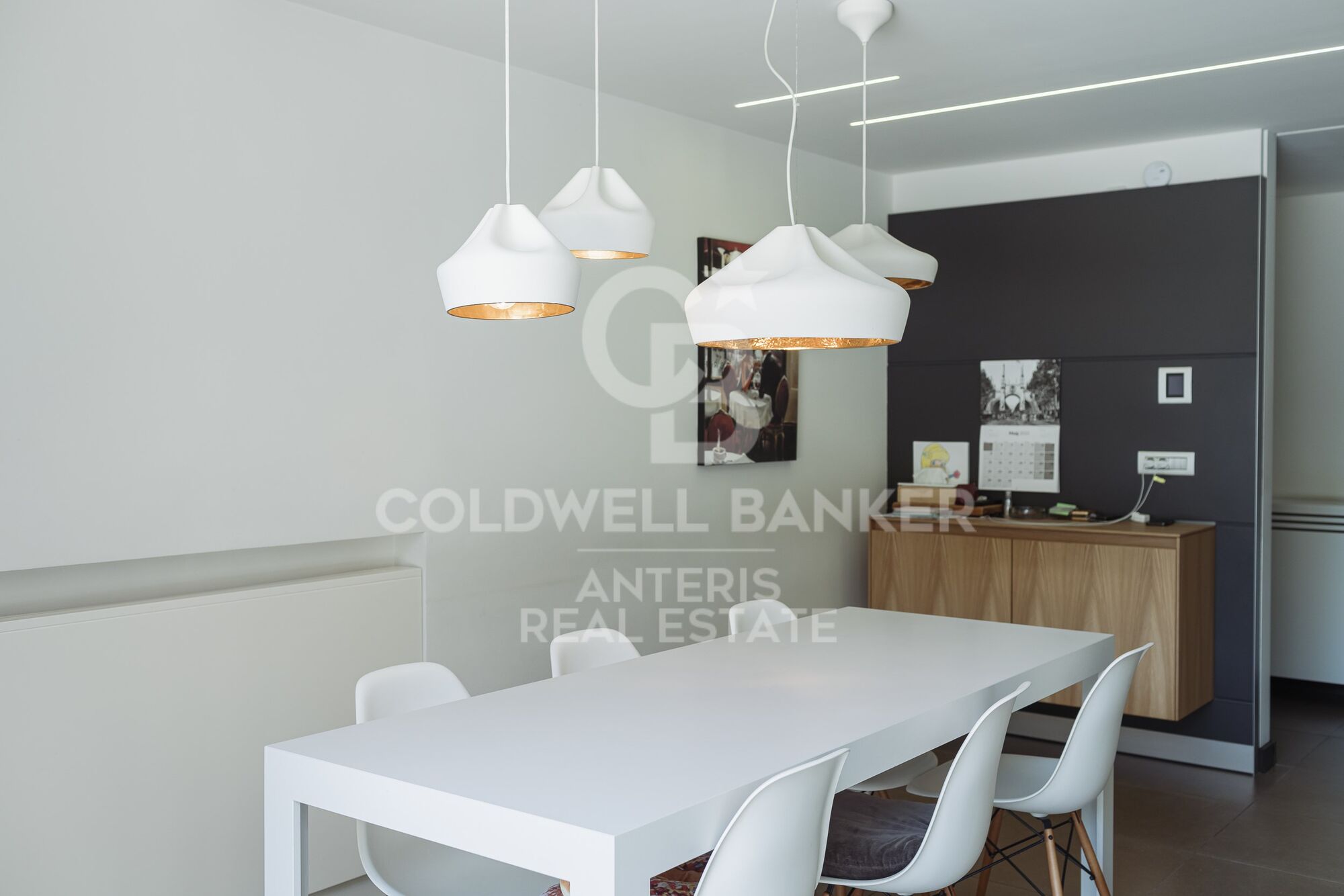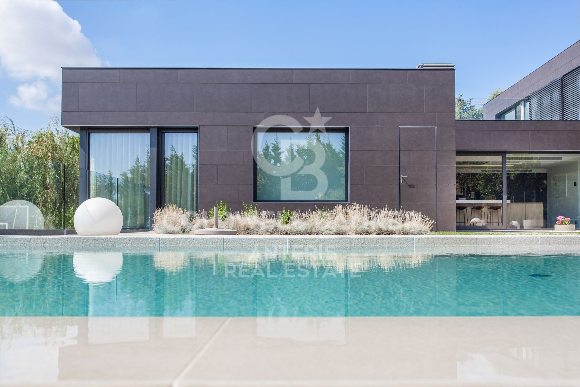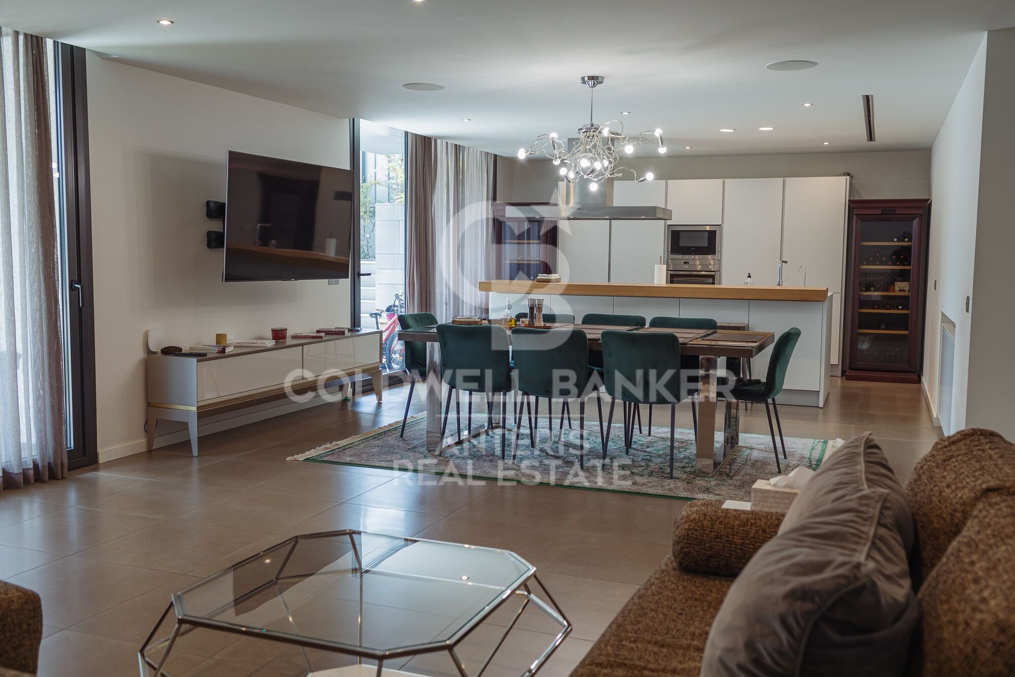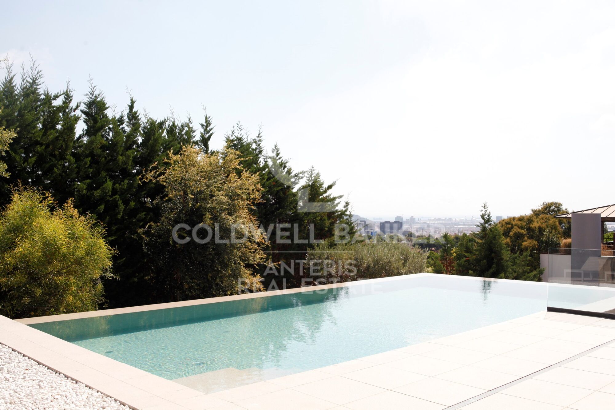 On the first floor, an imposing double-height living-dining room with gas fireplace creates a cozy and elegant atmosphere. The kitchen with island, with direct access to the infinity pool, is a perfect place for culinary creativity. The night area, separated from the day area ensuring comfort and privacy, offers three double bedrooms en suite, a playroom with bathroom and the master suite with dressing room and Jacuzzi, with direct access to the pool and large windows overlooking Barcelona.
