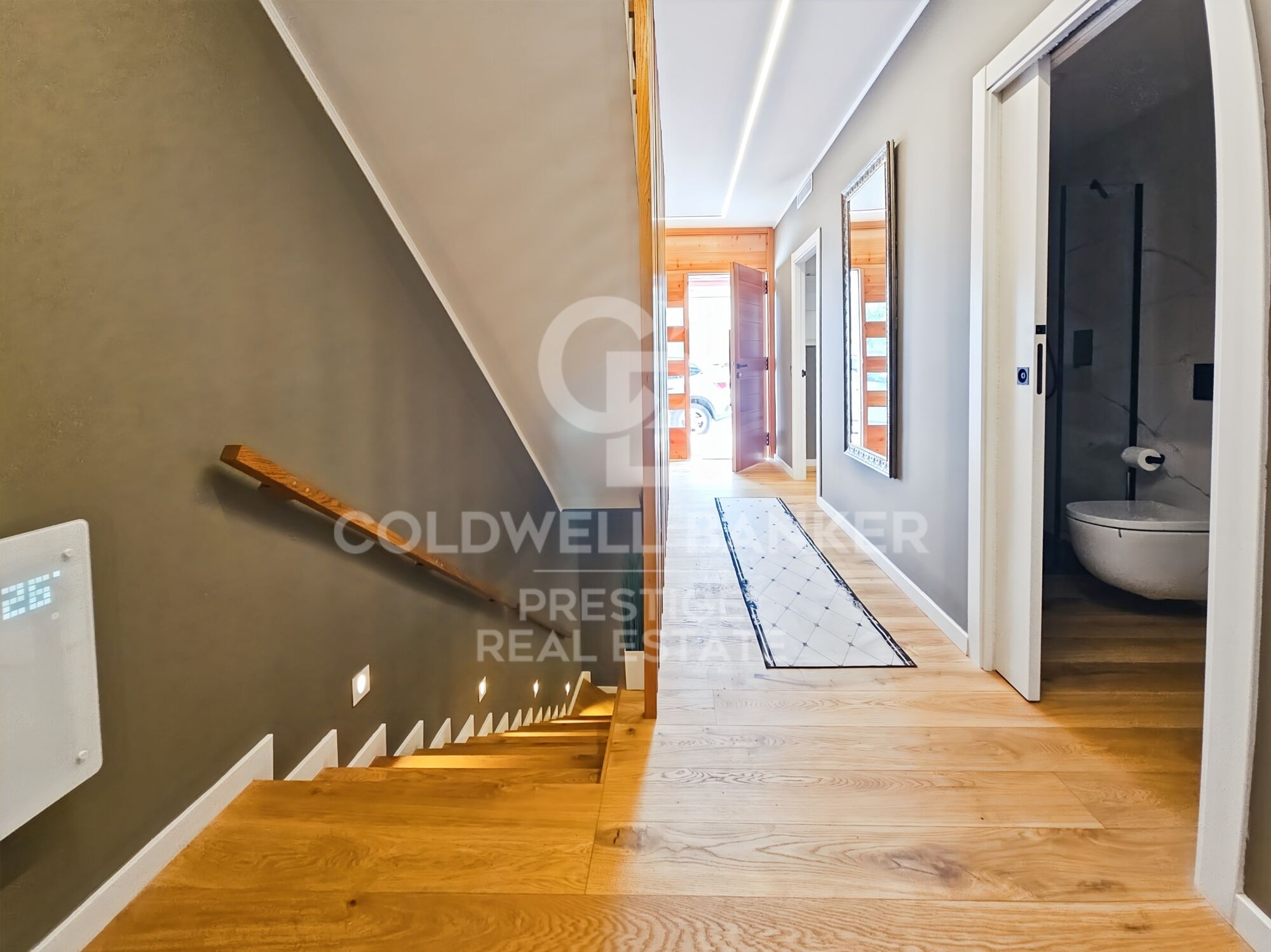 Natural wood floating parquet flooring (porcelain stoneware in garage and terraces)
